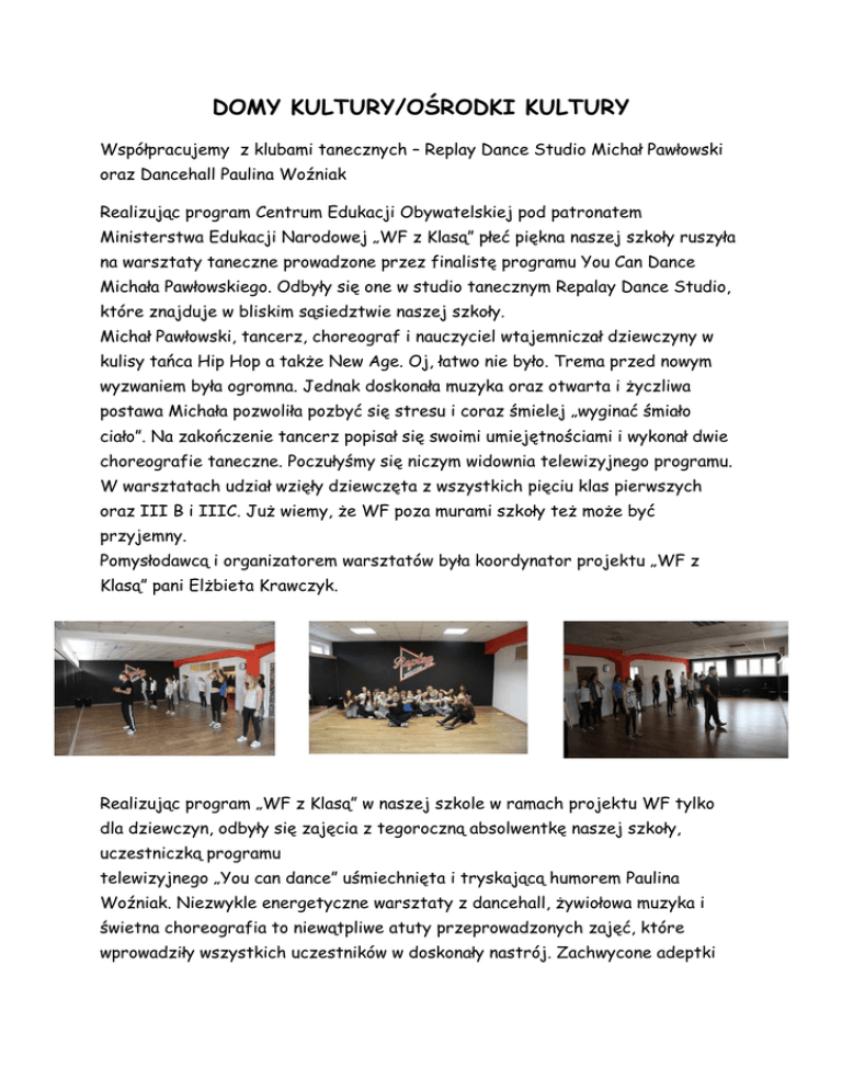 DOMY KULTURY/OŚRODKI KULTURY Współpracujemy z klubami tanecznych – Replay Dance Studio Michał Pawłowski oraz Dancehall Paulina Woźniak Realizując program Centrum Edukacji Obywatelskiej pod patronatem Ministerstwa Edukacji Narodowej „WF z Klasą” płeć piękna naszej szkoły ruszyła na warsztaty taneczne prowadzone przez finalistę programu You Can Dance Michała Pawłowskiego. Odbyły się one w studio tanecznym Repalay Dance Studio, które znajduje w bliskim sąsiedztwie naszej szkoły. Michał Pawłowski, tancerz, choreograf i nauczyciel wtajemniczał dziewczyny w kulisy tańca Hip Hop a także New Age. Oj, łatwo nie było. Trema przed nowym wyzwaniem była ogromna. Jednak doskonała muzyka oraz otwarta i życzliwa postawa Michała pozwoliła pozbyć się stresu i coraz śmielej „wyginać śmiało ciało”. Na zakończenie tancerz popisał się swoimi umiejętnościami i wykonał dwie choreografie taneczne. Poczułyśmy się niczym widownia telewizyjnego programu. W warsztatach udział wzięły dziewczęta z wszystkich pięciu klas pierwszych oraz III B i IIIC. Już wiemy, że WF poza murami szkoły też może być przyjemny. Pomysłodawcą i organizatorem warsztatów była koordynator projektu „WF z Klasą” pani Elżbieta Krawczyk. Realizując program „WF z Klasą” w naszej szkole w ramach projektu WF tylko dla dziewczyn, odbyły się zajęcia z tegoroczną absolwentkę naszej szkoły, uczestniczką programu telewizyjnego „You can dance” uśmiechnięta i tryskającą humorem Paulina Woźniak. Niezwykle energetyczne warsztaty z dancehall, żywiołowa muzyka i świetna choreografia to niewątpliwe atuty przeprowadzonych zajęć, które wprowadziły wszystkich uczestników w doskonały nastrój. Zachwycone adeptki sztuki tańca, nie zamierzają spocząć na laurach, a Paulina obiecała kolejną „edycje”.