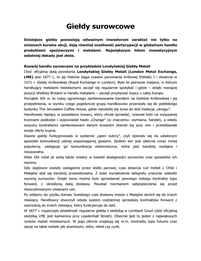 Giełdy surowcowe Dzisiejsze giełdy pozwalają odważnym inwestorom zarabiać nie tylko na zmianach kursów akcji, dają również możliwość partycypacji w globalnym handlu produktami spożywczymi i metalami. Największym hitem inwestycyjnym ostatniej dekady jest złoto. Rozwój handlu surowcami na przykładzie Londyńskiej Giełdy Metali Choć oficjalną datą powstania Londyńskiej Giełdy Metali (London Metal Exchange, LME) jest 1877 r., to jej historia sięga czasów panowania królowej Elżbiety I i otwarcia w 1571 r. Giełdy Królewskiej (Royal Exchange in London). Było to pierwsze miejsce, w którym handlujący metalami nieżelaznymi zaczęli się regularnie spotykać i gdzie – dzięki rosnącej pozycji Wielkiej Brytanii w handlu metalami – zaczęli przybywać kupcy z całej Europy. Początek XIX w. to czasy ogromnego zainteresowania handlem na Giełdzie Królewskiej i jej przepełnienia, w wyniku czego pojedyncze grupy handlowców przeniosły się do pobliskiego budynku The Jerusalem Coffee House, gdzie narodziła się żywa do dziś tradycja „okręgu”. Handlowiec będący w posiadaniu towaru, który chciał sprzedać, rysował koło na wysypanej trocinami podłodze i wypowiadał hasło „Change” (w znaczeniu: wymiana, handel), a wtedy wszyscy kontrahenci zainteresowani danym towarem zbierali się przy nim i przedstawiali swoje oferty kupna. Dawne giełdy funkcjonowały w systemie „open outcry”, czyli opierały się na ustalonym sposobie komunikacji ustnej wspomaganej gestami. System ten jest obecnie coraz mniej popularny, zastępuje go komunikacja elektroniczna, która jest bardziej wydajna i niezawodna. Wiek XIX niósł ze sobą także zmiany w kwestii dostępności surowców oraz sposobów ich wyceny. Gdy żaglowce zostały zastąpione przez statki parowe, czas dotarcia rud metali z Chile i Malajów stał się bardziej przewidywalny. Z kolei wynalezienie telegrafu znacznie ułatwiło wycenę surowców. Dzięki temu można było sprzedawać pewnego rodzaju kontrakty typu forward, z określoną datą dostawy. Powstał mechanizm zabezpieczenia się przed nieoczekiwanymi zmianami cen. Po oddaniu do użytku Kanału Sueskiego czas dostawy miedzi z Malajów skrócił się do trzech miesięcy. Handlowcy stworzyli wtedy system codziennej sprzedaży kontraktów forward z ważnością do trzech miesięcy, który funkcjonuje do dziś. W 1877 r. rozpoczęła działalność regularna giełda z siedzibą w Lombard Court (dziś oficjalną siedzibą LME jest kamienica przy Leadenhall Street). Obecnie jest to jeden z największych rynków metali nieżelaznych. W jego ofercie znajdują się m.in. kontrakty typu futures oraz opcje na takie metale jak aluminium, ołów, nikiel czy cynk. Integracja giełd na przykładzie London International Financial Futures and Options Exchange (NYSE LIFFE) Giełda została założona przez sir Briana Williamsona we wrześniu 1982 r. Początkowo oferowała możliwość handlu kontraktami i opcjami na stopy procentowe. W 1993 r. połączyła się z London Traded Option Market (LTOM), dodając do swojej oferty opcje na akcje, i przyjęła nazwę LIFFE. W 1996 r., po połączeniu z London Commodity Exchange (LCE), w ofercie giełdy pojawiły się kontrakty na towary. W początkowym okresie handel na LIFFE prowadzony był w systemie „open outcry”. Jednakże po odnotowaniu poważnych strat przez właścicieli (ponad 60 mln funtów) w 1998 r. zdecydowano się na wprowadzenie platformy internetowej do handlu (LIFFE Connect). W 2002 r. giełda ta została przejęta przez Euronext i znalazła się w jednej grupie z giełdami w Amsterdamie, Brukseli, Paryżu i Lizbonie. Zasady handlu surowcami na przykładzie metali Kontrakty forward dostępne na London Metal Exchange pozwalają konsumentom i handlowcom zabezpieczyć się przed ryzykiem cenowym. Handel prowadzony jest w „porcjach” (ang. lots), przy czym każda „porcja” aluminium, miedzi i cynku równa się 25 t (nikiel – jedna „porcja” to 6 t, cyna – 5 t, stop aluminium – 20 t, kobalt – 1 t, molibden – 6 t). Dodatkowo LME oferuje kontrakty LMEmini, które są mniejszymi odpowiednikami zwykłych kontraktów na aluminium, cynk czy miedź. Główną walutą kwotowań na LME jest dolar amerykański, jednak dopuszczalne jest zawieranie kontraktów w funtach szterlingach, jenach oraz euro (na bieżąco podawany jest kurs wymiany na dolara amerykańskiego). By mieć możliwość handlu na giełdzie LME, konieczne jest uzyskanie statusu członkowskiego, dzięki czemu kontrahenci zdobywają pewność, że handlują z profesjonalnymi firmami. Nadzór nad rynkiem prowadzony jest przez samą giełdę, jej członków nadzoruje zaś Brytyjska Komisja Nadzoru Finansowego. Handel odbywa się poprzez trzy kanały: telefoniczny (dostępny 24 godziny na dobę), elektroniczny (LME select, od 1:00 do 19:00 czasu londyńskiego), ring trading (od 11:40 do 17:00 czasu londyńskiego). Wycena instrumentów dostępnych na LME odbywa się na trzy sposoby: oficjalny, nieoficjalny i według cen zamknięcia. W większości bazują one na transakcjach zawartych w ramach ring trading. Obrót artykułami spożywczymi na przykładzie kakao NYSE LIFFE oferuje dużą gamę kontraktów i akcji na produkty rolne, m.in. kakao, kawę, cukier, pszenicę i kukurydzę. Kontrakty te stanowią efektywny sposób zabezpieczenia się przed ryzykiem zmiany ceny i niestabilnością. Kontrakty na kakao oficjalnie zostały wprowadzone w 1928 r. Konstrukcja kontraktów ewoluowała przez wiele lat, by zapewnić uczestnikom rynku możliwość efektywnego zabezpieczenia swoich interesów. Opcje na kakao wprowadzono w 1987 r. Wolumen kontraktów i opcji na kakao stanowi aż siedmiokrotność globalnej produkcji tego surowca. Poprzez platformę internetową ww. instrumenty finansowe dostępne są od 27 listopada 2000 r. Głównymi kontrahentami na rynku są producenci czekolady, inwestorzy instytucjonalni, fundusze. Wyceny kontraktów 