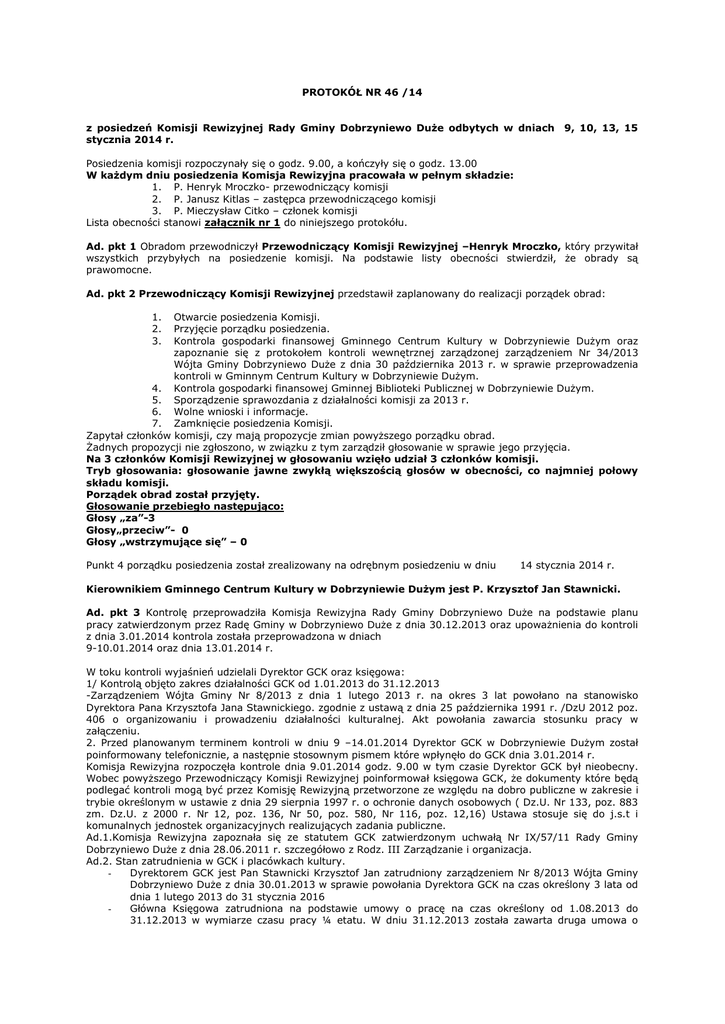 PROTOKÓŁ NR 46 /14 z posiedzeń Komisji Rewizyjnej Rady Gminy Dobrzyniewo Duże odbytych w dniach stycznia 2014 r. 9, 10, 13, 15 Posiedzenia komisji rozpoczynały się o godz. 9.00, a kończyły się o godz. 13.00 W każdym dniu posiedzenia Komisja Rewizyjna pracowała w pełnym składzie: 1. P. Henryk Mroczko- przewodniczący komisji 2. P. Janusz Kitlas – zastępca przewodniczącego komisji 3. P. Mieczysław Citko – członek komisji Lista obecności stanowi załącznik nr 1 do niniejszego protokółu. Ad. pkt 1 Obradom przewodniczył Przewodniczący Komisji Rewizyjnej –Henryk Mroczko, który przywitał wszystkich przybyłych na posiedzenie komisji. Na podstawie listy obecności stwierdził, że obrady są prawomocne. Ad. pkt 2 Przewodniczący Komisji Rewizyjnej przedstawił zaplanowany do realizacji porządek obrad: 1. 2. 3. Otwarcie posiedzenia Komisji. Przyjęcie porządku posiedzenia. Kontrola gospodarki finansowej Gminnego Centrum Kultury w Dobrzyniewie Dużym oraz zapoznanie się z protokołem kontroli wewnętrznej zarządzonej zarządzeniem Nr 34/2013 Wójta Gminy Dobrzyniewo Duże z dnia 30 października 2013 r. w sprawie przeprowadzenia kontroli w Gminnym Centrum Kultury w Dobrzyniewie Dużym. 4. Kontrola gospodarki finansowej Gminnej Biblioteki Publicznej w Dobrzyniewie Dużym. 5. Sporządzenie sprawozdania z działalności komisji za 2013 r. 6. Wolne wnioski i informacje. 7. Zamknięcie posiedzenia Komisji. Zapytał członków komisji, czy mają propozycje zmian powyższego porządku obrad. Żadnych propozycji nie zgłoszono, w związku z tym zarządził głosowanie w sprawie jego przyjęcia. Na 3 członków Komisji Rewizyjnej w głosowaniu wzięło udział 3 członków komisji. Tryb głosowania: głosowanie jawne zwykłą większością głosów w obecności, co najmniej połowy składu komisji. Porządek obrad został przyjęty. Głosowanie przebiegło następująco: Głosy „za”-3 Głosy„przeciw”- 0 Głosy „wstrzymujące się” – 0 Punkt 4 porządku posiedzenia został zrealizowany na odrębnym posiedzeniu w dniu 14 stycznia 2014 r. Kierownikiem Gminnego Centrum Kultury w Dobrzyniewie Dużym jest P. Krzysztof Jan Stawnicki. Ad. pkt 3 Kontrolę przeprowadziła Komisja Rewizyjna Rady Gminy Dobrzyniewo Duże na podstawie planu pracy zatwierdzonym przez Radę Gminy w Dobrzyniewo Duże z dnia 30.12.2013 oraz upoważnienia do kontroli z dnia 3.01.2014 kontrola została przeprowadzona w dniach 9-10.01.2014 oraz dnia 13.01.2014 r. W toku kontroli wyjaśnień udzielali Dyrektor GCK oraz księgowa: 1/ Kontrolą objęto zakres działalności GCK od 1.01.2013 do 31.12.2013 -Zarządzeniem Wójta Gminy Nr 8/2013 z dnia 1 lutego 2013 r. na okres 3 lat powołano na stanowisko Dyrektora Pana Krzysztofa Jana Stawnickiego. zgodnie z ustawą z dnia 25 października 1991 r. /DzU 2012 poz. 406 o organizowaniu i prowadzeniu działalności kulturalnej. Akt powołania zawarcia stosunku pracy w załączeniu. 2. Przed planowanym terminem kontroli w dniu 9 –14.01.2014 Dyrektor GCK w Dobrzyniewie Dużym został poinformowany telefonicznie, a następnie stosownym pismem które wpłynęło do GCK dnia 3.01.2014 r. Komisja Rewizyjna rozpoczęła kontrole dnia 9.01.2014 godz. 9.00 w tym czasie Dyrektor GCK był nieobecny. Wobec powyższego Przewodniczący Komisji Rewizyjnej poinformował księgowa GCK, że dokumenty które będą podlegać kontroli mogą być przez Komisję Rewizyjną przetworzone ze względu na dobro publiczne w zakresie i trybie określonym w ustawie z dnia 29 sierpnia 1997 r. o ochronie danych osobowych ( Dz.U. Nr 133, poz. 883 zm. Dz.U. z 2000 r. Nr 12, poz. 136, Nr 50, poz. 580, Nr 116, poz. 12,16) Ustawa stosuje się do j.s.t i komunalnych jednostek organizacyjnych realizujących zadania publiczne. Ad.1.Komisja Rewizyjna zapoznała się ze statutem GCK zatwierdzonym uchwałą Nr IX/57/11 Rady Gminy Dobrzyniewo Duże z dnia 28.06.2011 r. szczegółowo z Rodz. III Zarządzanie i organizacja. Ad.2. Stan zatrudnienia w GCK i placówkach kultury. Dyrektorem GCK jest Pan Stawnicki Krzysztof Jan zatrudniony zarządzeniem Nr 8/2013 Wójta Gminy Dobrzyniewo Duże z dnia 30.01.2013 w sprawie powołania Dyrektora GCK na czas określony 3 lata od dnia 1 lutego 2013 do 31 stycznia 2016 Główna Księgowa zatrudniona na podstawie umowy o pracę na czas określony od 1.08.2013 do 31.12.2013 w wymiarze czasu pracy ¼ etatu. W dniu 31.12.2013 została zawarta druga umowa o - pracę na czas określony od 1.01.2014 do 31.12.2014 w wymiarze ½ etatu wynagrodzenie zasadnicze, dodatek funkcyjny w wysokości 50% wynagrodzenia zasadniczego, premia uznaniowa. Komisja Rewizyjna zwróciła uwagę księgowej ze akt jej zatrudnienia nie potwierdziła swym podpisem i datą otrzymania. W trakcie kontroli powyższa uwaga została uzupełniona podpisem Pani Księgowej. stanowisko asystentka – zatrudniona z dniem 2.12.2013 do 30.06.2014 wykształcenie wyższe licencjat-logistyki wynagrodzenie zasadnicze dodatek specjalny w wysokości 30% wynagrodzenia zasadniczego za pracę jako animator kultury w świetlicy w Ponikłej po godzinach pracy w GCK. Premia uznaniowa. Komisja Rewizyjna poprosiła o złożenie pisemnego oświadczenia, w jakim zakresie jest wykonywana jej praca w świetlicy w Ponikłej/oświadczenie jako załącznik/ Powiatowy Urząd Pracy w Białymstoku skierował skierowanie nr 1 do odbycia stażu u organizatora tj. GCK w Dobrzyniewie Dużym stażu na stanowisku asystenta w centrum kultury z terminem 10.06.2013 r.. Zatrudnienie na okres stażu jest finansowane przez PUP Białystok ze środków Unii Europejskiej. Przed skierowaniem asystentki na staż została zawarta przedwstępna umowa o pracę w dniu 29.05.2013 r. pomiędzy Dyrektorem GCK a stażystka. Umowa Nr 160/1/ST/EFS613/2013 o odbywaniu stażu zawarta w dniu 4 czerwca 2013 pomiędzy Starosta powiatu Białostockiego w imieniu którego działa Powiatowy Urząd Pracy a Dyrektorem GCK na stanowisko asystenta zatrudnienie na st