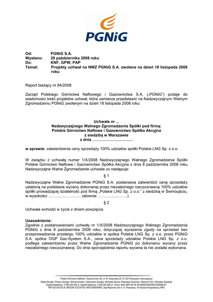 Od: Wysłano: Do: Temat: PGNiG S.A. 28 października 2008 roku KNF, GPW, PAP Projekty uchwał na NWZ PGNiG S.A. zwołane na dzień 18 listopada 2008 roku Raport bieżący nr 84/2008 Zarząd Polskiego Górnictwa Naftowego i Gazownictwa S.A. („PGNiG”) podaje do wiadomości treść projektów uchwał, które zamierza przedstawić na Nadzwyczajnym Walnym Zgromadzeniu PGNiG zwołanym na dzień 18 listopada 2008 roku: Uchwała nr ... Nadzwyczajnego Walnego Zgromadzenia Spółki pod firmą: Polskie Górnictwo Naftowe i Gazownictwo Spółka Akcyjna z siedzibą w Warszawie z dnia …………………………. w sprawie: zatwierdzenia ceny sprzedaży 100% udziałów spółki Polskie LNG Sp. z o.o. W związku z uchwałą numer 1/X/2008 Nadzwyczajnego Walnego Zgromadzenia Spółki Polskie Górnictwo Naftowe i Gazownictwo Spółka Akcyjna z dnia 8 października 2008 roku Nadzwyczajne Walne Zgromadzenie uchwala co następuje: §1 Nadzwyczajne Walne Zgromadzenie PGNiG S.A. postanawia zatwierdzić cenę sprzedaży ustaloną na podstawie wyceny dokonanej przez niezależnego rzeczoznawcę 100% udziałów spółki prowadzącej działalność pod firmą „Polskie LNG Sp. z o.o.” z siedzibą w Świnoujściu, w wysokości ……………………. (słownie: ………………….). §2 Uchwała wchodzi w życie z dniem powzięcia. Uzasadnienie: Zgodnie z postanowieniami uchwały nr 1/X/2008 Nadzwyczajnego Walnego Zgromadzenia PGNiG z dnia 8 października 2008 roku, dotyczącej wyrażenia zgody na sprzedaż bez przeprowadzenia przetargu 100% udziałów w spółce Polskie LNG Sp. z o.o. przez PGNiG S.A. spółce OGP Gaz-System S.A., cena sprzedaży udziałów Polskie LNG Sp. z o.o. podlega zatwierdzeniu przez Walne Zgromadzenie PGNiG po dokonaniu wyceny przez niezależnego rzeczoznawcę. Do dnia sporządzenia raportu wycena ta nie została wykonana. Polskie Górnictwo Naftowe i Gazownictwo SA, ul. M. Kasprzaka 25, 01-224 Warszawa, www.pgnig.pl Skład Zarządu: Prezes Zarządu: Michał Szubski, Członkowie Zarządu: Mirosław Dobrut, Radosław Dudziński, Sławomir Hinc, Mirosław Szkałuba Kapitał Zakładowy: 5 900 000 000 zł, Kapitał Wpłacony: 5 900 000 000 zł, Konto: Bank BPH SA Nr 29106000760000401050006167 NIP 525 000 80 28, REGON 012216736, KRS 0000059492, Sąd Rejonowy dla m. st. Warszawy, XII Wydział Gospodarczy KRS Uchwała nr ... Nadzwyczajnego Walnego Zgromadzenia Spółki pod firmą: Polskie Górnictwo Naftowe i Gazownictwo Spółka Akcyjna z siedzibą w Warszawie z dnia …………………………. w sprawie: zgody na obniżenie ceny sprzedaży nieruchomości w Lwówku Śląskim §1 Nadzwyczajne Walne Zgromadzenie Polskiego Górnictwa Naftowego i Gazownictwa S.A. w Warszawie, działając na podstawie art. 19 ust. 3 w związku z art. 19 ust. 2 ustawy z dnia 30 sierpnia 1996 r. o komercjalizacji i prywatyzacji (tj. Dz. U. z 2002 r. nr 171 poz. 1397 ze zm.), postanawia: wyrazić zgodę na sprzedaż prawa użytkowania wieczystego nieruchomości gruntowej położonej w Lwówku Śląskim przy ulicy Kamiennej 2, woj. dolnośląskie, oznaczonej ewidencyjnie jako działka nr 435, AM 6, Obręb 0002-Lwówek 2, o pow. 0,1500 ha, wraz z prawem własności znajdującego się na tej działce budynku biurowo-usługowo-technicznego o pow. 140,51 m2, masztu trunkingowego oraz innych budowli i urządzeń, dla której Sąd Rejonowy w Lwówku Śląskim V Wydział Ksiąg Wieczystych prowadzi księgę wieczystą nr 16678, za cenę nie niższą niż 2/3 ceny wywoławczej, tj. za cenę nie niższą niż 120.000,00 zł (słownie: sto dwadzieścia tysięcy złotych) netto. §2 Uchwała wchodzi w życie z dniem powzięcia. Uzasadnienie: Przedmiotowa nieruchomość stanowi majątek nieprodukcyjny PGNiG S.A. Obecnie nieruchomość nie przynosi przychodów. Do końca 2007 r. nieruchomość była przedmiotem najmu, a suma uzyskanych przychodów z tego tytułu wyniosła w 2007 r. 11.594,81 zł netto. Koszty utrzymania nieruchomości w roku 2007 wyniosły 100.638,24 zł. W bieżącym roku (do końca kwietnia) koszty utrzymania nieruchomości wyniosły 4.165,87 zł netto. Wartość rynkowa nieruchomości, ustalona przez rzeczoznawcę majątkowego, według aktualnego operatu szacunkowego sporządzonego w dniu 11 stycznia 2008 r., wynosi 172.100,00 złotych. Wartość księgowa wszystkich składników wchodzących w skład nieruchomości wg stanu na dzień 30.04.2008 r. wynosi w sumie 111.275,27 zł. W dniu 20 czerwca 2008 r. Zarząd Spółki podjął Uchwałę Nr 351/2008 w sprawie sprzedaży przedmiotowej nieruchomości za cenę wywoławczą nie niższą niż 179.000,00 zł. W wykonaniu powyższej uchwały Departament Majątku Centrali Spółki ogłosił i przeprowadził w dniu 19 sierpnia 2008 r. przetarg ustny na sprzedaż przedmiotowej nieruchomości. Do przetargu nie stanął żaden oferent. Był to drugi przetarg na sprzedaż przedmiotowej nieruchomości. Pierwszy przetarg, do którego również nie przystąpił żaden oferent, odbył się 23 kwietnia 2008 r. Mając na uwadze działania Departamentu Majątku podjęte w celu jak najszerszego rozpowszechnienia informacji o przeznaczeniu nieruchomości do sprzedaży, realną szansę zbycia nieruchomości po cenie ustalonej na podstawie wartości rynkowej określonej przez rzeczoznawcę majątkowego należy ocenić jako znikomą. Polskie Górnictwo Naftowe i Gazownictwo SA, ul. M. Kasprzaka 25, 01-224 Warszawa, www.pgnig.pl Skład Zarządu: Prezes Zarządu: Michał Szubski, Członkowie Zarządu: Mirosław Dobrut, Radosław Dudziński, Sławomir Hinc, Mirosław Szkałuba Kapitał Zakładowy: 5 900 000 000 zł, Kapitał Wpłacony: 5 900 000 000 zł, Konto: Bank BPH SA Nr 29106000760000401050006167 NIP 525 000 80 28, REGON 012216736, KRS 0000059492, Sąd Rejonowy dla m. st. Warszawy, XII Wydział Gospodarczy KRS Uchwała nr ... Nadzwyczajnego Walnego Zgromadzenia Spółki pod firmą: Polskie Górnictwo Naftowe i Gazownictwo Spółka Akcyjna z siedzibą w Warszawie z 