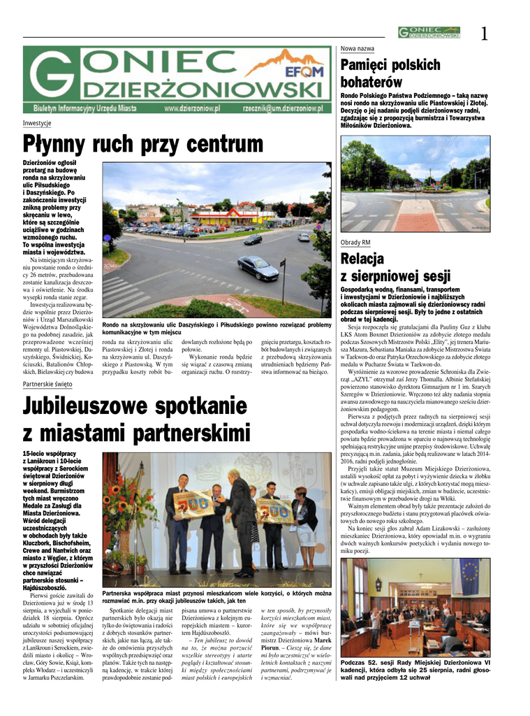 Nowa nazwa 1 Pamięci polskich bohaterów Inwestycje Płynny ruch przy centrum Dzierżoniów ogłosił przetarg na budowę ronda na skrzyżowaniu ulic Piłsudskiego i Daszyńskiego. Po zakończeniu inwestycji znikną problemy przy skręcaniu w lewo, które są szczególnie uciążliwe w godzinach wzmożonego ruchu. To wspólna inwestycja miasta i województwa. Na istniejącym skrzyżowaniu powstanie rondo o średnicy 26 metrów, przebudowana zostanie kanalizacja deszczowa i oświetlenie. Na środku wysepki ronda stanie zegar. Inwestycja realizowana będzie wspólnie przez Dzierżoniów i Urząd Marszałkowski Województwa Dolnośląskiego na podobnej zasadzie, jak przeprowadzone wcześniej remonty ul. Piastowskiej, Daszyńskiego, Świdnickiej, Kościuszki, Batalionów Chłopskich, Bielawskiej czy budowa Obrady RM Relacja z sierpniowej sesji Rondo na skrzyżowaniu ulic Daszyńskiego i Piłsudskiego powinno rozwiązać problemy komunikacyjne w tym miejscu ronda na skrzyżowaniu ulic dowlanych rozłożone będą po gnięciu przetargu, kosztach roPiastowskiej i Złotej i ronda połowie. bót budowlanych i związanych na skrzyżowaniu ul. DaszyńWykonanie ronda będzie z przebudową skrzyżowania skiego z Piastowską. W tym się wiązać z czasową zmianą utrudnieniach będziemy Pańprzypadku koszty robót bu- organizacji ruchu. O rozstrzy- stwa informować na bieżąco. Partnerskie święto Jubileuszowe spotkanie z miastami partnerskimi 15-lecie współpracy z Lanškroun i 10-lecie współpracy z Serockiem świętował Dzierżoniów w sierpniowy długi weekend. Burmistrzom tych miast wręczono Medale za Zasługi dla Miasta Dzierżoniowa. Wśród delegacji uczestniczących w obchodach były także Kluczbork, Bischofsheim, Crewe and Nantwich oraz miasto z Węgier, z którym w przyszłości Dzierżoniów chce nawiązać partnerskie stosunki – Hajdúszoboszló. Pierwsi goście zawitali do Dzierżoniowa już w środę 13 sierpnia, a wyjechali w poniedziałek 18 sierpnia. Oprócz udziału w sobotniej oficjalnej uroczystości podsumowującej jubileusze naszej współpracy z Lanškroun i Serockiem, zwiedzili miasto i okolicę – Wrocław, Góry Sowie, Książ, kompleks Włodarz – i uczestniczyli w Jarmarku Pszczelarskim. Rondo Polskiego Państwa Podziemnego – taką nazwę nosi rondo na skrzyżowaniu ulic Piastowskiej i Złotej. Decyzję o jej nadaniu podjęli dzierżoniowscy radni, zgadzając się z propozycją burmistrza i Towarzystwa Miłośników Dzierżoniowa. Partnerska współpraca miast przynosi mieszkańcom wiele rozmawiać m.in. przy okazji jubileuszów takich, jak ten Spotkanie delegacji miast pisana umowa o partnerstwie partnerskich było okazją nie Dzierżoniowa z kolejnym eutylko do świętowania i radości ropejskich miastem – kurorz dobrych stosunków partner- tem Hajdúszoboszló. skich, jakie nas łączą, ale tak– Ten jubileusz to dowód że do omówienia przyszłych na to, że można porzucić wspólnych przedsięwzięć oraz wszelkie stereotypy i utarte planów. Także tych na następ- poglądy i kształtować stosunną kadencję, w trakcie której ki między społecznościami prawdopodobnie zostanie pod- miast polskich i europejskich Gospodarką wodną, finansami, transportem i inwestycjami w Dzierżoniowie i najbliższych okolicach miasta zajmowali się dzierżoniowscy radni podczas sierpniowej sesji. Były to jedne z ostatnich obrad w tej kadencji. Sesja rozpoczęła się gratulacjami dla Pauliny Guz z klubu LKS Atom Boxmet Dzierżoniów za zdobycie złotego medalu podczas Szosowych Mistrzostw Polski „Elity”, jej trenera Mariusza Mazura, Sebastiana Maniaka za zdobycie Mistrzostwa Świata w Taekwon-do oraz Patryka Orzechowskiego za zdobycie złotego medalu w Pucharze Świata w Taekwon-do. Wyróżnienie za wzorowe prowadzenie Schroniska dla Zwierząt „AZYL” otrzymał zaś Jerzy Thomalla. Albinie Stefańskiej powierzono stanowisko dyrektora Gimnazjum nr 1 im. Szarych Szeregów w Dzierżoniowie. Wręczono też akty nadania stopnia awansu zawodowego na nauczyciela mianowanego sześciu dzierżoniowskim pedagogom. Pierwsza z podjętych przez radnych na sierpniowej sesji uchwał dotyczyła rozwoju i modernizacji urządzeń, dzięki którym gospodarka wodno-ściekowa na terenie miasta i niemal całego powiatu będzie prowadzona w oparciu o najnowszą technologię spełniającą restrykcyjne unijne przepisy środowiskowe. Uchwałę precyzującą m.in. zadania, jakie będą realizowane w latach 20142016, radni podjęli jednogłośnie. Przyjęli także statut Muzeum Miejskiego Dzierżoniowa, ustalili wysokość opłat za pobyt i wyżywienie dziecka w żłobku (w uchwale zapisano także ulgi, z których korzystać mogą mieszkańcy), emisji obligacji miejskich, zmian w budżecie, uczestnictwie finansowym w przebudowie drogi na Włóki. Ważnym elementem obrad były także prezentacje założeń do przyszłorocznego budżetu i stanu przygotowań placówek oświatowych do nowego roku szkolnego. Na koniec sesji głos zabrał Adam Lizakowski – zasłużony mieszkaniec Dzierżoniowa, który opowiadał m.in. o wygraniu dwóch ważnych konkursów poetyckich i wydaniu nowego tomiku poezji. korzyści, o których można w ten sposób, by przynosiły korzyści mieszkańcom miast, które się we współpracę zaangażowały – mówi burmistrz Dzierżoniowa Marek Piorun. – Cieszę się, że dane mi było uczestniczyć w wieloletnich kontaktach z naszymi partnerami, podtrzymywać je i wzmacniać. Podczas 52. sesji Rady Miejskiej Dzierżoniowa VI kadencji, która odbyła się 25 sierpnia, radni głosowali nad przyjęciem 12 uchwał 2 Mechanizm dla mieszkańców Skorzystali z inicjatywy lokalnej Mieszkańcy ulicy Świdnickiej jako jedni z pierwszych w mieście sięgnęli po mechanizm inicjatywy lokalnej. Dzięki temu mają dziś dojazd do swych domów wyłożony kostką brukową. Miasto zrealizowało inwestycję razem z nimi i pokryło prawie połowę kosztów. – To był wspania