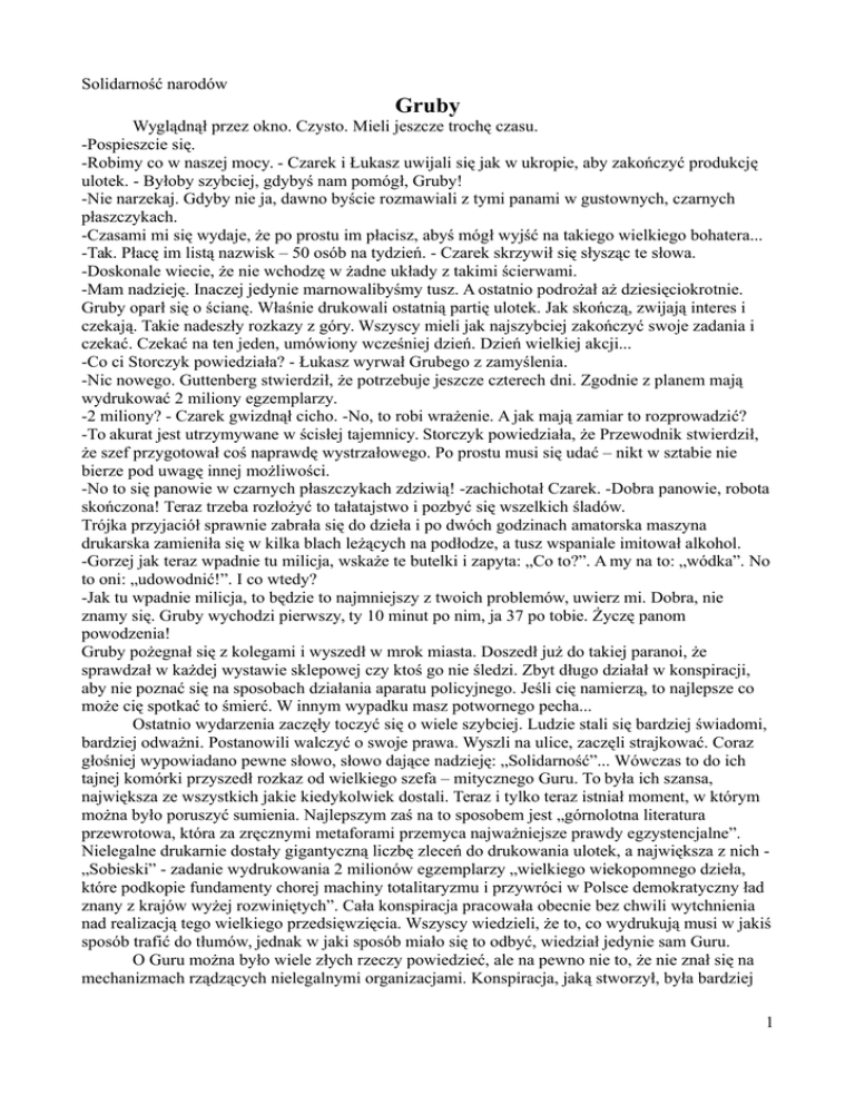 Solidarność narodów Gruby Wyglądnął przez okno. Czysto. Mieli jeszcze trochę czasu. -Pospieszcie się. -Robimy co w naszej mocy. - Czarek i Łukasz uwijali się jak w ukropie, aby zakończyć produkcję ulotek. - Byłoby szybciej, gdybyś nam pomógł, Gruby! -Nie narzekaj. Gdyby nie ja, dawno byście rozmawiali z tymi panami w gustownych, czarnych płaszczykach. -Czasami mi się wydaje, że po prostu im płacisz, abyś mógł wyjść na takiego wielkiego bohatera... -Tak. Płacę im listą nazwisk – 50 osób na tydzień. - Czarek skrzywił się słysząc te słowa. -Doskonale wiecie, że nie wchodzę w żadne układy z takimi ścierwami. -Mam nadzieję. Inaczej jedynie marnowalibyśmy tusz. A ostatnio podrożał aż dziesięciokrotnie. Gruby oparł się o ścianę. Właśnie drukowali ostatnią partię ulotek. Jak skończą, zwijają interes i czekają. Takie nadeszły rozkazy z góry. Wszyscy mieli jak najszybciej zakończyć swoje zadania i czekać. Czekać na ten jeden, umówiony wcześniej dzień. Dzień wielkiej akcji... -Co ci Storczyk powiedziała? - Łukasz wyrwał Grubego z zamyślenia. -Nic nowego. Guttenberg stwierdził, że potrzebuje jeszcze czterech dni. Zgodnie z planem mają wydrukować 2 miliony egzemplarzy. -2 miliony? - Czarek gwizdnął cicho. -No, to robi wrażenie. A jak mają zamiar to rozprowadzić? -To akurat jest utrzymywane w ścisłej tajemnicy. Storczyk powiedziała, że Przewodnik stwierdził, że szef przygotował coś naprawdę wystrzałowego. Po prostu musi się udać – nikt w sztabie nie bierze pod uwagę innej możliwości. -No to się panowie w czarnych płaszczykach zdziwią! -zachichotał Czarek. -Dobra panowie, robota skończona! Teraz trzeba rozłożyć to tałatajstwo i pozbyć się wszelkich śladów. Trójka przyjaciół sprawnie zabrała się do dzieła i po dwóch godzinach amatorska maszyna drukarska zamieniła się w kilka blach leżących na podłodze, a tusz wspaniale imitował alkohol. -Gorzej jak teraz wpadnie tu milicja, wskaże te butelki i zapyta: „Co to?”. A my na to: „wódka”. No to oni: „udowodnić!”. I co wtedy? -Jak tu wpadnie milicja, to będzie to najmniejszy z twoich problemów, uwierz mi. Dobra, nie znamy się. Gruby wychodzi pierwszy, ty 10 minut po nim, ja 37 po tobie. Życzę panom powodzenia! Gruby pożegnał się z kolegami i wyszedł w mrok miasta. Doszedł już do takiej paranoi, że sprawdzał w każdej wystawie sklepowej czy ktoś go nie śledzi. Zbyt długo działał w konspiracji, aby nie poznać się na sposobach działania aparatu policyjnego. Jeśli cię namierzą, to najlepsze co może cię spotkać to śmierć. W innym wypadku masz potwornego pecha... Ostatnio wydarzenia zaczęły toczyć się o wiele szybciej. Ludzie stali się bardziej świadomi, bardziej odważni. Postanowili walczyć o swoje prawa. Wyszli na ulice, zaczęli strajkować. Coraz głośniej wypowiadano pewne słowo, słowo dające nadzieję: „Solidarność”... Wówczas to do ich tajnej komórki przyszedł rozkaz od wielkiego szefa – mitycznego Guru. To była ich szansa, największa ze wszystkich jakie kiedykolwiek dostali. Teraz i tylko teraz istniał moment, w którym można było poruszyć sumienia. Najlepszym zaś na to sposobem jest „górnolotna literatura przewrotowa, która za zręcznymi metaforami przemyca najważniejsze prawdy egzystencjalne”. Nielegalne drukarnie dostały gigantyczną liczbę zleceń do drukowania ulotek, a największa z nich „Sobieski” - zadanie wydrukowania 2 milionów egzemplarzy „wielkiego wiekopomnego dzieła, które podkopie fundamenty chorej machiny totalitaryzmu i przywróci w Polsce demokratyczny ład znany z krajów wyżej rozwiniętych”. Cała konspiracja pracowała obecnie bez chwili wytchnienia nad realizacją tego wielkiego przedsięwzięcia. Wszyscy wiedzieli, że to, co wydrukują musi w jakiś sposób trafić do tłumów, jednak w jaki sposób miało się to odbyć, wiedział jedynie sam Guru. O Guru można było wiele złych rzeczy powiedzieć, ale na pewno nie to, że nie znał się na mechanizmach rządzących nielegalnymi organizacjami. Konspiracja, jaką stworzył, była bardziej 1 skomplikowana niźli mechanizm inwigilacji stworzony przez państwo. Gdyby ktokolwiek zechciał dostać się do człowieka, który napędzał całą machinę podziemia, zaczynając od Grubego przeszedłby do Storczyka, stamtąd do Przewodnika, od niego udałby się do Guttenberga, a on z kolei odesłałby go do Remisa. Dalej wiadome było jedynie to, że Remis podlegał jednemu z pięciu „dyrektorów firmy”, którzy to dopiero wiedzieli gdzie jest Guru, ale niekoniecznie kim jest. Tak oto funkcjonowała największa organizacja konspiracyjna od zakończenia II Wojny Światowej. Jak na razie struktura taka działała bez jakiegokolwiek zarzutu. Działała tak dobrze, że nawet jej czlonkowie byli równie niedoinformowani, jak tajna policja. Zachowując tak wielką dyskrecję, Guru był praktycznie nietykalny. Nawet gdyby „organy sprawiedliwości” wpadły na jego trop, przejście przez całą hierarchię konspiracyjną stanowiło tak niezwykle praco-, a przede wszystkim czasochłonne zadanie, że cała organizacja zdążyłaby się przenieść na nowy teren i stworzyć zupełnie nową sieć łączników. Praktycznie jedynymi osobami w całej tej wielkiej machinie, które mogły zostać wyłapane, były nędzne płotki. Nędzne płotki, takie jak Gruby... Po pół godzinie paranoicznego spaceru po ciemnym, nieprzyjaznym mieście, Gruby dotarł do swojej kamienicy. Teraz czekała go już jedynie wspinaczka na czwarte piętro. Odprężony, począł wchodzić po stromych schodach. W końcu, lekko sapiąc, stanął pod swoimi drzwiami. Szukając kluczy w kieszeni, chwycił za klamkę. Drzwi uchyliły się lekko, skrzypiąc głucho. Grubemu zjeżyły się włosy na głowie. Wiedział, że wpadł. Na lewo od siebie, kątem oka, zauważył jakiś ruch. W ostatniej chwili uchylił 