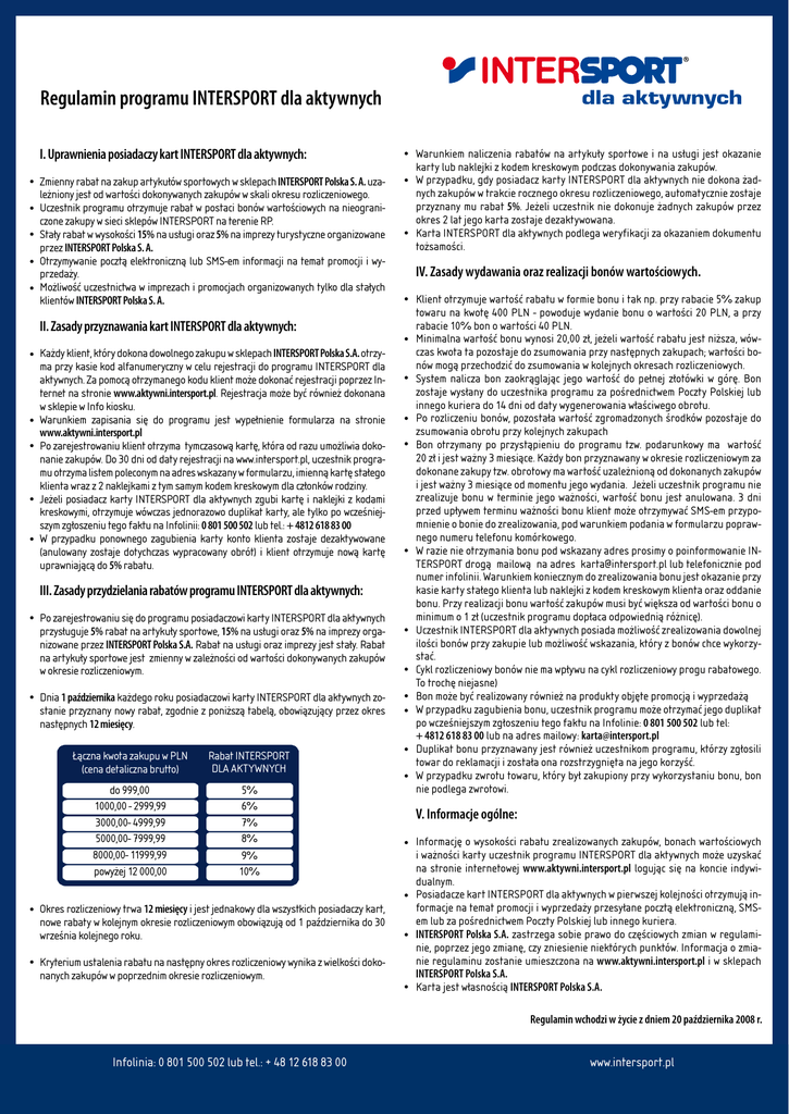 Regulamin programu INTERSPORT dla aktywnych I. Uprawnienia posiadaczy kart INTERSPORT dla aktywnych: • Zmienny rabat na zakup artykułów sportowych w sklepach INTERSPORT Polska S. A. uzależniony jest od wartości dokonywanych zakupów w skali okresu rozliczeniowego. • Uczestnik programu otrzymuje rabat w postaci bonów wartościowych na nieograniczone zakupy w sieci sklepów INTERSPORT na terenie RP. • Stały rabat w wysokości 15% na usługi oraz 5% na imprezy turystyczne organizowane przez INTERSPORT Polska S. A. • Otrzymywanie pocztą elektroniczną lub SMS-em informacji na temat promocji i wyprzedaży. • Możliwość uczestnictwa w imprezach i promocjach organizowanych tylko dla stałych klientów INTERSPORT Polska S. A. II. Zasady przyznawania kart INTERSPORT dla aktywnych: • Każdy klient, który dokona dowolnego zakupu w sklepach INTERSPORT Polska S.A. otrzyma przy kasie kod alfanumeryczny w celu rejestracji do programu INTERSPORT dla aktywnych. Za pomocą otrzymanego kodu klient może dokonać rejestracji poprzez Internet na stronie www.aktywni.intersport.pl. Rejestracja może być również dokonana w sklepie w Info kiosku. • Warunkiem zapisania się do programu jest wypełnienie formularza na stronie www.aktywni.intersport.pl • Po zarejestrowaniu klient otrzyma tymczasową kartę, która od razu umożliwia dokonanie zakupów. Do 30 dni od daty rejestracji na www.intersport.pl, uczestnik programu otrzyma listem poleconym na adres wskazany w formularzu, imienną kartę stałego klienta wraz z 2 naklejkami z tym samym kodem kreskowym dla członków rodziny. • Jeżeli posiadacz karty INTERSPORT dla aktywnych zgubi kartę i naklejki z kodami kreskowymi, otrzymuje wówczas jednorazowo duplikat karty, ale tylko po wcześniejszym zgłoszeniu tego faktu na Infolinii: 0 801 500 502 lub tel.: + 4812 618 83 00 • W przypadku ponownego zagubienia karty konto klienta zostaje dezaktywowane (anulowany zostaje dotychczas wypracowany obrót) i klient otrzymuje nową kartę uprawniającą do 5% rabatu. III. Zasady przydzielania rabatów programu INTERSPORT dla aktywnych: • Po zarejestrowaniu się do programu posiadaczowi karty INTERSPORT dla aktywnych przysługuje 5% rabat na artykuły sportowe, 15% na usługi oraz 5% na imprezy organizowane przez INTERSPORT Polska S.A. Rabat na usługi oraz imprezy jest stały. Rabat na artykuły sportowe jest zmienny w zależności od wartości dokonywanych zakupów w okresie rozliczeniowym. • Dnia 1 października każdego roku posiadaczowi karty INTERSPORT dla aktywnych zostanie przyznany nowy rabat, zgodnie z poniższą tabelą, obowiązujący przez okres następnych 12 miesięcy. Łączna kwota zakupu w PLN (cena detaliczna brutto) Rabat INTERSPORT DLA AKTYWNYCH do 999,00 1000,00 - 2999,99 3000,00- 4999,99 5000,00- 7999,99 8000,00- 11999,99 powyżej 12 000,00 5% 6% 7% 8% 9% 10% dla aktywnych • Warunkiem naliczenia rabatów na artykuły sportowe i na usługi jest okazanie karty lub naklejki z kodem kreskowym podczas dokonywania zakupów. • W przypadku, gdy posiadacz karty INTERSPORT dla aktywnych nie dokona żadnych zakupów w trakcie rocznego okresu rozliczeniowego, automatycznie zostaje przyznany mu rabat 5%. Jeżeli uczestnik nie dokonuje żadnych zakupów przez okres 2 lat jego karta zostaje dezaktywowana. • Karta INTERSPORT dla aktywnych podlega weryfikacji za okazaniem dokumentu tożsamości. IV. Zasady wydawania oraz realizacji bonów wartościowych. • Klient otrzymuje wartość rabatu w formie bonu i tak np. przy rabacie 5% zakup towaru na kwotę 400 PLN - powoduje wydanie bonu o wartości 20 PLN, a przy rabacie 10% bon o wartości 40 PLN. • Minimalna wartość bonu wynosi 20,00 zł, jeżeli wartość rabatu jest niższa, wówczas kwota ta pozostaje do zsumowania przy następnych zakupach; wartości bonów mogą przechodzić do zsumowania w kolejnych okresach rozliczeniowych. • System nalicza bon zaokrąglając jego wartość do pełnej złotówki w górę. Bon zostaje wysłany do uczestnika programu za pośrednictwem Poczty Polskiej lub innego kuriera do 14 dni od daty wygenerowania właściwego obrotu. • Po rozliczeniu bonów, pozostała wartość zgromadzonych środków pozostaje do zsumowania obrotu przy kolejnych zakupach • Bon otrzymany po przystąpieniu do programu tzw. podarunkowy ma wartość 20 zł i jest ważny 3 miesiące. Każdy bon przyznawany w okresie rozliczeniowym za dokonane zakupy tzw. obrotowy ma wartość uzależnioną od dokonanych zakupów i jest ważny 3 miesiące od momentu jego wydania. Jeżeli uczestnik programu nie zrealizuje bonu w terminie jego ważności, wartość bonu jest anulowana. 3 dni przed upływem terminu ważności bonu klient może otrzymywać SMS-em przypomnienie o bonie do zrealizowania, pod warunkiem podania w formularzu poprawnego numeru telefonu komórkowego. • W razie nie otrzymania bonu pod wskazany adres prosimy o poinformowanie INTERSPORT drogą mailową na adres [email protected] lub telefonicznie pod numer infolinii. Warunkiem koniecznym do zrealizowania bonu jest okazanie przy kasie karty stałego klienta lub naklejki z kodem kreskowym klienta oraz oddanie bonu. Przy realizacji bonu wartość zakupów musi być większa od wartości bonu o minimum o 1 zł (uczestnik programu dopłaca odpowiednią różnicę). • Uczestnik INTERSPORT dla aktywnych posiada możliwość zrealizowania dowolnej ilości bonów przy zakupie lub możliwość wskazania, który z bonów chce wykorzystać. • Cykl rozliczeniowy bonów nie ma wpływu na cykl rozliczeniowy progu rabatowego. To trochę niejasne) • Bon może być realizowany również na produkty objęte promocją i wyprzedażą • W przypadku zagubienia bonu, uczestnik programu może otrzymać jego duplikat po wcześniejszym zgłoszeniu tego faktu na Infolinie: 0 801 500 502 lub tel: + 4812 618 83 00 lub na adres mailowy: [email protected] • Duplikat bonu przyznawany jest również uczestnikom programu, którzy 