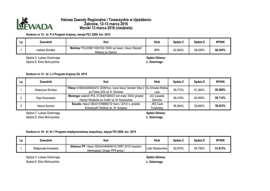 Halowe Zawody Regionalne i Towarzyskie w Ujeżdżeniu Zakrzów, 12-13 marca 2016 Wyniki 13 marca 2016 (niedziela) Konkurs nr 12 - kl. P-4 Program krajowy, wersja PZJ 2009, kor. 2015 Lp Zawodnik Koń Klub Sędzia C Sędzia E WYNIK 1 Izabela Strzałka Markiza/ POL009611000100/ 2000/ sp/ kaszt./ klacz/ Mazzel/ Milesza po Damon BPK 62,500% 58,409% 60,455% Sędzia C Sędzia E WYNIK 59,773% 61,364% 60,569% 59,318% 60,909% 60,114% 56,364% 55,682% 56,023% Sędzia C: Łukasz Dziarmaga Sędzia E: Eliza Skórczyńska Sędzia Główny: Ł. Dziarmaga Konkurs nr 13 - kl. L-3 Program krajowy Ed. 2015 Lp Zawodnik 1 Katarzyna Ścińska 2 Kaja Koszowska 3 Hanna Suchan Koń Klub Tifany/ 616004200600073/ 2006/fryz./ kara/ klacz/ Sander/ Elke V KJ Arkadia Wielka po Feitse 293/ wł. K. Sicińska Lipa Morengo/ wałach/ POL 013540108403/ koń mały/ 2003/ gniada/ LKJ Lewada Havier/ Mirabella po Grafit/ wł. M. Koszowska Zakrzów Escada / klacz/ DE431316686212/ hann./ 2012/ c. gniada/ JKS Cwał EmbassyIII/ Weltina/ wł. W. Kwapisz Truskolasy Sędzia C: Łukasz Dziarmaga Sędzia E: Eliza Skórczyńska Sędzia Główny: Ł. Dziarmaga Konkurs nr 16 - kl. N–1 Program międzynarodowy zespołowy, edycja FEI 2009, kor. 2015 Lp Zawodnik Koń Klub Sędzia C Sędzia E WYNIK 1 Małgorzata Kowalska Glamour PP / klacz/ DE434340606010/ DRP/ 2010/ kasztan/ Hemingway/ Ginger PP\Famos / Lider Radzionków 62,875% 60,750% 61,813% Sędzia C: Łukasz Dziarmaga Sędzia E: Eliza Skórczyńska Sędzia Główny: Ł. Dziarmaga Konkurs nr 15 - kl. P-2 Program krajowy Ed. 2015 Lp 1 2 3 4 5 6 7 8 Zawodnik Koń Klub Karat /wałach/ 616009610210311/ 2011/ sp/ c. gniada/ Lennik/ TS Kuźnia Rybnik Klebsilla\Mazzel/ Korsyka/ POL 009670080807/ 2008/ sp/ gn./ klacz/ Polska/ Karolina Szut JKS Hanna Seigon/ Karima/ wł. K. Szut Don Glory / wałach/ old/ sk.gn/ 2005/ DE/ Don Primero/ LKJ Lewada Aleksandra Ordon Rienna\Glorieux/ DE433330463205/ Edyta Ordon Zakrzów Shy Boy/ POL009540067403/ 2003/ sp/ siwa/ wałach/ Wizbud/ WLKS Krakus Magdalena Tomków-Bednarska Szarotka po Arak/ M. Tomków-Bednarska Swoszowice Hun I/ wałach/ POL009670007800/ sp/ 2000/ gniada/ Niels/ Hura I/ LKJ Lewada Mateusz Pola Hipovit/ wł. Roman Pośpiech Zakrzów Garson/ POL009660042001/ sp/ 2003/ c. gniady/ wałach/ Polska/ JKS Cwał Ada Szewińska Gawor/ Gracja/ wł. Aneta Szewińska Truskolasy Why Not/ k/ DE 431316769203/ Hannover/ 2003/ kasztan/ LKJ Lewada Jan Limburski Weltregent H/ Claerchen po Cordoba/ wł. Andrzej Sałacki Zakrzów Markiza/ POL009611000100/ 2000/ sp/ kaszt./ klacz/ Mazzel/ Izabela Strzałka BPK Milesza po Damon Anna Woźnica Sędzia C: Łukasz Dziarmaga Sędzia Główny: Sędzia E: Eliza Skórczyńska Ł. Dziarmaga Sędzia C Sędzia E WYNIK 66,061% 67,121% 66,591% 63,333% 63,333% 63,333% 60,758% 64,242% 62,500% 61,061% 63,485% 62,273% 60,758% 63,182% 61,970% 60,152% 58,788% 59,470% 58,636% 55,758% 57,197% 57,879% 56,212% 57,046% Sędzia C Sędzia E WYNIK 69,868% 69,737% 69,803% 64,342% 62,895% 63,619% Konkurs nr 20 - kl. CC–5 Program Międzynarodowy Intermediate I, edycja FEI 2009, kor. 2015 Lp Zawodnik 1 Żaneta Skowrońska 2 Katarzyna Popiołek Sędzia C: Eliza Skórczyńska Sędzia E: Łukasz Dziarmaga Koń Klub Love Me/ ogier/ DE431314300608/ han./ 2008/ kasztan/ Locksley II/ Warina / Walt Disney/ wł. Andrzej Sałacki Adrenalin/ DE431316630305/ 2005/ han./ kaszt./ klacz/ Weltregent H/ Akita po Acord II/ wł. Canter Anetta Sałacka LKJ Lewada Zakrzów LKJ Lewada Zakrzów Sędzia Główny: Ł. Dziarmaga Konkurs nr 17 - kl. N-6 Program krajowy Ed. 2015 Lp Zawodnik 1 Izabela Szlosarek 2 Natalia Badura 3 Iwona Osiecka 4 Paulina Pietraszkiewicz 5 Agnieszka Siedlak Koń Klub Sędzia C Sędzia E WYNIK 65,488% 66,463% 65,976% 61,098% 65,488% 63,293% 61,585% 60,488% 61,037% 60,122% 61,098% 60,610% 58,415% 59,146% 58,781% Klub Sędzia C Sędzia E WYNIK AKU Thomson 66,324% 61,912% 64,118% 62,353% 62,500% 62,427% 62,794% 58,971% 60,883% 59,853% 60,000% 59,927% Butterlfy/ DE455870340210/ 2010/ niem.sport./ gn./ klacz/ LKJ Lewada Belissimo M/ Rainbow po Romancero H Zakrzów Saruman GT/ DE4330000654909/ 2009/ niem.sport./ kara/ wałach/ LKJ Lewada Swarovski/ Niezar.\Don Frederico/ G. Sumowski Zakrzów Don Federico/ wałach/ westf/ c.gn/ 2007/ DE/ Desperados/ BPK Fortuna\Focus/ DE441411214607/ wł. UESA Sp. Zo.o. Bohun / wałach/ POL999670117902/ typ szach./ gn./ NN/ NN/ wł. Klub Jeździecki Paulina Pietraszkiewicz "Stajnia Regata/ POL008590050208/ śl/ 2008/ gniada/ klacz/ Polska/ JKS Cwał Berdysz/ Rewia/ wł. Anna Siedlak Truskolasy Sędzia Główny: Ł. Dziarmaga Sędzia C: Łukasz Dziarmaga Sędzia E: Eliza Skórczyńska Konkurs nr 22 - kl. C-1 Program krajowy, wersja PZJ 2009, kor. 2015 Lp Zawodnik 1 Wiktoria Hanczewska 2 Sandra Rogacka 3 Jagoda Dąbrowska 4 Mateusz Pola Sędzia C: Eliza Skórczyńska Sędzia E: Łukasz Dziarmaga Koń Da Capo 163 /wałach/ DE413316816604/ 2004/ hann./ kara/ De Niro/ Caprice\Caprimond/ Hubertin /wałach/ / oldenburg/ 2005/ gniada/ Hudson/ Puissence/ wł. Sandra Rogacka Margot /klacz/ DE431316626705/ 2005/ hann./ c. kaszt./ Margue H/ Scarlett\Suganas/ wł. R. Dąbrowski Sandro/ DE433330891805/ 2005/ old./ sk. gn./ wałach/ Stedinger/ Erle po Espri/ wł. K. Pola KJ Lider Radzionków LKJ Lewada Zakrzów LKJ Lewada Zakrzów Sędzia Główny: Ł. Dziarmaga Konkurs nr 19 - kl. CC-2 Program Międzynarodowy Konkurs Zespołowy Mistrzostw Europy Młodych Jeźdźców Lp Zawodnik 1 Katarzyna Popiołek 2 Nikola Marczak 3 Nikola Marczak 4 Izabela Szlosarek 5 Katarzyna Majewska Koń Klub Wagner/ DE431315129005/ han./ 2005/ kasztan/ wałach/ Worldly/ Lara/ wł. Wł. Andrzej Sałacki Don Roko / ogier/ old/ gn/ 2005/ DE/ Don Romantic/ Celebration\Cartusch/ DE433330160505/ M. Marczak Rainbow/ klacz/ DE 431316614607/ hann/ 2007/ sk.gn./ Romancero H/ Wenzelskrone/ wł. Andrzej Sałacki Lelek/ 616009690142295/ sp/ 1994/ sk. gn./ ogier/ Libellus/ Lemoniada/ wł. Malgorzata Kaliszewska Lapriora / klacz/ niem.sport/ gn/ 2007/ DE/ Cristallo/ Libe