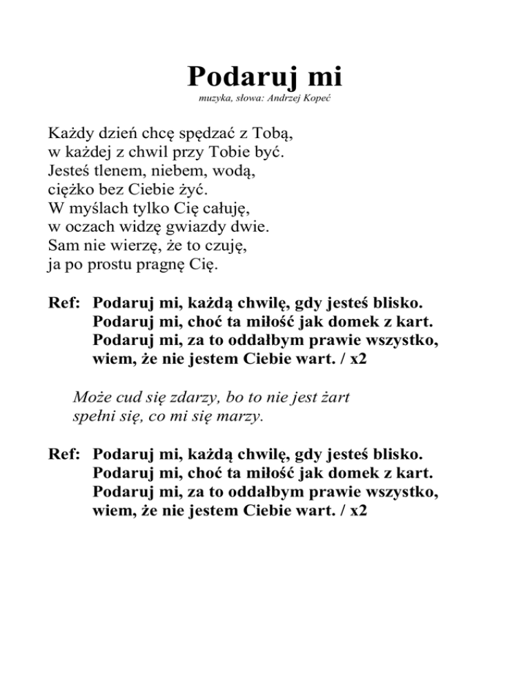 Podaruj mi muzyka, słowa: Andrzej Kopeć Każdy dzień chcę spędzać z Tobą, w każdej z chwil przy Tobie być. Jesteś tlenem, niebem, wodą, ciężko bez Ciebie żyć. W myślach tylko Cię całuję, w oczach widzę gwiazdy dwie. Sam nie wierzę, że to czuję, ja po prostu pragnę Cię. Ref: Podaruj mi, każdą chwilę, gdy jesteś blisko. Podaruj mi, choć ta miłość jak domek z kart. Podaruj mi, za to oddałbym prawie wszystko, wiem, że nie jestem Ciebie wart. / x2 Może cud się zdarzy, bo to nie jest żart spełni się, co mi się marzy. Ref: Podaruj mi, każdą chwilę, gdy jesteś blisko. Podaruj mi, choć ta miłość jak domek z kart. Podaruj mi, za to oddałbym prawie wszystko, wiem, że nie jestem Ciebie wart. / x2