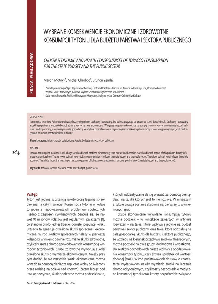 PRACA POGLĄDOWA Wybrane konsekwencje ekonomiczne i zdrowotne konsumpcji tytoniu dla budżetu państwa i sektora publicznego Chosen economic and health consequences of tobacco consumption for the state budget and the public sector Marcin Motnyk1, Michał Chrobot2, Brunon Zemła1 1 2 Zakład Epidemiologii i Śląski Rejestr Nowotworów, Centrum Onkologii – Instytut im. Marii Skłodowskiej-Curie, Oddział w Gliwicach Wydział Nauk Stosowanych, Gliwicka Wyższa Szkoła Przedsiębiorczości w Gliwicach Dział Kontraktowania, Rozliczeń i Statystyki Medycznej, Świętokrzyskie Centrum Onkologii w Kielcach Streszczenie Konsumpcja tytoniu w Polsce stanowi wciąż liczący się problem społeczny i zdrowotny. Do palenia przyznaje się prawie co trzeci dorosły Polak. Społeczny i zdrowotny aspekt tego problemu w sposób bezpośredni ma wpływ na sferę ekonomiczną. W węższym ujęciu – w kontekście konsumpcji tytoniu – wpływ ten obejmuje budżet państwa i sektor publiczny, a w szerszym – całą gospodarkę. W artykule przedstawione są najważniejsze konsekwencje konsumpcji tytoniu w ujęciu węższym, czyli oddziaływanie na budżet państwa i sektor publiczny. Słowa kluczowe: tytoń, choroby odtytoniowe, koszty, budżet państwa, sektor publiczny. 184 Abstract Tobacco consumption in Poland is still a huge social and health problem. Almost every third mature Polish smokes. Social and health aspect of this problem directly influences economic sphere. The narrower point of view – tobacco consumption – includes the state budget and the public sector. The wilder point of view includes the whole economy. The article shows the most important consequences of tobacco consumption in a narrower point of view (the state budget and the public sector). Keywords: tobacco, tobacco diseases, costs, state budget, public sector. Wstęp Tytoń jest jedyną substancją rakotwórczą legalnie sprzedawaną na całym świecie. Konsumpcja tytoniu w Polsce to jeden z najpoważniejszych problemów społecznych i jedno z zagrożeń cywilizacyjnych. Szacuje się, że nawet 10 milionów Polaków jest regularnymi palaczami [1], co stanowi około jednej trzeciej dorosłej populacji Polski. Sytuacja ta generuje określone skutki społeczne i ekonomiczne. Wśród skutków społecznych należy w pierwszej kolejności wymienić ogólnie rozumiane skutki zdrowotne, czyli cały szereg chorób spowodowanych konsumpcją wyrobów tytoniowych. Skutki zdrowotne wywołują z kolei określone skutki o wymiarze ekonomicznym. Należy przy tym dodać, że nie wszystkie skutki ekonomiczne można wyrazić za pomocą pieniądza (np. czas wolny poświęcony przez rodzinę na opiekę nad chorym). Zatem biorąc pod uwagę powyższe, skutki społeczne można podzielić na te, Polski Przegląd Nauk o Zdrowiu 2 (47) 2016 których oddziaływanie da się wyrazić za pomocą pieniądza, i na te, dla których jest to niemożliwe. W niniejszym artykule uwaga zostanie skupiona na pierwszej z wymienionych grup. Skutki ekonomiczne wywołane konsumpcją tytoniu można podzielić – w kontekście zawartych w artykule rozważań – na takie, które wpływają jedynie na budżet państwa i sektor publiczny, oraz takie, które oddziałują na całą gospodarkę. Skutki dla budżetu i sektora publicznego, ze względu na kierunek przepływu środków finansowych, można podzielić na dwie grupy: dochodowe i wydatkowe. Do skutków dochodowych należą wpływy z opodatkowania konsumpcji tytoniu, czyli akcyza i podatek od wartości dodanej (VAT). Wśród podstawowych skutków o charakterze wydatkowym należy wymienić środki na leczenie chorób odtytoniowych, czyli koszty bezpośrednie medyczne konsumpcji tytoniu oraz koszty bezpośrednie związane ze świadczeniami społecznymi, do których można zaliczyć wydatki na świadczenia rentowe czy świadczenia z tytułu śmierci. Koszty związane z absencją w pracy oraz szeroko rozumiane koszty śmierci (w ujęciu makroekonomicznym) włączone zostały do grupy skutków oddziałujących na całą gospodarkę, mimo że sektor publiczny ponosi z ich tytułu określone konsekwencje. Koszty te (skutki w ujęciu całej gospodarki – makroekonomiczne) nie będą przedmiotem rozważań w tym artykule, lecz należy o nich wspomnieć, ponieważ stanowią istotny element oddziaływania konsumpcji tytoniu na polską gospodarkę w skali makro. Konsumpcja tytoniu w Polsce i jej podstawowe konsekwencje Polska należy do czołówki państw pod względem konsumpcji tytoniu. Około czterech dorosłych mężczyzn z dziesięciu i jedna czwarta dorosłych kobiet używa regularnie tytoniu [1], a liczby te od kilku lat (po uprzednim trendzie spadkowym wśród palaczy) utrzymują się na względnie stałym poziomie. Skala konsumpcji tytoniu w Polsce wywołuje określone konsekwencje o wymiarze zarówno zdrowotnym, społecznym, jak i – co oczywiste – ekonomicznym. Wśród konsekwencji zdrowotnych konsumpcji tytoniu należy wymienić w pierwszej kolejności szereg chorób pośrednio lub bezpośrednio spowodowanych paleniem tytoniu. W grupie najważniejszych chorób odtytoniowych znajdują się następujące schorzenia: – POChP – 1,5–2,5 mln chorych, – choroby serca – 300 tys. chorych, – astma oskrzelowa – 200 tys. chorych, – udary mózgu – 60–70 tys. chorych, – rak płuca – 32 tys. chorych, – wcześniactwo – 30–43 tys. dzieci [2]. Powyższa lista może być jeszcze uzupełniona o wiele innych schorzeń, lecz wymienione powyżej wydają się tymi z grupy najistotniejszych. Poniżej znajduje się krótka charakterystyka każdej z chorób oraz jej związek z konsumpcją tytoniu. Przewlekła obturacyjna choroba płuc (POChP) jest jedną z dolegliwości najczęściej dotykających konsumentów tytoniu. Najczęstszą przyczyną POChP jest dym tytoniowy, który odpowiada za dziewięć na dziesięć przypadków [3]. Ocenia się, że w Polsce jest około 2 milionów pacjentów z POChP. Stanowią on