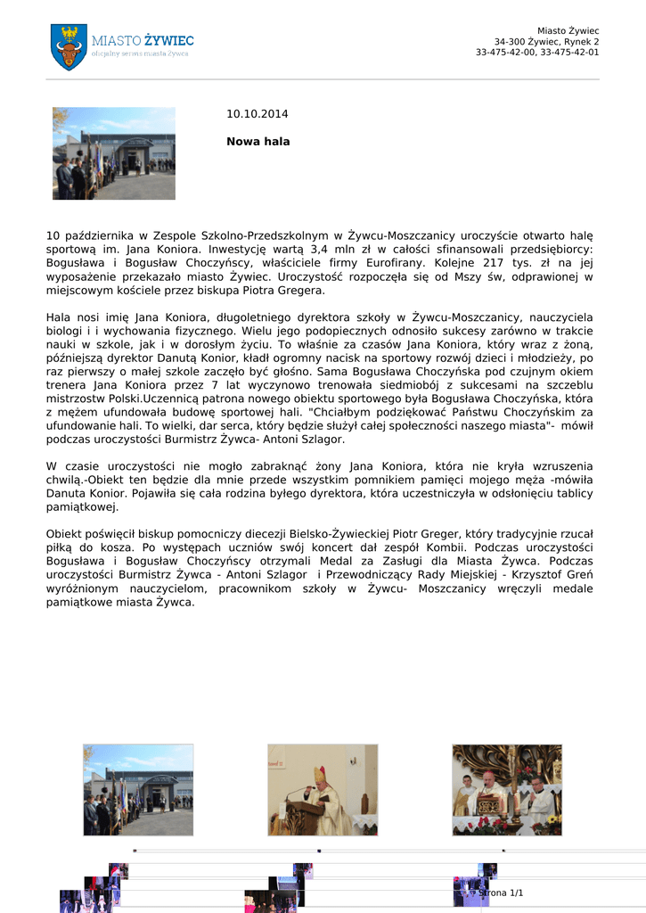 Miasto Żywiec 34-300 Żywiec, Rynek 2 33-475-42-00, 33-475-42-01 10.10.2014 Nowa hala 10 października w Zespole Szkolno-Przedszkolnym w Żywcu-Moszczanicy uroczyście otwarto halę sportową im. Jana Koniora. Inwestycję wartą 3,4 mln zł w całości sfinansowali przedsiębiorcy: Bogusława i Bogusław Choczyńscy, właściciele firmy Eurofirany. Kolejne 217 tys. zł na jej wyposażenie przekazało miasto Żywiec. Uroczystość rozpoczęła się od Mszy św, odprawionej w miejscowym kościele przez biskupa Piotra Gregera. Hala nosi imię Jana Koniora, długoletniego dyrektora szkoły w Żywcu-Moszczanicy, nauczyciela biologi i i wychowania fizycznego. Wielu jego podopiecznych odnosiło sukcesy zarówno w trakcie nauki w szkole, jak i w dorosłym życiu. To właśnie za czasów Jana Koniora, który wraz z żoną, późniejszą dyrektor Danutą Konior, kładł ogromny nacisk na sportowy rozwój dzieci i młodzieży, po raz pierwszy o małej szkole zaczęło być głośno. Sama Bogusława Choczyńska pod czujnym okiem trenera Jana Koniora przez 7 lat wyczynowo trenowała siedmiobój z sukcesami na szczeblu mistrzostw Polski.Uczennicą patrona nowego obiektu sportowego była Bogusława Choczyńska, która z mężem ufundowała budowę sportowej hali. "Chciałbym podziękować Państwu Choczyńskim za ufundowanie hali. To wielki, dar serca, który będzie służył całej społeczności naszego miasta"- mówił podczas uroczystości Burmistrz Żywca- Antoni Szlagor. W czasie uroczystości nie mogło zabraknąć żony Jana Koniora, która nie kryła wzruszenia chwilą.-Obiekt ten będzie dla mnie przede wszystkim pomnikiem pamięci mojego męża -mówiła Danuta Konior. Pojawiła się cała rodzina byłego dyrektora, która uczestniczyła w odsłonięciu tablicy pamiątkowej. Obiekt poświęcił biskup pomocniczy diecezji Bielsko-Żywieckiej Piotr Greger, który tradycyjnie rzucał piłką do kosza. Po występach uczniów swój koncert dał zespół Kombii. Podczas uroczystości Bogusława i Bogusław Choczyńscy otrzymali Medal za Zasługi dla Miasta Żywca. Podczas uroczystości Burmistrz Żywca - Antoni Szlagor i Przewodniczący Rady Miejskiej - Krzysztof Greń wyróżnionym nauczycielom, pracownikom szkoły w Żywcu- Moszczanicy wręczyli medale pamiątkowe miasta Żywca. Strona 1/1 Powered by TCPDF (www.tcpdf.org)