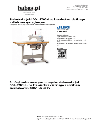Ada-Mar (babas.pl) 25-303 Kielce, Rynek 11 Telefon komórkowy: 690 993 004 Telefon stacjonarny: 41 341 51 35 Zapraszamy do sklepu www.babas.pl Stebnówka Juki DDL-8700H do krawiectwa ciężkiego z silnikiem sprzęgłowym kategoria: Maszyny szwalnicze > stebnówki jednoigłowe Producent: Juki 1 950,00 zł Opcje produktu: Wybierz opcję: 230V Wybierz opcję: 400V Wybierz opcję: 230V szt.0 Wybierz opcję: 400V szt.0 szt.0 szt.0 + oświetlenie +100 + oświetlenie +100 Kod QR: Profesjonalna maszyna do szycia, stebnówka Juki DDL-8700H - do krawiectwa ciężkiego z silnikiem sprzęgłowym 230V lub 400V strona: 1/4 wydrukowano: 02-03-2017 http://www.babas.pl/stebnowka-juki-ddl-8700h-do-krawiectwa-ciezkiego.html 1- igłowa stębnówka renomowanego japońskiego producenta Juki. W ocenie specjalistów uznawana za jedną z najlepszych, profesjonalnych maszyn do szycia. Jest niezwykle uniwersalna, elastycznie reaguje na na różnego rodzaju materiały, zachowuje rewelacyjną, stałą jakość szwów. Maszyna do szycia Juki DDL8700H posiada pojedynczy transport dolny, ząbkowy oraz centralny system smarowania. Wersja stębnówki DDL-8700 w podklasie H dedykowana jest do materiałów ciężkich. Charakteryzuje się wzmocnionym układem transportowym, zwiększonym skokiem igielnicy oraz mniejszymi obrotami (4000 ściegów/minutę), co przekłada się na moc maszyny. Stebnówka może być wyposażona w 2 rodzaje silników sprzęgłowych, 230V lub 400V. Maszyna do szycia, stebnówka Juki DDL-8700 Juki DDL-8700H jest podstawowym modelem profesjonalnej maszyny do szycia w profesjonalnym krawiectwie. Jest niezbędnym urządzeniem w każdej pracowni krawieckiej lub dużej szwalni. Seria maszyn Juki DDL-8700 charakteryzuje się niezwykłą jakością oraz dużą elastycznością i wytrzymałością. O klasie i jakości tej serii maszyn do szycia świadczy fakt, iż poddane jedynie kosmetycznym modyfikacjom technicznym, występują w trzech podklasach: do krawiectwa lekkiego (DDL-8700A), do krawiectwa średniego (DDL-8700) i do krawiectwa ciężkiego (DDL-8700H). Silnik sprzęgłowy Maszyna do szycia Juki DDL-8700H wyposażona jest w przemysłowy silnik sprzęgłowy DOL-12H 230V lub AOL-12H 400V (do wyboru). Jest to wysokiej klasy silnik przeznaczony do maszyn do szycia typu stebnówka, owerlok, renderka, itp. Maszyna kompletna w 1 przygotowana do szycia Zestaw składa się z głowicy maszyny, szwalniczego i silnika. Prezentowana mas do szycia jest produktem komplet zmontowanym, wyregulowanym, gotowym strona: 2/4 wydrukowano: 02-03-2017 http://www.babas.pl/stebnowka-juki-ddl-8700h-do-krawiectwa-ciezkiego.html natychmiastowej pracy. Różne wersje silnikowe. Maszyna do szycia Juki DDL-8700H może być zmontowana w dwóch rożnych wersjach silnikowych 230V lub 400V. Prosimy o dokonanie o wyboru wersji silnikowej 230V lub 400V. Wybór opcji znajduje się nad cena produktu. Lampka szwalnicza HM-99T w zestawie z maszyną do szycia taniej Istnieje możliwość zakupienia maszyny do szycia Juki z energooszczędną lampką szwalniczą HM-99T w zestawie w okazyjnej cenie. Energooszczędna lampa z wbudowanym transformatorem w podstawie dedykowana do maszyn szwalniczych. Mocowana do blatu. Dzięki czteropunktowej regulacji lampę można w łatwy oraz bardzo dokładny sposób przystosować do oświetlenie przestrzeni roboczej. Prosimy o dokonanie o wyboru wersji z lampką lub bez. Wybór opcji znajduje się nad cena produktu. Dane techniczne maszyny Przeznaczenie Ścieg Regulacja długości ściegu Regulacja szerokości ściegu Typ transportu Podnośnik stopki Maksymalna wysokość podnoszenia stopki Maks. prędkość szycia Typ smarowania Rozstaw igieł | system igieł Zakres grubości igieł do materiałów średnich i ciężkich stebnowy tak | do 5mm nie dolny ząbkowy kolanowy 5 mm - podnośnik ręczny | 13 mm podnośnik kolanowy 4000 ściegów/min centralne nie | 135x5, 134 Nm 110 - 160 strona: 3/4 wydrukowano: 02-03-2017 http://www.babas.pl/stebnowka-juki-ddl-8700h-do-krawiectwa-ciezkiego.html (zalecany przez producenta) Wyłączanie igieł Rozmiar chwytacza Oświetlenie pola pracy Automatyczne obcinanie nici Automatyczne pozycjonowanie igły Automatyczne podnoszenie stopki Automatyczne ryglowanie | transport wsteczny Odrzutnik nitki Funkcje dodatkowe Płyta stołu (blat) Dane techniczne silnika Rodzaj silnika Zasilanie Moc Regulacja prędkości Gwarancja Okres gwarancji nie standard nie nie nie nie nie | tak nie brak standardowa 105x50cm sprzęgłowy 230V lub 400V 400W nie 12 miesięcy strona: 4/4 wydrukowano: 02-03-2017 http://www.babas.pl/stebnowka-juki-ddl-8700h-do-krawiectwa-ciezkiego.html
