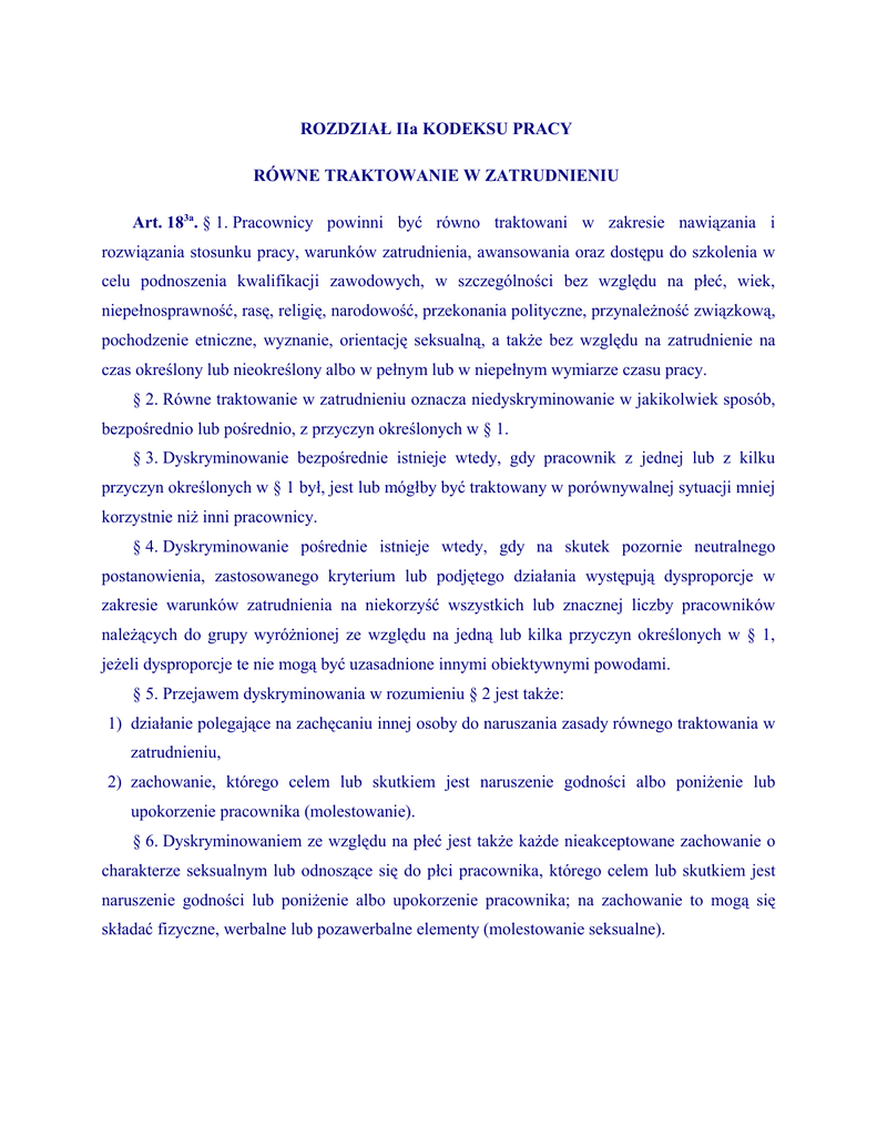 ROZDZIAŁ IIa KODEKSU PRACY RÓWNE TRAKTOWANIE W ZATRUDNIENIU Art. 183a. § 1. Pracownicy powinni być równo traktowani w zakresie nawiązania i rozwiązania stosunku pracy, warunków zatrudnienia, awansowania oraz dostępu do szkolenia w celu podnoszenia kwalifikacji zawodowych, w szczególności bez względu na płeć, wiek, niepełnosprawność, rasę, religię, narodowość, przekonania polityczne, przynależność związkową, pochodzenie etniczne, wyznanie, orientację seksualną, a także bez względu na zatrudnienie na czas określony lub nieokreślony albo w pełnym lub w niepełnym wymiarze czasu pracy. § 2. Równe traktowanie w zatrudnieniu oznacza niedyskryminowanie w jakikolwiek sposób, bezpośrednio lub pośrednio, z przyczyn określonych w § 1. § 3. Dyskryminowanie bezpośrednie istnieje wtedy, gdy pracownik z jednej lub z kilku przyczyn określonych w § 1 był, jest lub mógłby być traktowany w porównywalnej sytuacji mniej korzystnie niż inni pracownicy. § 4. Dyskryminowanie pośrednie istnieje wtedy, gdy na skutek pozornie neutralnego postanowienia, zastosowanego kryterium lub podjętego działania występują dysproporcje w zakresie warunków zatrudnienia na niekorzyść wszystkich lub znacznej liczby pracowników należących do grupy wyróżnionej ze względu na jedną lub kilka przyczyn określonych w § 1, jeżeli dysproporcje te nie mogą być uzasadnione innymi obiektywnymi powodami. § 5. Przejawem dyskryminowania w rozumieniu § 2 jest także: 1) działanie polegające na zachęcaniu innej osoby do naruszania zasady równego traktowania w zatrudnieniu, 2) zachowanie, którego celem lub skutkiem jest naruszenie godności albo poniżenie lub upokorzenie pracownika (molestowanie). § 6. Dyskryminowaniem ze względu na płeć jest także każde nieakceptowane zachowanie o charakterze seksualnym lub odnoszące się do płci pracownika, którego celem lub skutkiem jest naruszenie godności lub poniżenie albo upokorzenie pracownika; na zachowanie to mogą się składać fizyczne, werbalne lub pozawerbalne elementy (molestowanie seksualne). Art. 183b. § 1. Za naruszenie zasady równego traktowania w zatrudnieniu, z zastrzeżeniem § 2-4, uważa się różnicowanie przez pracodawcę sytuacji pracownika z jednej lub kilku przyczyn określonych w art. 183a § 1, którego skutkiem jest w szczególności: 1) odmowa nawiązania lub rozwiązanie stosunku pracy, 2) niekorzystne ukształtowanie wynagrodzenia za pracę lub innych warunków zatrudnienia albo pominięcie przy awansowaniu lub przyznawaniu innych świadczeń związanych z pracą, 3) pominięcie przy typowaniu do udziału w szkoleniach podnoszących kwalifikacje zawodowe - chyba że pracodawca udowodni, że kierował się obiektywnymi powodami. § 2. Zasady równego traktowania w zatrudnieniu nie naruszają działania polegające na: 1) niezatrudnianiu pracownika z jednej lub kilku przyczyn określonych w art. 183a § 1, jeżeli jest to uzasadnione ze względu na rodzaj pracy, warunki jej wykonywania lub wymagania zawodowe stawiane pracownikom, 2) wypowiedzeniu pracownikowi warunków zatrudnienia w zakresie wymiaru czasu pracy, jeżeli jest to uzasadnione przyczynami niedotyczącymi pracowników, 3) stosowaniu środków, które różnicują sytuację prawną pracownika ze względu na ochronę rodzicielstwa, wiek lub niepełnosprawność pracownika, 4) ustalaniu warunków zatrudniania i zwalniania pracowników, zasad wynagradzania i awansowania oraz dostępu do szkolenia w celu podnoszenia kwalifikacji zawodowych - z uwzględnieniem kryterium stażu pracy. § 3. Nie stanowią naruszenia zasady równego traktowania w zatrudnieniu działania podejmowane przez określony czas, zmierzające do wyrównywania szans wszystkich lub znacznej liczby pracowników wyróżnionych z jednej lub kilku przyczyn określonych w art. 183a § 1, przez zmniejszenie na korzyść takich pracowników faktycznych nierówności, w zakresie określonym w tym przepisie. § 4. Różnicowanie pracowników ze względu na religię lub wyznanie nie stanowi naruszenia zasady równego traktowania w zatrudnieniu, jeżeli w związku z rodzajem i charakterem działalności prowadzonej w ramach kościołów i innych związków wyznaniowych, a także organizacji, których cel działania pozostaje w bezpośrednim związku z religią lub wyznaniem, religia lub wyznanie pracownika stanowi istotne, uzasadnione i usprawiedliwione wymaganie zawodowe. Art. 183c. § 1. Pracownicy mają prawo do jednakowego wynagrodzenia za jednakową pracę lub za pracę o jednakowej wartości. § 2. Wynagrodzenie, o którym mowa w § 1, obejmuje wszystkie składniki wynagrodzenia, bez względu na ich nazwę i charakter, a także inne świadczenia związane z pracą, przyznawane pracownikom w formie pieniężnej lub w innej formie niż pieniężna. § 3. Pracami o jednakowej wartości są prace, których wykonywanie wymaga od pracowników porównywalnych kwalifikacji zawodowych, potwierdzonych dokumentami przewidzianymi w odrębnych przepisach lub praktyką i doświadczeniem zawodowym, a także porównywalnej odpowiedzialności i wysiłku. Art. 183d. Osoba, wobec której pracodawca naruszył zasadę równego traktowania w zatrudnieniu, ma prawo do odszkodowania w wysokości nie niższej niż minimalne wynagrodzenie za pracę, ustalane na podstawie odrębnych przepisów. komentarze Art. 183e. Skorzystanie przez pracownika z uprawnień przysługujących z tytułu naruszenia zasady równego traktowania w zatrudnieniu nie może stanowić przyczyny uzasadniającej wypowiedzenie przez pracodawcę stosunku pracy lub jego rozwiązanie bez wypowiedzenia.