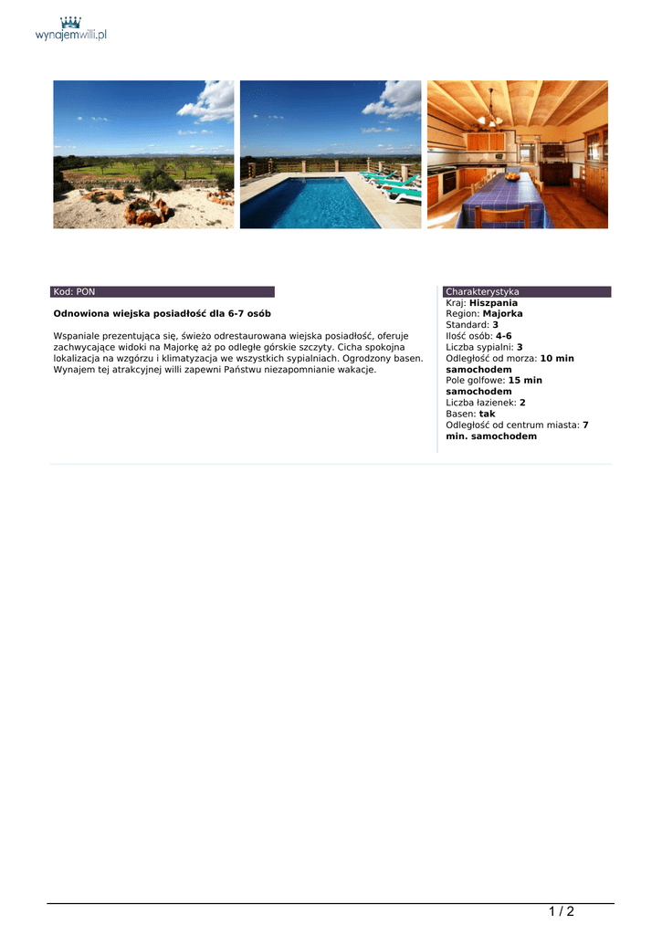 Kod: PON Odnowiona wiejska posiadłość dla 6-7 osób Wspaniale prezentująca się, świeżo odrestaurowana wiejska posiadłość, oferuje zachwycające widoki na Majorkę aż po odległe górskie szczyty. Cicha spokojna lokalizacja na wzgórzu i klimatyzacja we wszystkich sypialniach. Ogrodzony basen. Wynajem tej atrakcyjnej willi zapewni Państwu niezapomnianie wakacje. Charakterystyka Kraj: Hiszpania Region: Majorka Standard: 3 Ilość osób: 4-6 Liczba sypialni: 3 Odległość od morza: 10 min samochodem Pole golfowe: 15 min samochodem Liczba łazienek: 2 Basen: tak Odległość od centrum miasta: 7 min. samochodem 1/2 Willa ulokowana na szczycie wzgórza, z majestatycznymi widokami na faliste, wiejskie pola, rozciągające się u stóp górskich grzbietów. Oglądanie tutejszych, płomiennie czerwonych zachodów słońca jest niezapomnianym doznaniem. Miejscowe miasteczko Cas Concos tylko w kilku minutach samochodem i piękne piaszczyste zatoczki wzdłuż wybrzeża są tylko w 10-15 minutach stąd. Ta niedawno odnawiona, czarująca posiadłość wiejska jest teraz bardzo atrakcyjnym rodzinnym, wakacyjnym domem. Sklepione sufity, terakotowe podłogi i oryginalne wykończenia stwarzają prawdziwie relaksujące otoczenie. Willa jest dobrze urządzona I oferuje wysoki komfort zakwaterowania, wszystko na jednym piętrze: * Frontowa weranda otwiera się na wejściowy korytarz. Pokój gościnny/jadalnia z telewizją satelitarną, DVD, Playstation 2 i wyjście na tarasy basenu. * Duża kuchnia ze zmywarką, kuchenką mikrofalową, elektryczny piecyk/kuchenka, chłodziarko-zamrażarką i pralką. * Dwuosobowa sypialnia z pojedynczymi łóżkami ma obok łazienkę z prysznicem. * Jedna sypialnia małżeńska I jedna sypialnia z dwoma osobnymi łóżkami rozdzielą w pełni wyposażona łazienka. * Wszystkie sypialnie i pokój gościnny są klimatyzowane. Całkowicie nowy basen, zkomfortowo urządzonymi, słonecznymi tarasami, z których roztaczają się malownicze widoki. Spokojny, zadaszony taras jadalny, ze znajdującym się tuż obok barbecue, jest idealnym miejscem na długie, odprężające lunche lub wieczorne kolacje w blasku świec. Położone w niezwykle cichej okolicy w jednej z najpiękniejszych rejonów w sercu prawdziwej Majorki. Ogrodzony basen posiada przyjazne dzieciom, wygięte schody i może być zamykany dla dodatkowego bezpieczeństwa najmłodszych. Jeśli jesteś entuzjastą tenisa stołowego, możesz doskonalić tu swoje umiejętności, ciesząc się jednocześnie cudownie relaksującym otoczeniem. Szczególnie polecamy wynajem tej willi na niezapomniane, rodzinne wakacje. Dodatkowe informacje: ogrodzony basen 8x4m, Playstation 2 i tenis stołowy, asysta pokojówki dwa razy w tygodniu, usługi kucharza i opiekunki dla dziecka na życzenie. Odległości: najbliższe plaże (Cala Santanyi i Mondrago) - 10-15 minut samochodem, najbliższe sklepy i restauracje w Cas Concos lub Santanyi - 5 minut samochodem, tenis w Cala Dor - 10 minut samochodem, Vall Dor golf - 15 minut samochodem. Cena za tydzień: od€517. 2/2 Powered by TCPDF (www.tcpdf.org)