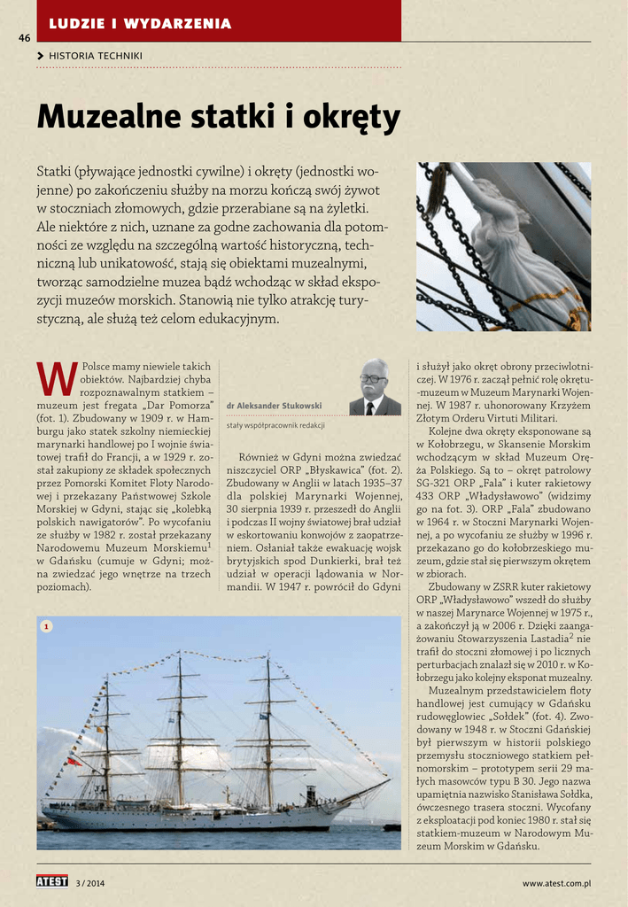 ludzie i wydarzenia 46 > historia techniki Muzealne statki i okręty Statki (pływające jednostki cywilne) i okręty (jednostki wojenne) po zakończeniu służby na morzu kończą swój żywot w stoczniach złomowych, gdzie przerabiane są na żyletki. Ale niektóre z nich, uznane za godne zachowania dla potomności ze względu na szczególną wartość historyczną, techniczną lub unikatowość, stają się obiektami muzealnymi, tworząc samodzielne muzea bądź wchodząc w skład ekspozycji muzeów morskich. Stanowią nie tylko atrakcję turystyczną, ale służą też celom edukacyjnym. W Polsce mamy niewiele takich obiektów. Najbardziej chyba rozpoznawalnym statkiem – muzeum jest fregata „Dar Pomorza” (fot. 1). Zbudowany w 1909 r. w Hamburgu jako statek szkolny niemieckiej marynarki handlowej po I wojnie światowej trafił do Francji, a w 1929 r. został zakupiony ze składek społecznych przez Pomorski Komitet Floty Narodowej i przekazany Państwowej Szkole Morskiej w Gdyni, stając się „kolebką polskich nawigatorów”. Po wycofaniu ze służby w 1982 r. został przekazany Narodowemu Muzeum Morskiemu 1 w Gdańsku (cumuje w Gdyni; można zwiedzać jego wnętrze na trzech poziomach). 1 3 / 2014 3 / 2014 dr Aleksander Stukowski stały współpracownik redakcji Również w Gdyni można zwiedzać niszczyciel ORP „Błyskawica” (fot. 2). Zbudowany w Anglii w latach 1935–37 dla polskiej Marynarki Wojennej, 30 sierpnia 1939 r. przeszedł do Anglii i podczas II wojny światowej brał udział w eskortowaniu konwojów z zaopatrzeniem. Osłaniał także ewakuację wojsk brytyjskich spod Dunkierki, brał też udział w operacji lądowania w Normandii. W 1947 r. powrócił do Gdyni i służył jako okręt obrony przeciwlotniczej. W 1976 r. zaczął pełnić rolę okrętu -muzeum w Muzeum Marynarki Wojennej. W 1987 r. uhonorowany Krzyżem Złotym Orderu Virtuti Militari. Kolejne dwa okręty eksponowane są w Kołobrzegu, w Skansenie Morskim wchodzącym w skład Muzeum Oręża Polskiego. Są to – okręt patrolowy SG‑321 ORP „Fala” i kuter rakietowy 433 ORP „Władysławowo” (widzimy go na fot. 3). ORP „Fala” zbudowano w 1964 r. w Stoczni Marynarki Wojennej, a po wycofaniu ze służby w 1996 r. przekazano go do kołobrzeskiego muzeum, gdzie stał się pierwszym okrętem w zbiorach. Zbudowany w ZSRR kuter rakietowy ORP „Władysławowo” wszedł do służby w naszej Marynarce Wojennej w 1975 r., a zakończył ją w 2006 r. Dzięki zaangażowaniu Stowarzyszenia Lastadia2 nie trafił do stoczni złomowej i po licznych perturbacjach znalazł się w 2010 r. w Kołobrzegu jako kolejny eksponat muzealny. Muzealnym przedstawicielem floty handlowej jest cumujący w Gdańsku rudowęglowiec „Sołdek” (fot. 4). Zwodowany w 1948 r. w Stoczni Gdańskiej był pierwszym w historii polskiego przemysłu stoczniowego statkiem pełnomorskim – prototypem serii 29 małych masowców typu B 30. Jego nazwa upamiętnia nazwisko Stanisława Sołdka, ówczesnego trasera stoczni. Wycofany z eksploatacji pod koniec 1980 r. stał się statkiem‑muzeum w Narodowym Muzeum Morskim w Gdańsku. www.atest.com.pl 47 Fot. 1 i 2 – A. Pawłowska, fot. 3 – archiwum ATESTU, fot. 4 – P. Kapczyński, fot. 5 – K. Gorczycki, pozostałe – A. Stukowski 2 3 4 5 6 7 8 9 Statek na fot. 5 to holownik parowy „Nadbor”3 – jeden z 22 śródlądowych holowników zakupionych w latach 1947–49 w Holandii dla potrzeb żeglugi na Odrze. Po wycofaniu ze służby liniowej w 1965 r. był wykorzystywany jako pływająca kotłownia i elektrownia; ostatecznie zakończono jego eksploatację w 1986 r. W latach 90. zainteresowała się nim działająca we Wrocławiu Fundacja Otwartego Muzeum Techniki, przy której stworzono m.in. Muzeum Odry. Dzięki działalności fundacji „Nadbor” został w latach 1998–99 wyremontowany i zaadaptowany do nowych zadań – jako laboratorium, szkoła i muzeum. Można go zwiedzać we Wrocławiu, gdzie stoi zacumowany przy Wybrzeżu Wyspiańskiego. A oto kilka przykładów statków i okrętów‑muzeów zagranicznych. Fotografia 6 przedstawia słynny XIX‑wieczny angielski kliper herbaciany „Cutty Sark”, w tamtych czasach najszybszy (średnia dobowa prędkość 15 węzłów) statek świata4. Obecnie jest udostępniony do zwiedzania na stałym lądzie w londyńskim Greenwich. Jego nazwa oznacza w dialekcie scott krótką koszulkę, w którą była Atest – Ochrona Pracy odziana Nannie – XVIII‑wieczna postać literacka, której rzeźba, tzw. galion, zdobi dziób statku. Widzimy go na fotografii u góry na stronie obok. Również w Londynie możemy zwie dzać zacumowany na Tamizie największy europejski okręt‑muzeum – krążownik HMS „Belfast” (fot. 7). Zwodowany w 1938 r. krążownik uczestniczył podczas II wojny światowej przede wszystkim w osłonie konwojów na Morzu Arktycznym. Po zakończeniu wojny pełnił służbę na Dalekim Wschodzie (uczestniczył m.in. w wojnie koreańskiej). Okrętem‑muzeum został w 1971 r. Szwedzki galeon „Vasa” (fot. 8) zasłynął ze spektakularnego zatonięcia i późniejszej o kilka wieków akcji wydobycia. Zbudowany w XVII w. na wojnę z Polską wielki (długość kadłuba 61 m) okręt miał zbyt wysoko położony środek ciężkości. W efekcie po przepłynięciu zaledwie 1 mili przewrócił się i zatonął. Podniesiono go dopiero w XX w. – prace nad wydobyciem, rekonstrukcją i konserwacją trwały od 1956 r. do 1990 r., kiedy to otwarto muzeum. A oto karaka „Santa Maria” Krzysztofa Kolumba (fot. 9). Oczywiście nie oryginał, bo ten w 1492 r. osiadł na mieliźnie w pobliżu Haiti i został rozebrany. Jest to polska kopia w skali 1:1, „zwodowana” w 2008 r. w Ogrodzie Kultur i Tolerancji w Muzeum Arkadego Fiedlera w podpoznańskim Puszczykowie. Reakcja ludzi widzących go po raz pierwszy jest zawsze taka sama – „To on jest taki mały?!”. Rzeczywiście – statek, na którym Kolumb przepłynął A