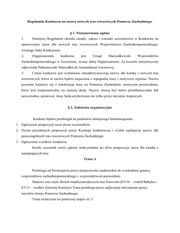 Regulamin Konkursu na nazwę nowych tras rowerowych Pomorza Zachodniego. § 1. Postanowienia ogólne 1. Niniejszy Regulamin określa zasady, zakres i warunki uczestnictwa w Konkursie na opracowanie nazw dla nowych tras rowerowych Województwa Zachodniopomorskiego, zwanego dalej Konkursem. 2. Organizatorem konkursu jest Urząd Marszałkowski Województwa Zachodniopomorskiego w Szczecinie, zwany dalej Organizatorem. Za kwestie merytoryczne odpowiada Pełnomocnik Marszałka ds. komunikacji rowerowej. 3. Celem konkursu jest wyłonienie charakterystycznej nazwy dla każdej z nowych tras rowerowych, która to nazwa będzie kojarzona z topografią trasy i motywem regionu. Nazwa powinna kojarzyć się z lokalizacją trasy na Pomorzu Zachodnim, motywem przewodnim, który jest rozpoznawalny na szerszą skalę. Nazwy muszą być łatwo przetłumaczalne lub uniwersalne, ponieważ trasy będą użytkowane nie tylko przez turystów krajowych. § 2. Założenia organizacyjne Konkurs będzie przebiegał na podstawie niniejszego harmonogramu: 1. Zgłoszenie propozycji nazw przez uczestników. 2. Ocena przesłanych propozycji przez Komisję konkursową i wybór najlepszej nazwy dla poszczególnych tras rowerowych Pomorza Zachodniego. 3. Ogłoszenie wyników konkursu. Każdy uczestnik może zgłosić maksymalnie po dwie propozycje nazw dla każdej z następujących tras: Trasa A Przebiega od Świnoujścia przez miejscowości nadmorskie do wschodniej granicy województwa zachodniopomorskiego z województwem pomorskim. Stanowi ona część dwóch międzynarodowych tras Eurovelo (EV10 – wokół Bałtyku i EV13 – wzdłuż Żelaznej Kurtyny).Trasa przebiega przez najliczniej odwiedzane przez turystów tereny Pomorza Zachodniego. Trasa oznaczona na poniższej mapce nr: I Trasa B Trasa ma dwie odnogi w zachodniej części województwa - jedną biegnącą od granicy z Niemcami przez Szczecin i Stargard w kierunku pojezierza Ińskiego; drugą od granicy z Niemcami w okolicach Cedyni przez Myślibórz, Barlinek, Choszczno w kierunku Ińska, gdzie łączy się z odnogą „szczecińską”. Dalej trasa przebiega przez Drawsko Pomorskie, Złocieniec, Czaplinek do Szczecinka i w gminie Biały Bór dochodzi do granicy z województwem pomorskim. Trasa łączy główne ośrodki miejskie (Szczecin, Stargard) z największym miastem leżącym przy wschodniej granicy województwa – Szczecinkiem. Trasa łączy Parki Krajobrazowe (Cedyński, Barlinecko - Gorzowski, Iński i Drawski) oraz obszary o wysokich walorach krajobrazowych. Trasa oznaczona na poniższej mapce nr: II Trasa C Trasa ma dwie odnogi w północnej części województwa, które zbiegają się w Białogardzie. Jedna prowadzi z Mielna przez Koszalin; natomiast druga bierze swój początek w Kołobrzegu i w większości biegnie po nasypie dawnej linii kolejowej przez Gościno i Karlino. Za Białogardem trasa wiedzie na południe do Wałcza. Pomiędzy PołczynemZdrojem a Złocieńcem trasa biegnie drogą rowerową zbudowaną na nasypie dawnej linii kolejowej. W Złocieńcu trasa będzie krzyżowała się z Trasą A stanowiąc łącznik, „pomost” pomiędzy Pojezierzem a Bałtykiem. Od Wierzchowa do Wałcza trasa będzie biegła po nasypie dawnej linii kolejowej. Trasa kończy się za Wałczem w miejscowości Dobino i może być w przyszłości konturowana na południe Polski, w szczególności do Poznania. Całość trasy ma przekrojowy charakter zarówno w wymiarze społecznoekonomicznym jak również krajobrazowym. Trasa biegnie przez najbardziej charakterystyczny krajobraz w województwie. Począwszy od panoramy morza bałtyckiego, moreny Szwajcarii Połczyńskiej, pojezierza i doliny rzeczne kończąc na wielkich, zwartych kompleksach leśnych. Trasa oznaczona na poniższej mapce nr: III Trasa D Trasa przebiega od Świnoujścia przez Międzyzdroje razem trasą A, następnie wschodnią częścią Zalewu Szczecińskiego i Jeziora Dąbie łączy morze poprzez Wolin, Stepnicę i Lubczynę ze stolica województwa. Następnie trasa biegnie ze Szczecina przez Gryfino, Banie, Trzcińsko-Zdrój i Dębno do granicy województwa w okolicy Kostrzyna nad Odrą. Pomiędzy Gryfinem a Trzcińskiem-Zdrojem trasa biegnie wzdłuż Doliny Tywy, głównie po nasypach zlikwidowanej kolei. Trasa ta łączy trasę nadmorską z trasą prowadzącą z okolic Cedyni do Szczecinka. Przebiega przez kompleksy leśne i tereny rolnicze o lekko pagórkowatym krajobrazie. Trasa przebiega przez Swobnicę gdzie znajduje się zamek Joannitów oraz Chwarszczany słynne z komandorii Templariuszy. Trasa stanowi alternatywę dla trasy wzdłuż Odry. Trasa oznaczona na poniższej mapce nr: IV (wschodnia część) i V. Mapka. § 3. Warunki uczestnictwa 1. Udział w Konkursie jest bezpłatny i dobrowolny. 2. Do Konkursu mogą przystąpić osoby, które zapoznały się z Regulaminem Konkursu i akceptują jego postanowienia. Przystąpienie do Konkursu oznacza akceptację postanowień niniejszego regulaminu. 3. W konkursie mogą brać udział tylko osoby pełnoletnie. 4. Osoby biorące udział w Konkursie mogą w nim uczestniczyć jedynie indywidualnie. Udział zespołu jest niedopuszczalny. 5. Zgłoszenia do konkursu należy dokonać poprzez wypełnienie przez uczestnika Formularza Zgłoszeniowego (Załącznik nr 1), co jest równoznaczne z akceptacją Regulaminu Konkursu. 6. Prace złożone bez podpisanego Formularza Zgłoszeniowego nie będą podlegały ocenie konkursowej. 7. Koncepcje nazw tras muszą być projektami autorskimi. 8. Autor pracy konkursowej nie może umieszczać żadnego znaku identyfikującego pracę z autorem w żaden inny sposób niż określony w niniejszym Regulaminie. 9. Wszelkie koszty związane z przygotowaniem i złożeniem koncepcji konkursowej ponosi Uczestnik Konkursu. § 4. Wymagania techniczne pracy konkursowej i forma przekazania 1. Nazwy dla nowych tras powinny być zawarte w Formularzu Zgłoszeniowym, dla każdej z tras maksymalnie po dwie propozycje - jednakże u