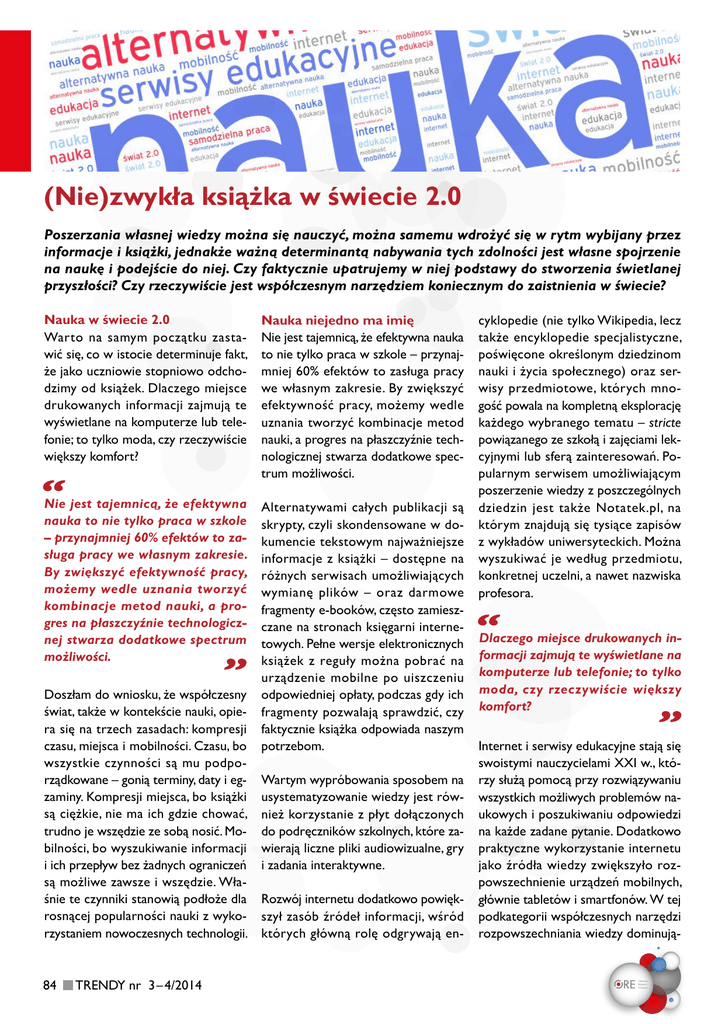 (Nie)zwykła książka w świecie 2.0 Poszerzania własnej wiedzy można się nauczyć, można samemu wdrożyć się w rytm wybijany przez informacje i książki, jednakże ważną determinantą nabywania tych zdolności jest własne spojrzenie na naukę i podejście do niej. Czy faktycznie upatrujemy w niej podstawy do stworzenia świetlanej przyszłości? Czy rzeczywiście jest współczesnym narzędziem koniecznym do zaistnienia w świecie? Nauka w świecie 2.0 Warto na samym początku zastawić się, co w istocie determinuje fakt, że jako uczniowie stopniowo odchodzimy od książek. Dlaczego miejsce drukowanych informacji zajmują te wyświetlane na komputerze lub telefonie; to tylko moda, czy rzeczywiście większy komfort? Nauka niejedno ma imię Nie jest tajemnicą, że efektywna nauka to nie tylko praca w szkole – przynajmniej 60% efektów to zasługa pracy we własnym zakresie. By zwiększyć efektywność pracy, możemy wedle uznania tworzyć kombinacje metod nauki, a progres na płaszczyźnie technologicznej stwarza dodatkowe spectrum możliwości. Nie jest tajemnicą, że efektywna nauka to nie tylko praca w szkole – przynajmniej 60% efektów to zasługa pracy we własnym zakresie. By zwiększyć efektywność pracy, możemy wedle uznania tworzyć kombinacje metod nauki, a progres na płaszczyźnie technologicznej stwarza dodatkowe spectrum możliwości. Alternatywami całych publikacji są skrypty, czyli skondensowane w dokumencie tekstowym najważniejsze informacje z książki – dostępne na różnych serwisach umożliwiających wymianę plików – oraz darmowe fragmenty e-booków, często zamieszczane na stronach księgarni internetowych. Pełne wersje elektronicznych książek z reguły można pobrać na urządzenie mobilne po uiszczeniu odpowiedniej opłaty, podczas gdy ich fragmenty pozwalają sprawdzić, czy faktycznie książka odpowiada naszym potrzebom. Doszłam do wniosku, że współczesny świat, także w kontekście nauki, opiera się na trzech zasadach: kompresji czasu, miejsca i mobilności. Czasu, bo wszystkie czynności są mu podporządkowane – gonią terminy, daty i egzaminy. Kompresji miejsca, bo książki są ciężkie, nie ma ich gdzie chować, trudno je wszędzie ze sobą nosić. Mobilności, bo wyszukiwanie informacji i ich przepływ bez żadnych ograniczeń są możliwe zawsze i wszędzie. Właśnie te czynniki stanowią podłoże dla rosnącej popularności nauki z wykorzystaniem nowoczesnych technologii. 84 TRENDY nr 3– 4/2014 Wartym wypróbowania sposobem na usystematyzowanie wiedzy jest również korzystanie z płyt dołączonych do podręczników szkolnych, które zawierają liczne pliki audiowizualne, gry i zadania interaktywne. Rozwój internetu dodatkowo powiększył zasób źródeł informacji, wśród których główną rolę odgrywają en- cyklopedie (nie tylko Wikipedia, lecz także encyklopedie specjalistyczne, poświęcone określonym dziedzinom nauki i życia społecznego) oraz serwisy przedmiotowe, których mnogość powala na kompletną eksplorację każdego wybranego tematu – stricte powiązanego ze szkołą i zajęciami lekcyjnymi lub sferą zainteresowań. Popularnym serwisem umożliwiającym poszerzenie wiedzy z poszczególnych dziedzin jest także Notatek.pl, na którym znajdują się tysiące zapisów z wykładów uniwersyteckich. Można wyszukiwać je według przedmiotu, konkretnej uczelni, a nawet nazwiska profesora. Dlaczego miejsce drukowanych informacji zajmują te wyświetlane na komputerze lub telefonie; to tylko moda, czy rzeczywiście większy komfort? Internet i serwisy edukacyjne stają się swoistymi nauczycielami XXI w., którzy służą pomocą przy rozwiązywaniu wszystkich możliwych problemów naukowych i poszukiwaniu odpowiedzi na każde zadane pytanie. Dodatkowo praktyczne wykorzystanie internetu jako źródła wiedzy zwiększyło rozpowszechnienie urządzeń mobilnych, głównie tabletów i smartfonów. W tej podkategorii współczesnych narzędzi rozpowszechniania wiedzy dominują- (Nie)zwykła książka w świecie 2.0 cą rolę odgrywają aplikacje mobilne, stanowiące obecnie najbardziej dochodowy sektor branży IT. W Polsce poziom jego rozwoju odbiega jeszcze od standardów zachodnich, szczególnie w kategorii aplikacji edukacyjnych, jednakże obserwuje się znaczący progres w tej dziedzinie. pewne jej elementy mają też edukacyjnie wartościowe zastosowanie. gości źródeł wiedzy nie można jednak bezkrytycznie ocenić jako pozytywnej strony współczesnej nauki, gdyż przy W kontekście alternatywnej nauki tak szerokiej gamie możliwości dużo warto wspomnieć również o jej wi- trudniej o skupienie. Rozwój technozualnej stronie, czyli filmach eduka- logiczny w sferze edukacyjnej ideolocyjnych. Najszerszy wybór zarówno gicznie zachęca do nauki atrakcyjną filmów dokumentalnych, jak i kanałów formą, przejrzystym układem i intereedukacyjnych poświęconych kon- sującymi możliwościami, czyli umożkretnym dziedzinom jest dostępny liwia odpowiednio dostosowaną do Internet i serwisy edukacyjne sta- w serwisie YouTube. W zależności od etapu kształcenia naukę przez zabają się swoistymi nauczycielami potrzeb mamy możliwość posłuchania wę. Staje przed nami jednak wyzwanie XXI w., którzy służą pomocą przy m.in. wyjaśnień trudnych zagadnień wyznaczenia właściwych proporcji, by rozwiązywaniu wszystkich możli- matematycznych albo wykładów ulu- pod hasłem szeroko pojętej Nauki 2.0 wych problemów naukowych i po- bionych naukowców. Ponadto wyjątko- faktycznie kryły się wymierne rezulszukiwaniu odpowiedzi na każde wo ciekawym serwisem zawierającym taty. Nie neguję, bo sama korzystam, zadane pytanie. niemal 2 tys. krótkich, około 5-minuto- i trudno przychodzi mi wyobrażenie wych wykładów jest TED.com, w któ- sobie świata i codziennej pracy po Mamy do dyspozycji programy ma- rym doskonali, charyzmatyczni mówcy wyeliminowaniu wszystkich serwisów,