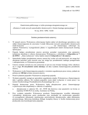 2016 / OPK / SAM Załącznik nr 5 do SIWZ _____________________________ (Pieczęć Wykonawcy) Zamówienia publicznego w trybie przetargu nieograniczonego na: „Dostawa 4 sztuk nowych samochodów dostawczych w formie leasingu operacyjnego.” Nr rej. 2016 / OPK / SAM Istotne postanowienia umowy. 1. W ramach umowy Wykonawca zobowiązany będzie nabyć od określonego sprzedawcy oraz oddać Zamawiającemu do używania 4 sztuki fabrycznie nowych samochodów dostawczych marki-koncernu ………………………………………, zaś Zamawiający zobowiąże się zapłacić Wykonawcy wynagrodzenie płatne w uzgodnionych ratach miesięcznych (leasing operacyjny). 2. Pojazdy będące przedmiotem umowy powinny posiadać wyposażenie oraz parametry techniczne określone w ofercie złożonej przez Wykonawcę, a określone w Załączniku nr 7 do SIWZ – „Dane techniczne”, który będzie stanowił Załącznik nr 1 do umowy. 3. Samochody będące przedmiotem umowy muszą być wolne od wad prawnych, nie mogą być obciążone prawami osób trzecich oraz nie mogą być przedmiotem żadnego postępowania i zabezpieczenia, co Wykonawca gwarantuje. 4. Umowa zostanie zawarta na czas oznaczony to jest na czas trwania leasingu, który zakończy się w ciągu 36 (trzydzieści sześć) miesięcy od dnia wydania Zamawiającemu przedmiotu umowy. 5. Wykonawca wyda Zamawiającemu pojazdy w terminie uzgodnionym przez strony, jednak nie później niż 100 dni od dnia zawarcia umowy. 6. Przed wydaniem pojazdów Wykonawca zarejestruje pojazdy. 7. Wydanie pojazdów nastąpi po uprzednim uzgodnieniu między Wykonawcą a Zamawiającym daty i godziny odbioru. Do wydania pojazdów może dojść wyłącznie w czasie pracy i na terenie Ozorkowskiego Przedsiębiorstwa Komunalnego Sp. z o.o. 8. Pojazdy dostarczone przez Wykonawcę będą ubezpieczone przez Zamawiającego w pierwszym roku eksploatacji w zakresie co najmniej: a. 9. ubezpieczone w zakresie OC, AC, NNW dla kierowcy oraz pasażerów na kwotę co najmniej 10 000 PLN na osobę, Assistance na Polskę, Przy wydaniu pojazdów Wykonawca przekaże Zamawiającemu wszelkie dokumenty i przedmioty dostarczone przez producenta oraz niezbędne do użytkowania pojazdów (w szczególności dokumenty rejestracyjne, potwierdzenie ubezpieczenia, odpis dokumentu gwarancyjnego, fabryczną instrukcję obsługi, komplety kluczy w liczbie dostarczonej przez producenta oraz kserokopia karty pojazdu). 2016 / OPK / SAM 10. Przy wydaniu pojazdów Wykonawca przekaże Zamawiającemu kserokopię faktury VAT będącej dowodem zakupu wystawionym Wykonawcy przez zbywcę pojazdów. 12. Odbiór pojazdów (4 sztuki) zostanie potwierdzony protokołem zdawczo – odbiorczym podpisanym przez osoby upoważnione przez strony niniejszej umowy. 13. Zamawiający może odmówić odbioru pojazdów wówczas gdy: a. stwierdzi wady pojazdów uniemożliwiające ich użytkowanie; b. pojazdy nie będą odpowiadały warunkom określonym w Załączniku nr 1 do umowy, w ofercie Wykonawcy lub nie będą spełniały warunków, o których mowa w punkcie 9 niniejszych postanowień. 14. W przypadku stwierdzenia okoliczności, o których mowa w punkcie poprzednim, Zamawiający wyznaczy Wykonawcy dodatkowy termin na usunięcie wad lub braków (nie dłuższy niż 14 dni). Po bezskutecznym upływie wyznaczonego terminu, Zamawiający będzie miał prawo odstąpić od umowy w całości lub w części. W razie usunięcia stwierdzonych wad i braków Strony sporządzą dodatkowy protokół zdawczo-odbiorczy. 15. Zamawiający zapłaci Wykonawcy wynagrodzenie umowne, w wysokości łącznej: …………………………… zł brutto (słownie …………………………………………… zł) tj. ………………………… zł netto (słownie ……………………………………………… zł) + podatek …… % VAT. 16. Wynagrodzenie, o którym mowa w punkcie 15 niniejszego dokumentu zawierać będzie w sobie wszelkie składniki cenotwórcze z uwzględnieniem wszystkich opłat leasingowych w tym opłaty wstępnej, manipulacyjnej, administracyjnej (o ile występuje) wykupu, i podatków (z wyłączeniem podatku od środków transportu) oraz ewentualnych upustów i rabatów. Zamawiający nie wyraża zgody na wprowadzenie do harmonogramu finansowania zamówienia innych opłat niż opłata wstępna, rata leasingowa i opłata końcowa (za wykup). 17. Wynagrodzenie z tytułu leasingu pojazdów płatne będzie w miesięcznych ratach zgodnie z harmonogramem finansowym płatności. 18. Poszczególne raty leasingowe będą uiszczane na podstawie faktur VAT wystawianych przez Wykonawcę co miesiąc, w całym okresie trwania umowy. W każdej z wystawionej faktur zgodnie z harmonogramem, Wykonawca określi wysokość raty kapitałowej. Płatność nastąpi w terminie co najmniej 14 dni od daty wystawienia Zamawiającemu prawidłowo wystawionej faktury VAT, przelewem na rachunek bankowy Wykonawcy. Wykonawca niezwłocznie po wystawieniu faktury powiadomi o tym fakcie Zamawiającego w sposób umożliwiający archiwizowanie powyższej wiadomości. 19. Po stronie Zamawiającego są obowiązki wynikające z ponoszenia kosztów serwisowania i napraw w ramach umowy gwarancyjnej i pogwarancyjnej. 20. Faktura VAT zostanie wystawiona na: Ozorkowskie Przedsiębiorstwo Komunalne Sp. z o.o., ul. Żwirki 30, 95-035 Ozorków NIP 732-17-52-233, REGON 471708576. 21. Zamawiający dokona opłaty wstępnej stanowiącej 30% wartości zamówienia oraz opłaty manipulacyjnej w terminie pierwszej raty leasingowej, na podstawie wystawionej faktury VAT płatnej w terminie 14 dni od daty wystawienia. 22. Faktura VAT dotycząca raty leasingowej będzie wystawiana zgodnie z harmonogramem przez okres 36-ciu miesięcy comiesięcznie od daty wydania pojazdów będących przedmiotem leasingu. 2 2016 / OPK / SAM 23. Faktura VAT dotycząca opłaty końcowej w wysokości 20% wartości zamówienia, która stanowi kwotę wykupu pojazdów będzie wystawiona w