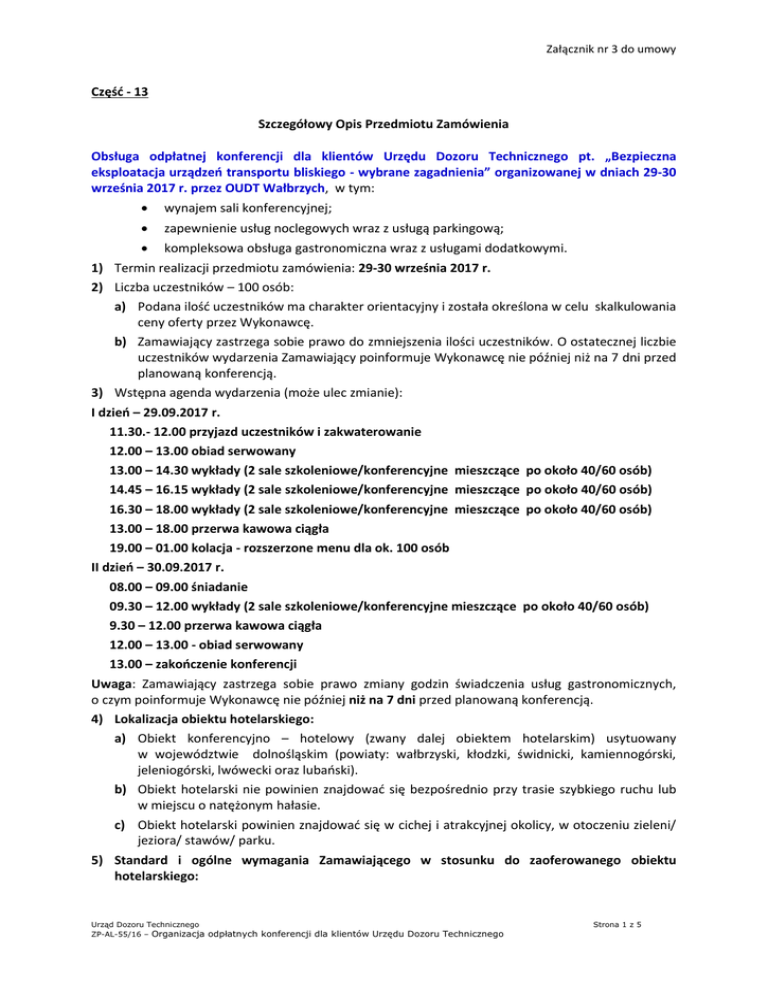 Załącznik nr 3 do umowy Część - 13 Szczegółowy Opis Przedmiotu Zamówienia Obsługa odpłatnej konferencji dla klientów Urzędu Dozoru Technicznego pt. „Bezpieczna eksploatacja urządzeń transportu bliskiego - wybrane zagadnienia” organizowanej w dniach 29-30 września 2017 r. przez OUDT Wałbrzych, w tym: wynajem sali konferencyjnej; zapewnienie usług noclegowych wraz z usługą parkingową; kompleksowa obsługa gastronomiczna wraz z usługami dodatkowymi. 1) Termin realizacji przedmiotu zamówienia: 29-30 września 2017 r. 2) Liczba uczestników – 100 osób: a) Podana ilość uczestników ma charakter orientacyjny i została określona w celu skalkulowania ceny oferty przez Wykonawcę. b) Zamawiający zastrzega sobie prawo do zmniejszenia ilości uczestników. O ostatecznej liczbie uczestników wydarzenia Zamawiający poinformuje Wykonawcę nie później niż na 7 dni przed planowaną konferencją. 3) Wstępna agenda wydarzenia (może ulec zmianie): I dzień – 29.09.2017 r. 11.30.- 12.00 przyjazd uczestników i zakwaterowanie 12.00 – 13.00 obiad serwowany 13.00 – 14.30 wykłady (2 sale szkoleniowe/konferencyjne mieszczące po około 40/60 osób) 14.45 – 16.15 wykłady (2 sale szkoleniowe/konferencyjne mieszczące po około 40/60 osób) 16.30 – 18.00 wykłady (2 sale szkoleniowe/konferencyjne mieszczące po około 40/60 osób) 13.00 – 18.00 przerwa kawowa ciągła 19.00 – 01.00 kolacja - rozszerzone menu dla ok. 100 osób II dzień – 30.09.2017 r. 08.00 – 09.00 śniadanie 09.30 – 12.00 wykłady (2 sale szkoleniowe/konferencyjne mieszczące po około 40/60 osób) 9.30 – 12.00 przerwa kawowa ciągła 12.00 – 13.00 - obiad serwowany 13.00 – zakończenie konferencji Uwaga: Zamawiający zastrzega sobie prawo zmiany godzin świadczenia usług gastronomicznych, o czym poinformuje Wykonawcę nie później niż na 7 dni przed planowaną konferencją. 4) Lokalizacja obiektu hotelarskiego: a) Obiekt konferencyjno – hotelowy (zwany dalej obiektem hotelarskim) usytuowany w województwie dolnośląskim (powiaty: wałbrzyski, kłodzki, świdnicki, kamiennogórski, jeleniogórski, lwówecki oraz lubański). b) Obiekt hotelarski nie powinien znajdować się bezpośrednio przy trasie szybkiego ruchu lub w miejscu o natężonym hałasie. c) Obiekt hotelarski powinien znajdować się w cichej i atrakcyjnej okolicy, w otoczeniu zieleni/ jeziora/ stawów/ parku. 5) Standard i ogólne wymagania Zamawiającego w stosunku do zaoferowanego obiektu hotelarskiego: Urząd Dozoru Technicznego ZP-AL-55/16 – Organizacja odpłatnych konferencji dla klientów Urzędu Dozoru Technicznego Strona 1 z 5 a) Wykonawca zapewni realizację usług w obiekcie hotelarskim o standardzie min trzech gwiazdek, tzn. zapewniony obiekt hotelarski musi spełniać kryteria określone dla hoteli co najmniej trzygwiazdkowych – *** zgodnie z załącznikiem nr 1 do Rozporządzenia Ministra Gospodarki i Pracy z dnia 19 sierpnia 2004 r. w sprawie obiektów hotelarskich i innych obiektów, w których są świadczone usługi hotelarskie (Dz. U. z 2006 r. Nr 22, poz.169 z pózn.zm.) b) Obiekt hotelarski powinien być oddany do użytku lub wyremontowany nie wcześniej niż 10 lat przed dniem opublikowania niniejszego postępowania. c) Obiekt hotelarski nie może być w trakcie prac remontowych w czasie realizacji usług, tj. w czasie konferencji. d) Jeśli w obiekcie hotelarskim, w terminie realizacji przedmiotu zamówienia, będzie jednocześnie organizowana inna impreza/konferencja, nie może ona w jakikolwiek sposób kolidować lub wpływać na przebieg konferencji Zamawiającego, komfort uczestników, identyfikację konferencji Zamawiającego, czy w inny sposób powodować np. hałas, mieszanie się uczestników, połączenie oznaczeń, stoisk czy punktów rejestracji uczestników itp. e) Wykonawca zobligowany jest do świadczenia usługi konferencyjnej i gastronomicznej oraz noclegowej w tym samym obiekcie (dopuszczalne jest kilka budynków pod tym samym adresem z dogodnym przejściem z jednego budynku do drugiego). f) Na terenie obiektu – bar/restauracja do skorzystania przez uczestników konferencji we własnym zakresie (zakup napojów zimnych, gorących, alkoholowych, przekąsek). 6) Wykonawca zapewni obiekt hotelarski spełniający poniższe szczegółowe wymagania: a) Odpowiednia ilości pokoi do ułożenia grupy max 100 osób, w tym do 30 osób do ułożenia w pokojach jednoosobowych lub dwuosobowych z możliwością pojedynczego wykorzystania (WAŻNE) oraz odpowiednio do 70 osób do ułożenia w pokojach dwuosobowych, tj. do 35 pokoi dwuosobowych z dwoma oddzielnymi łóżkami (WAŻNE). Wszystkie pokoje posiadające standard minimum *** (trzygwiazdkowy) - zgodnie z załącznikiem nr 1 do Rozporządzenia Ministra Gospodarki i Pracy z dnia 19 sierpnia 2004 r. w sprawie obiektów hotelarskich i innych obiektów, w których są świadczone usługi hotelarskie (Dz. U. z 2006 r. Nr. 22, poz. 169, z późn. zm.). zm.) Uwaga: Zamawiający może, w uzgodnieniu z Wykonawcą, zamówić usługi noclegowe w dobie hotelowej poprzedzającej dzień rozpoczęcia konferencji, lub dobie następującej po ostatnim dniu konferencji, w miarę dostępności pokoi w obiekcie hotelarskim. Sumaryczna liczba noclegów w ramach realizowanych usług nie przekroczy 100. b) Sale konferencyjne: - dwie sale konferencyjne (wykłady w trakcie konferencji odbywać się będą w dwóch równocześnie prowadzonych blokach szkoleniowych) : - sale swobodnie mieszczące po około: a) pierwsza sala 60 osób, b) druga sala 40 osób, w ustawieniu teatralnym lub w podkowę po zewnętrznej stronie (ustawienie sali w każdym dniu do uzgodnienia z Zamawiającym); - wyposażone w nagłośnienie, stół prezydialny, rzutnik multimedialny, ekran (dobrze widoczny z każdego miejsca sali), tablicę (papierową lub tablicę białą sucho ścieralną), markery do tablicy; - preferowane jest, by sala miała dwa wyjścia - z przodu i z tyłu; -