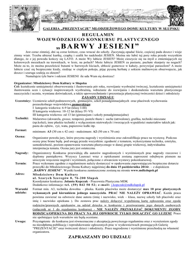 GALERIA „PREZENTACJE” MŁODZIEŻOWEGO DOMU KULTURY W SŁUPSKU REGULAMIN WOJEWÓDZKIEGO KONKURSU PLASTYCZNEGO „BARWY JESIENI” Jest coraz zimniej, dni są coraz krótsze, czas wracać do szkoły. Zaczynają opadać liście, częściej pada deszcz i wieje zimny wiatr. Trzeba ubierać kurtkę, czapkę i szalik bo nadchodzi JESIEŃ. Można nie lubić tej pory roku przede wszystkim dlatego, że z jej powodu kończy się LATO. A może Wy lubicie JESIEŃ? Może cieszycie się na myśl o zmieniających się kolorowych mozaikach na trawnikach, w lesie, na polach? Może lubicie JESIEŃ za pasiaste, puchate skarpety na nogach? Może za to, że można poszeleścić butami w barwnych liściach, ubłocić gumowce w kałuży, powywijać parasolem? A może lubicie czuć się bezpiecznie kiedy, siedząc w ciepłym pokoju, pijąc pyszną herbatę z sokiem malinowym obserwujecie, jak deszcz i szaruga szaleją za oknem? Namalujcie tyle barw i odcieni JESIENI ile uda Wam się dostrzec! Organizator: Młodzieżowy Dom Kultury w Słupsku Cel: kształcenie umiejętności obserwowania i ilustrowania pór roku, rozwijanie wyobraźni twórczej, kształcenie umiejętności ilustrowania scen i sytuacji inspirowanych wyobraźnią, wdrażanie do rozwijania i doskonalenia warsztatu plastycznego nauczyciela i ucznia, wymiana doświadczeń, a także upowszechnianie i prezentacja plastycznej twórczości dzieci i młodzieży ZASADY UDZIAŁU Uczestnicy: Uczniowie szkół podstawowych, gimnazjów, szkół ponadgimnazjalnych oraz placówek wychowania pozaszkolnego województwa pomorskiego: I kategoria wiekowa: 6-9 lat (klasy I-III) II kategoria wiekowa: 10-12 lat (klasy IV-VI) III kategoria wiekowa: od 13 lat (gimnazjum i szkoły ponadgimnazjalne) Techniki: Malarstwo (akwarela, gwasz, tempera), pastele tłuste i suche (utrwalone), grafika, techniki mieszane (np.kolaż), inne płaskie techniki z wyłączeniem nietrwałych i tworzących wypukłości materiałów takich jak: pasta do zębów, ryż, wata, papierowe kulki itp. Format: minimum: A3 (30 cm x 42 cm) - maksimum: A2 (50 cm x 70 cm) Ocena: Organizator powoła jury, które przyzna nagrody i wyróżnienia oraz zakwalifikuje prace na wystawę. Podczas oceny prac brane będą pod uwagę przede wszystkim: zgodność z tematem, wykorzystana technika, estetyka, samodzielność, poziom opanowania warsztatu plastycznego w danej grupie wiekowej, indywidualna interpretacja tematu. Ocena jury jest ostateczna. Nagrody: Organizatorzy Konkursu przewidują dla autorów nagrodzonych i wyróżnionych prac nagrody rzeczowe i dyplomy pamiątkowe. Wszyscy Laureaci wraz z opiekunami zostaną zaproszeni odrębnym pismem na uroczyste wręczenie nagród i wyróżnień, połączone z otwarciem wystawy pokonkursowej. Prace wykonane zgodnie z regulaminem należy dostarczyć w opakowaniu zapewniającym bezpieczne dotarcie przesyłki do Młodzieżowego Domu Kultury najpóźniej do dnia 15 października 2014r. – z dopiskiem „BARWY JESIENI”. Wyniki konkursu zamieszczone zostaną na stronie www.mdkslupsk.pl M ło dzie żo w y Do m K ult ury ul. S za ry c h Sze reg ó w 8 , 7 6 - 2 0 0 S łu p s k Koordynator konkursu: Jolanta Kopczak - Pracownia Plastyczna MDK Dodatkowe informacje: t el. ( 5 9 ) 8 4 2 5 0 5 2 ; e- ma il: [email protected] Format min. A3, technika dowolna – płaska. Każda placówka może dostarczyć max 10 prac plastycznych wykonanych pod kierunkiem jednego nauczyciela. PRAC NIE NALEŻY OPRAWIAĆ. Każda praca powinna zawierać na odwrocie dane autora (imię i nazwisko, wiek – klasa, nazwę szkoły lub placówki oraz imię i nazwisko opiekuna ). Do zestawu prac należy dołączyć wypełnioną kartę zgłoszenia oraz zgodę rodziców/prawnych opiekunów na udział dziecka w konkursie i przetwarzanie jego danych osobowych (załącznik nr 1 do regulaminu konkursu) - NIE NALEŻY PRZYKLEJAĆ DOKUMENTU ZGODY RODZICA/OPIEKUNA DO PRACY NA JEJ ODWROCIE TYLKO DOŁĄCZYĆ GO LUZEM! Prace nie spełniające tych warunków nie będą oceniane. Przystąpienie do konkursu jest równoznaczne z akceptacją powyższego regulaminu oraz z wyrażeniem zgody na nieodpłatną publikację i reprodukowanie zgłoszonych prac w wydawnictwach promujących Galerię "PREZENTACJE" oraz twórczość dzieci i młodzieży. Prace nagrodzone i wyróżnione przechodzą na własność organizatora. Termin: Adres: Warunki udziału: Uwaga: ZAPRASZAMY DO UDZIAŁU KARTA ZGŁOSZENIA DO WOJEWÓDZKIEGO KONKURSU PLASTYCZNEGO BARWY JESIENI 1. Adres szkoły / placówki ……………………………………………………………………………………… 2. Nr telefonu / faxu ……………………………………………………………………………………… 3. Adres e-mail ……………………………………………………………………………………… 4. Imię i nazwisko nauczyciela ……………………………………………………………………………………… LISTA UCZESTNIKÓW Imię i nazwisko autora, wiek , grupa wiekowa 1. ……………………………………………………………………………………… 2. ……………………………………………………………………………………… 3. ……………………………………………………………………………………… 4. ……………………………………………………………………………………… 5. ……………………………………………………………………………………… 6. ……………………………………………………………………………………… 7. ……………………………………………………………………………………… 8. ……………………………………………………………………………………… 9. ……………………………………………………………………………………… 10. ………