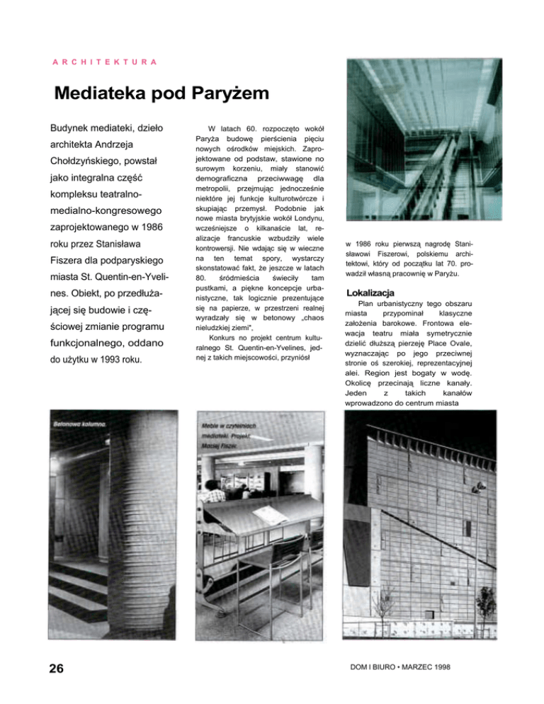 A R C H I T E K T U R A Mediateka pod Paryżem Budynek mediateki, dzieło architekta Andrzeja Chołdzyńskiego, powstał jako integralna część kompleksu teatralnomedialno-kongresowego zaprojektowanego w 1986 roku przez Stanisława Fiszera dla podparyskiego miasta St. Quentin-en-Yvelines. Obiekt, po przedłużającej się budowie i częściowej zmianie programu funkcjonalnego, oddano do użytku w 1993 roku. 26 W latach 60. rozpoczęto wokół Paryża budowę pierścienia pięciu nowych ośrodków miejskich. Zaprojektowane od podstaw, stawione no surowym korzeniu, miały stanowić demograficzna przeciwwagę dla metropolii, przejmując jednocześnie niektóre jej funkcje kulturotwórcze i skupiając przemysł. Podobnie jak nowe miasta brytyjskie wokół Londynu, wcześniejsze o kilkanaście lat, realizacje francuskie wzbudziły wiele kontrowersji. Nie wdając się w wieczne na ten temat spory, wystarczy skonstatować fakt, że jeszcze w latach 80. śródmieścia świeciły tam pustkami, a piękne koncepcje urbanistyczne, tak logicznie prezentujące się na papierze, w przestrzeni realnej wyradzały się w betonowy „chaos nieludzkiej ziemi", Konkurs no projekt centrum kulturalnego St. Quentin-en-Yvelines, jednej z takich miejscowości, przyniósł w 1986 roku pierwszą nagrodę Stanisławowi Fiszerowi, polskiemu architektowi, który od początku lat 70. prowadził własną pracownię w Paryżu. Lokalizacja Plan urbanistyczny tego obszaru miasta przypominał klasyczne założenia barokowe. Frontowa elewacja teatru miała symetrycznie dzielić dłuższą pierzeję Place Ovale, wyznaczając po jego przeciwnej stronie oś szerokiej, reprezentacyjnej alei. Region jest bogaty w wodę. Okolicę przecinają liczne kanały. Jeden z takich kanałów wprowadzono do centrum miasta DOM l BIURO • MARZEC 1998 i przed przyszłą elewacją mediateki powstało malownicze lustro wody. Zmiana programu Szkic konkursowy zakładał połączenie w zwarty zespół architektoniczny kilku instytucji: teatru z widownią na 1200 osób, warsztatów teatralnych z 300-osobowym audytorium, centrum konferencyjnego, studia audiowizualnego, kina, sklepów i restauracji. Procesy ekonomiczne drugiej polowy lat 80. i polityka agend rządowych kontrolujących rozwój aglomeracji paryskiej doprowadziły do zmiany tego programu. Miejsce centrum konferencyjnego oraz studia audiowizualnego zajęła mediateka, stanowiąc jakby boczną, niższą nawę głównego korpusu budowli, Mimo że decyzje podejmowano w zbiurokratyzowanym trybie administracyjnym, z czasem okazały się słuszne. Teatr uzyskał status sceny na- DOM l BIURO • MARZEC 1998 27 A R C H I T E K T U R A rodowej i spore dotacje, a mediateka jest miejscem chętnie odwiedzanym przez mieszkańców nowego miasta. Projekt wykonawczy W chwili podjęcia decyzji o budowie mediateki (1990) na podstawie nowego projektu wykonanego przez Andrzeja Chołdzyńskiego, wcześniejszy projekt konkursowy teatru był już ze względów oszczędnościowych dokładnie oczyszczony z detali architektonicznych. Mimo to budowę rozpoczęto natychmiast. Andrzej Chołdzyński podjął się misji opracowania tzw. projektu wykonawczego dla mediateki i teatru niejako z marszu. W praktyce oznaczało to, że już w trakcie prac budowlanych architekt przywracał strukturom betonowo-blaszanego hangaru mediateki walor dzieła plastycznego, na gorąco rozrysowując kolejne detale i wykorzystując właściwości estetyczne stosowanych tam materiałów: żelbetu, stali i szkła. Dziedziniec wodny Mediateka otrzymała industrialną elewację z dużymi przeszkleniami i szeregiem stalowych przypór, pod którymi biegnie galeria widokowa, Wejście na trzecią kondygnację składa się ze stalowej konstrukcji wspartej na bazie żelbetowych, teatralnie rozszerzających się schodów dolnych. Natomiast szerokie, kamienne stopnie znajdujące się z prawej strony pozwalają pokonać dużą różnicę wysokości między placem mediateki (poziom lustra wody) a zewnętrznym westybulem teatru i Placem Owalnym. W lecie i jedne i, drugie schody tworzą wielkie audytorium, w którym chętnie gromadzi się młodzież. W efekcie mediateka, która pierwotnie miała znajdować się w innym punkcie miasta, nie tylko 28 DOM l BIURO • MARZEC 1998 pomogła uratować plan finansowania całej inwestycji teatralnej, lecz także przyczyniła się do wzmocnienia kulturotwórczej roli tego obszaru miasta. Wnętrza mediateki Architektura wnętrz jest surowa, wykorzystująca naturalne właściwości materiałów konstrukcyjnych. Odkrytą, stalową więźbę kolebkowego dachu polakierowano proszkowo na zielonografitowy kolor. Krawędź antresoli uzyskała wykończenie z surowej, odtłuszczonej, a następnie zawerniksowanej stali, Betonowe kolumny odlewano, używając jako szalowania metalowej obudowy przewodów wentylacyjnych. Ich spiralny ornament zdobi teraz zarówno wnętrza mediateki, jak i samego teatru. DOM l BIURO • MARZEC 1998 29 A R C H I T E K T U R A skowcem sprowadzonym z kamieniołomu Brenna w Polsce. Wówczas dwukrotnie tańszy od dostępnego we Francji kamienia, wydobywany w górach, a więc odporny na gwałtowne zmiany temperatur, znakomicie sprawdził się w warunkach stosunkowo surowego mikroklimatu St. Quentin-en-Yvelines, Nigdy wcześniej nie był używany w dużych płytach (100 x 60 cm), a bloki z nieregularnie ociosaną powierzchnią traktowane były w kamieniołomie wręcz jako odpady. W ten sposób uratowaliśmy teatr przed zeszpeceniem jego elewacji brzydkimi, plastikowymi płytkami, które wydawały się francuskim kosztorysantom jedynym materiałem możliwym do zastosowania w warunkach skromnego budżetu. Architektura... Wobec koniecznych oszczędności poszukiwano rozwiązań niekonwencjonalnych. Proste, lecz niezwykle wysmakowane meble ze stali, służące lekturze w pozycji półstojącej, to dzieło Macieja Fiszera. Teatr Scenę wielką zdobi barwna kurtyna opracowana przez Annę Fiszer, matkę głó