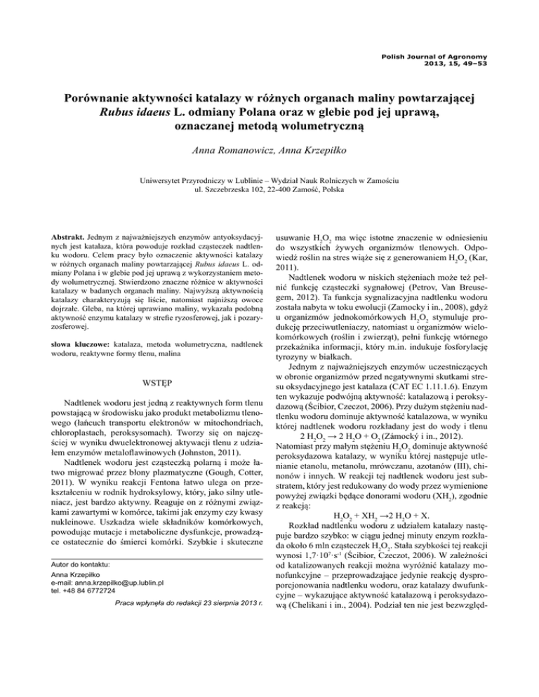 49 Polish Journal of Agronomy 2013, 15, 49–53 Porównanie aktywności katalazy w różnych organach maliny powtarzającej Rubus idaeus L. odmiany Polana oraz w glebie pod jej uprawą, oznaczanej metodą wolumetryczną Anna Romanowicz, Anna Krzepiłko Uniwersytet Przyrodniczy w Lublinie – Wydział Nauk Rolniczych w Zamościu ul. Szczebrzeska 102, 22-400 Zamość, Polska Abstrakt. Jednym z najważniejszych enzymów antyoksydacyjnych jest katalaza, która powoduje rozkład cząsteczek nadtlenku wodoru. Celem pracy było oznaczenie aktywności katalazy w różnych organach maliny powtarzającej Rubus idaeus L. odmiany Polana i w glebie pod jej uprawą z wykorzystaniem metody wolumetrycznej. Stwierdzono znaczne różnice w aktywności katalazy w badanych organach maliny. Najwyższą aktywnością katalazy charakteryzują się liście, natomiast najniższą owoce dojrzałe. Gleba, na której uprawiano maliny, wykazała podobną aktywność enzymu katalazy w strefie ryzosferowej, jak i pozaryzosferowej. słowa kluczowe: katalaza, metoda wolumetryczna, nadtlenek wodoru, reaktywne formy tlenu, malina WSTĘP Nadtlenek wodoru jest jedną z reaktywnych form tlenu powstającą w środowisku jako produkt metabolizmu tlenowego (łańcuch transportu elektronów w mitochondriach, chloroplastach, peroksysomach). Tworzy się on najczęściej w wyniku dwuelektronowej aktywacji tlenu z udziałem enzymów metaloflawinowych (Johnston, 2011). Nadtlenek wodoru jest cząsteczką polarną i może łatwo migrować przez błony plazmatyczne (Gough, Cotter, 2011). W wyniku reakcji Fentona łatwo ulega on przekształceniu w rodnik hydroksylowy, który, jako silny utleniacz, jest bardzo aktywny. Reaguje on z różnymi związkami zawartymi w komórce, takimi jak enzymy czy kwasy nukleinowe. Uszkadza wiele składników komórkowych, powodując mutacje i metaboliczne dysfunkcje, prowadzące ostatecznie do śmierci komórki. Szybkie i skuteczne Autor do kontaktu: Anna Krzepiłko e-mail: [email protected] tel. +48 84 6772724 Praca wpłynęła do redakcji 23 sierpnia 2013 r. usuwanie H2O2 ma więc istotne znaczenie w odniesieniu do wszystkich żywych organizmów tlenowych. Odpowiedź roślin na stres wiąże się z generowaniem H2O2 (Kar, 2011). Nadtlenek wodoru w niskich stężeniach może też pełnić funkcję cząsteczki sygnałowej (Petrov, Van Breusegem, 2012). Ta funkcja sygnalizacyjna nadtlenku wodoru została nabyta w toku ewolucji (Zamocky i in., 2008), gdyż u organizmów jednokomórkowych H2O2 stymuluje produkcję przeciwutleniaczy, natomiast u organizmów wielokomórkowych (roślin i zwierząt), pełni funkcję wtórnego przekaźnika informacji, który m.in. indukuje fosforylację tyrozyny w białkach. Jednym z najważniejszych enzymów uczestniczących w obronie organizmów przed negatywnymi skutkami stresu oksydacyjnego jest katalaza (CAT EC 1.11.1.6). Enzym ten wykazuje podwójną aktywność: katalazową i peroksydazową (Ścibior, Czeczot, 2006). Przy dużym stężeniu nadtlenku wodoru dominuje aktywność katalazowa, w wyniku której nadtlenek wodoru rozkładany jest do wody i tlenu 2 H2O2 → 2 H2O + O2 (Zámocký i in., 2012). Natomiast przy małym stężeniu H2O2 dominuje aktywność peroksydazowa katalazy, w wyniku której następuje utlenianie etanolu, metanolu, mrówczanu, azotanów (III), chinonów i innych. W reakcji tej nadtlenek wodoru jest substratem, który jest redukowany do wody przez wymienione powyżej związki będące donorami wodoru (XH2), zgodnie z reakcją: H2O2 + XH2 →2 H2O + X. Rozkład nadtlenku wodoru z udziałem katalazy następuje bardzo szybko: w ciągu jednej minuty enzym rozkłada około 6 mln cząsteczek H2O2. Stała szybkości tej reakcji wynosi 1,7·107·s-1 (Ścibior, Czeczot, 2006). W zależności od katalizowanych reakcji można wyróżnić katalazy monofunkcyjne – przeprowadzające jedynie reakcję dysproporcjonowania nadtlenku wodoru, oraz katalazy dwufunkcyjne – wykazujące aktywność katalazową i peroksydazową (Chelikani i in., 2004). Podział ten nie jest bezwzględ- 50 Polish Journal of Agronomy, No. 15, 2013 ny, gdyż pierwszy typ może także przyspieszyć pewne reakcje utleniania związków organicznych zależne od H2O2 (Mhamdi i in., 2010). U organizmów eukariotycznych enzym ten jest homotetramerem o masie cząsteczkowej od 240 do 350 kDa. Każdy monomer zawiera jako grupę prostetyczną hem. Katalazy dwufunkcyjne, o aktywności katalazowej i peroksydazowej, w swoim składzie poza grupą hemową posiadają inne białka strukturalne, które występują m.in. u niektórych grzybów i prokariontów. Enzym składa się z czterech identycznych podjednostek o masie cząsteczkowej około 60 kDa. Każda z podjednostek ma centrum aktywne, zawierające układ hemowy z położonym centralnie atomem żelaza, związany w miejscu aktywnym pięcioma wiązaniami koordynacyjnymi (Gałecka i in., 2008). Poznano ponad 300 sekwencji genomu, zarówno enzymów jednofunkcyjnych o aktywności katalazy (> 225), jak i dwufunkcyjnych o aktywności katalazowej i peroksydazowej (> 50), a także katalazy zawierające mangan (> 25) (Chelikani i in., 2004). Obecność katalazy stwierdzono w różnych organellach komórkowych. Występuje między innymi w peroksysomach, mitochondriach, retikulum endoplazmatycznym, cytosolu. Ma strukturę specyficzną dla różnych typów komórek. W komórkach roślinnych wyizolowano trzy formy izoenzymatyczne katalazy: CAT-1 – występująca w miejscach obfitego powstawania H2O2: peroksysomach, glioksysomach i cytozolu, CAT-2 – usuwająca nadtlenek wodoru powstający podczas fotorespiracji, oraz CAT-3 – znajdująca się w mitochondriach i cytozolu (Czarna, Jarmuszkiewicz, 2006). Eukariotyczne katalazy są aktywne w szerokim zakresie pH (5,0–10,5). Optimum pH dla katalazy wnosi 7,0. Aktywność katalazy jest hamowana przez wiele związków chemicznych. Niekompetycyjnym inhibitorem aktywności katalazy jest siarczan miedzi, natomiast kompety