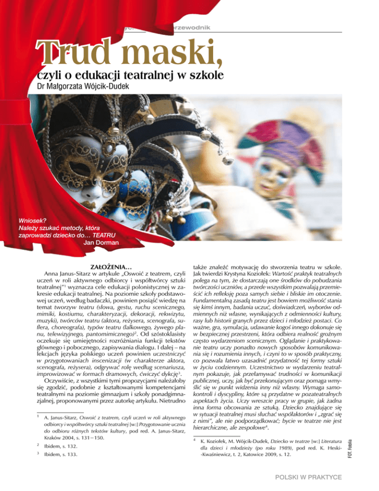 4 Jak uczyć – nauczyciel mistrz i przewodnik Trud maski, czyli o edukacji teatralnej w szkole Dr Małgorzata Wójcik-Dudek Wniosek? Należy szukać metody, która zaprowadzi dziecko do… TEATRU Jan Dorman 1 A. Janus-Sitarz, Oswoić z teatrem, czyli uczeń w roli aktywnego odbiorcy i współtwórcy sztuki teatralnej [w:] Przygotowanie ucznia do odbioru różnych tekstów kultury, pod red. A. Janus-Sitarz, Kraków 2004, s. 131−150. 2 Ibidem, s. 132. 3 Ibidem, s. 133. także znaleźć motywację do stworzenia teatru w szkole. Jak twierdzi Krystyna Koziołek: Wartość praktyk teatralnych polega na tym, że dostarczają one środków do pobudzania twórczości uczniów, a przede wszystkim pozwalają przemieścić ich refleksję poza samych siebie i bliskie im otoczenie. Fundamentalną zasadą teatru jest bowiem możliwość stania się kimś innym, badania uczuć, doświadczeń, wyborów odmiennych niż własne, wynikających z odmienności kultury, rasy lub historii granych przez dzieci i młodzież postaci. Co ważne, gra, symulacja, udawanie kogoś innego dokonuje się w bezpiecznej przestrzeni, która odbiera realność groźnym często wydarzeniom scenicznym. Oglądanie i praktykowanie teatru uczy ponadto nowych sposobów komunikowania się i rozumienia innych, i czyni to w sposób praktyczny, co pozwala łatwo uzasadnić przydatność tej formy sztuki w życiu codziennym. Uczestnictwo w wydarzeniu teatralnym pokazuje, jak przełamywać trudności w komunikacji publicznej, uczy, jak być przekonującym oraz pomaga wmyślić się w punkt widzenia inny niż własny. Wymaga samokontroli i dyscypliny, które są przydatne w pozateatralnych aspektach życia. Uczy wreszcie pracy w grupie, jak żadna inna forma obcowania ze sztuką. Dziecko znajdujące się w sytuacji teatralnej musi słuchać współaktorów i „zgrać się z nimi”, ale nie podporządkować; bycie w teatrze nie jest hierarchiczne, ale zespołowe4. 4 K. Koziołek, M. Wójcik-Dudek, Dziecko w teatrze [w:] Literatura dla dzieci i młodzieży (po roku 1989), pod red. K. Heski-Kwaśniewicz, t. 2, Katowice 2009, s. 12. Polski w praktyce FOT. Fotolia Założenia… Anna Janus-Sitarz w artykule „Oswoić z teatrem, czyli uczeń w roli aktywnego odbiorcy i współtwórcy sztuki teatralnej”1 wyznacza cele edukacji polonistycznej w zakresie edukacji teatralnej. Na poziomie szkoły podstawowej uczeń, według badaczki, powinien posiąść wiedzę na temat tworzyw teatru (słowa, gestu, ruchu scenicznego, mimiki, kostiumu, charakteryzacji, dekoracji, rekwizytu, muzyki), twórców teatru (aktora, reżysera, scenografa, suflera, choreografa), typów teatru (lalkowego, żywego planu, telewizyjnego, pantomimicznego)2. Od szóstoklasisty oczekuje się umiejętności rozróżniania funkcji tekstów głównego i pobocznego, zapisywania dialogu. I dalej – na lekcjach języka polskiego uczeń powinien uczestniczyć w przygotowaniach inscenizacji (w charakterze aktora, scenografa, reżysera), odgrywać rolę według scenariusza, improwizować w formach dramowych, ćwiczyć dykcję3. Oczywiście, z wszystkimi tymi propozycjami należałoby się zgodzić, podobnie z kształtowanymi kompetencjami teatralnymi na poziomie gimnazjum i szkoły ponadgimnazjalnej, proponowanymi przez autorkę artykułu. Nietrudno Kształcenie polonistyczne …a realizacja Jak teatr radzi sobie w trudnej rzeczywistości szkolnej? Małgorzata Puchowska, powołując się na przeprowadzone badania, twierdzi, że współczesna szkoła jedynie teatr toleruje. Owszem, szkoła domaga się niekiedy od pracowników jego prowadzenia i, nie zapewniając pomocy ani organizacyjnej, ani finansowej, oczekuje wyników w postaci spektaklu, którym potem może pochwalić się w sprawozdaniu5. A przecież szkolny teatr ma w Polsce długą tradycję sięgającą średniowiecza. Szczególną rolę w rozwoju teatru szkolnego odegrały zakony, początkowo jezuickie, a potem pijarskie. Jak można się domyślać, to właśnie zakony odkryły możliwości wychowawcze teatru szkolnego6. Od natrętnego dydaktyzmu odciął się teatr działający przy Collegium Nobilium. Wystawiano wówczas sztuki Corneille’a, Racine’a i Woltera. Zadziwiający wydaje się dziś fakt, że teatr szkolny w okresie, gdy w Polsce nie funkcjonowała scena zawodowa, stał się przestrzenią kontaktu widzów z dramaturgią europejską. Nie do przecenienia jest rola teatru szkolnego podczas zaborów. Wiele z przygotowywanych przedstawień wpisywało się w paradygmat polskiego patriotyzmu i skutecznie pełniło rolę politycznej agory. Niesłychanie popularne były „Wieczory Mickiewiczowskie”, rozszerzone później na „Wieczory Trzech Wieszczów”, które od roku 1878, za przykładem Gimnazjum im. Bartłomieja Nowodworskiego w Krakowie, upowszechniły się na terenie całego kraju7. Od 1920 r. ukazywało się czasopismo „Teatr Ludowy”, którego dwa numery są poświęcone w całości teatrowi szkolnemu (1922, nr 3 i 1923, nr 6). Czasopismo wielokrotnie podkreślało wartość teatru młodych. Zamieszczano w nim opinie wybitnych znawców zagadnienia – A. Appii, radzącego szanować twórczość dziecka dokonującą się bez widzów, czy E.M. Gilpina i N. MacMunna, twierdzących, że sztuka dziecięca, o ile nie powstaje pod wpływem dorosłych, zawsze jest piękna. Za prawdziwą rewolucję w teatrze szkolnym uznaje się pracę „Teatr szkolny” Lucjusza Komarnickiego, wydaną w 1926 r. Autor z niepokojem wskazywał na grafomańskie sztuki przeznaczone dla dzieci i młodzieży. Nie dostrzegał także powodów, dla których arcydzieła literatury powszechnej powinny być prezentowane widowni dziecięcej. Za to 5 M. Puchowska, Komu potrzebny jest teatr szkolny? [w:] Dziecko i teatr w przestrzeni kultury, pod red. M. Karasińskiej, G. Leszczyńskiego, t. 2, Poznań 2007, s. 114. Zob. też: T. Broś, Teatr szkolny. Jaki jest? Jaki być powinien?, „Problemy Opiekuńczo-Wychowawcze” 1996, nr 4. 6 W 