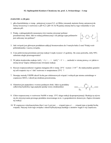 52. Ogólnopolski Konkurs Chemiczny im. prof. A. Swinarskiego – I etap ZADANIE A (20 pkt) 1. pKa fenoloftaleiny w temp. pokojowej wynosi 9,3. a) Oblicz stosunek stężenia formy anionowej do formy kwasowej w roztworze o pH=8,2 i pH=10. b) Wyjaśnij zmianę barwy tego wskaźnika w tym zakresie pH. 2. Podaj, z jakiego(jakich) monomeru (ów) można otrzymać polimer przedstawiony obok. Jaki to rodzaj polimeryzacji i do jakiego typu polimerów jest zaliczany ten polimer? 3. Jaki związek jest głównym produktem addycji bromowodoru do 5-metylo-heks-2-enu? Podaj wzór półstrukturalny i nazwę związku. 4. Czas połowicznej przemiany pewnej reakcji I rzędu wynosi 1,5 godziny. Ile czasu potrzeba, żeby 94% substratu uległo przereagowaniu? 5. W jakim środowisku reakcja AsO2– + I2 + … = AsO43– + I– + … zachodzi w stronę prawą, a w jakim w stronę lewą? Zapisz zbilansowane równanie reakcji. 6. Iloczyn rozpuszczalności węglanu manganu (II) w temp. 25 C wynosi 2∙10-11. Ile maksymalnie gramów tej soli rozpuści się w 1 dm3 roztworu w temperaturze 25 C ? 7. Stosując metodę VSEPR określ liczbę par elektronowych wiązań i wolnych par atomu centralnego w cząsteczce SOCl2 i określ jej strukturę przestrzenną. 8. Glutation jest peptydem o wzorze podanym obok. Jakie są produkty całkowitej hydrolizy tego peptydu (podaj wzory strukturalne) 9. Chlor rozpuszczony w roztworze NaOH w temp. 15 C ulega reakcji dysproporcjonacji. Reakcję tę używa się do otrzymywania pewnego produktu stosowanego m.in. w gospodarstwie domowym. Zapisz równanie tej reakcji. 10. W cząsteczce winyloacetylenu (but-1-en-3-yn) jest …. wiązań typu i …. wiązań typu (podaj liczbę wiązań). Narysuj wzór tego związku i określ hybrydyzację każdego z atomów węgla w tej cząsteczce. ZADANIE B (15 pkt) Związek A zawiera 2,23% wodoru, 26,67% węgla i 71,10% tlenu (% wag). Podczas miareczkowania próbki 0,112 g tego związku roztworem KOH o stężeniu 0,2500 mol/dm3 otrzymano krzywą jak na rysunku obok. 1) Wyznacz empiryczny wzór związku A. 2) Na podstawie wyników miareczkowania oblicz masę molową związku A i podaj jego wzór sumaryczny. 3) Produktami reakcji związku A z K2Cr2O7 w środowisku kwaśnym są jony chromu (III) oraz tlenek węgla (IV). Napisz zbilansowane równanie tej reakcji w formie jonowej oraz opisz, jak zmieni się barwa roztworu podczas tej reakcji. 4) Jaka objętość tlenku węgla (IV) powstanie w temperaturze 20 C i przy ciśnieniu 990 hPa, gdy 0,451 g związku A przereaguje z nadmiarem K2Cr2O7? Uwaga: Załóż, że tlenek węgla (IV) można potraktować jak gaz idealny. ZADANIE C (20 pkt) Węgiel i tlenek węgla (IV) umieszczono w zbiorniku o pojemności 2,0 dm3 w temperaturze 1160 K. W zbiorniku zaszła reakcja według równania: C(s) + CO2(g) 2CO(g) W czasie procesu mierzono ciśnienie w zbiorniku. Po osiągnięciu równowagi pozostała jeszcze pewna ilość węgla. Wyniki pomiarów zestawiono w tabeli poniżej: Czas [godziny] Całkowite ciśnienie w zbiorniku [bar] 1) 2) 3) 4) 5) 0,0 5,00 2,0 6,26 4,0 7,09 6,0 7,75 8,0 8,50 10,0 8,50 Zapisz wyrażenie na stałą równowagi, Kp, tej reakcji. Oblicz początkową liczbę moli tlenku węgla (IV) (załóż, że objętość stałego węgla można pominąć). W stanie równowagi w tej temperaturze cząstkowe ciśnienie CO2(g) w mieszaninie reakcyjnej wyniosło 1,60 bara. Oblicz cząstkowe ciśnienie tlenku węgla (II) oraz stałą równowagi reakcji, Kp. Oblicz entalpię reakcji C(s) + CO2(g) → 2 CO(g) i określ, w jaki sposób obniżenie temperatury reakcji wpłynie na stan równowagi tej reakcji: równowaga przesunie się w stronę produktu, cofnie w stronę substratów, nie ulegnie zmianie. C(s) + ½ O2(g) → CO(g) H = -110,0 kJ C(s) + O2(g) → CO2(g) H = -394,0 kJ W innym eksperymencie dotyczącym tej samej reakcji zbiornik poj. 2,0 dm3 zawierał początkowo 10,0 g C(s) oraz CO(g) i CO2(g) , których ciśnienia cząstkowe wynosiły 2,00 bary (każdego z nich) w temp. 1160 K. Czy ciśnienie cząstkowe CO2(g) zmniejszy się, zwiększy czy pozostanie bez zmian po osiągnięciu stanu równowagi? Uzasadnij odpowiedź obliczeniami. Uwaga: Załóż, że wszystkie gazy można potraktować jak gazy idealne. ZADANIE D (10 pkt) Wśród związków o wzorze sumarycznym C4H10O są cztery izomery konstytucyjne, należące do grupy alkoholi. Rzędowość alkoholi można określić na podstawie reakcji, jakim ulegają. Oprócz analizy produktów takich reakcji jak utlenianie pomocne mogą okazać się inne reakcje, jak Lucasa (reakcji z chlorkiem cynku w stężonym kwasie solnym w temperaturze pokojowej), oraz reakcja jodoformowa, stosowana najczęściej do identyfikacji metyloketonów H3C-CO-, a której ulegają również alkohole, zawierające grupę –OH w podobnym położeniu. 1) Narysuj wzory półstrukturalne i podaj nazwy systematyczne oraz zwyczajowe tych alkoholi. Wskaż, które z nich są optycznie czynne i narysuj wzory ich enancjomerów. 2) O alkoholach A, B, C i D wiadomo, że: a) Alkohol A można otrzymać m.in. w reakcji addycji wody do but-1-enu. b) W reakcji z dichromianem (VI) potasu w przypadku związków A, B i D następuje zmiana zabarwienia na zielone, alkohol C nie reaguje. c) Alkohol C w próbie Lucasa reaguje szybko, powstaje zmętnienie roztworu. W przypadku alkoholu A zmętnienie występuje po dłuższym czasie, związki B i D nie reagują. d) Alkohol A ulega reakcji jodoformowej (alkaliczny roztwór jodu w jodku potasu) z wtrąceniem żółtego osadu trijodometanu. Pozostałe alkohole nie reagują. e) Temperatury wrzenia alkoholi A-D podane są w tabeli niżej. Alkohol B ma nieco wyższe napięcie powierzchniowe i wyższą lepkość niż D. Alkohol A B C D 98-100 108 82-83 116-119 Twrz , C Na podstawie podanych w p.2. informacji zidentyfikuj alkohole A, B, C i D. Podaj symbol, nazwę alkoholu oraz wyjaśnij swój tok rozumowania podczas identyfikacji związków, podając, które informacje pozwol