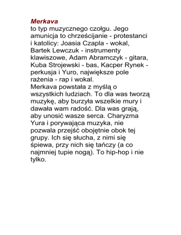 Merkava to typ muzycznego czołgu. Jego amunicja to chrześcijanie - protestanci i katolicy: Joasia Czapla - wokal, Bartek Lewczuk - instrumenty klawiszowe, Adam Abramczyk - gitara, Kuba Strojewski - bas, Kacper Rynek perkusja i Yuro, największe pole raŜenia - rap i wokal. Merkava powstała z myślą o wszystkich ludziach. To dla was tworzą muzykę, aby burzyła wszelkie mury i dawała wam radość. Dla was grają, aby unosić wasze serca. Charyzma Yura i porywająca muzyka, nie pozwala przejść obojętnie obok tej grupy. Ich się słucha, z nimi się śpiewa, przy nich się tańczy (a co najmniej tupie nogą). To hip-hop i nie tylko.