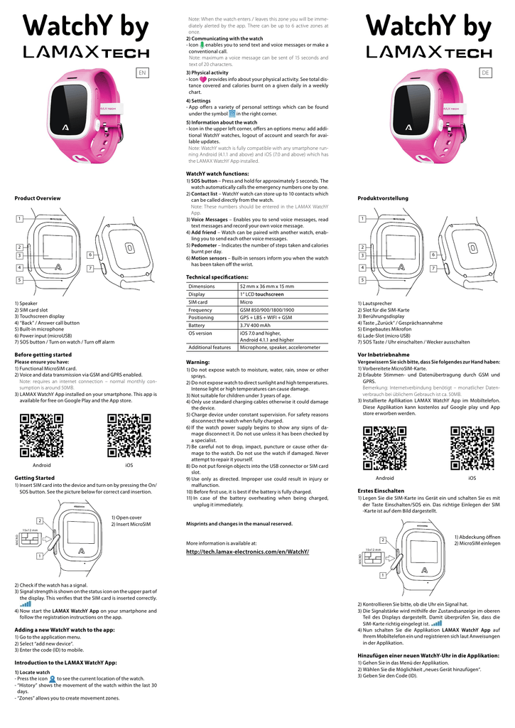 WatchY by EN WatchY by Note: When the watch enters / leaves this zone you will be immediately alerted by the app. There can be up to 6 active zones at once. 2) Communicating with the watch - Icon enables you to send text and voice messages or make a conventional call. Note: maximum a voice message can be sent of 15 seconds and text of 20 characters. DE 3) Physical activity - Icon provides info about your physical activity. See total distance covered and calories burnt on a given daily in a weekly chart. 4) Settings - App offers a variety of personal settings which can be found under the symbol in the right corner. 2 15x12 mm MICRO 3 1 Product Overview 1 2 15x12 mm MICRO 4 6 7 1 1) Speaker 2) SIM card slot 3) Touchscreen display 4) “Back” / Answer call button 5) Built-in microphone 6) Power input (microUSB) 7) S OS button / Turn on6 watch / Turn off alarm Before getting started 7 Please ensure you have: 1) Functional MicroSIM card. 2) Voice and data transmission via GSM and GPRS enabled. Note: requires an internet connection – normal monthly consumption is around 50MB. 3) L AMAX WatchY App installed on your smartphone. This app is available for free on Google Play and the App store. iOS Getting Started 1) Insert SIM card into the device and turn on by pressing the On/ SOS button. See the picture below for correct card insertion. 2 2 4 1) SOS button – Press and hold for approximately 5 seconds. The watch automatically calls the emergency numbers one by one. 2) C ontact list – WatchY watch can store up to 10 contacts which can be called directly from the watch. Note: These numbers should be entered in the LAMAX WatchY App. 3) Voice Messages – Enables you to send voice messages, read text messages and record your own voice message. 4) Add friend – Watch can be paired with another watch, enabling you to send each other voice messages. 5) Pedometer – Indicates the number of steps taken and calories burnt per day. 6) M otion sensors – Built-in sensors inform you when the watch has been taken off the wrist. 1) Open cover 2) Insert MicroSIM 1 5 Produktvorstellung 1 2 15x12 mm 2 3 4 Technical specifications: 5 Android 15x12 mm 3 5 3 2 WatchY watch functions: 4 2 1 MICRO 2 5) Information about the watch - Icon in the upper left corner, offers an options menu: add additional WatchY watches, logout of account and search for available updates. Note: WatchY watch is fully compatible with any smartphone running Android (4.1.1 and above) and iOS (7.0 and above) which has the LAMAX WatchY App installed. MICRO 1 6 7 1 5 Dimensions 52 mm x 36 mm x 15 mm Display 1“ LCD touchscreen SIM card Micro Frequency GSM 850/900/1800/1900 Positioning GPS + LBS + WIFI + GSM Battery 3.7V 400 mAh OS version iOS 7.0 and higher, Android 4.1.1 and higher Additional features Microphone, speaker, accelerometer 1) Lautsprecher 2) Slot für die SIM-Karte 3) Berührungsdisplay 4) Taste „Zurück“ / Gesprächsannahme 5) Eingebautes Mikrofon 6) Lade-Slot (micro USB) 7) SOS Taste / Uhr einschalten / Wecker ausschalten 6 Vor Inbetriebnahme 7 Warning: Vergewissern Sie sich bitte, dass Sie folgendes zur Hand haben: 1) Vorbereitete MicroSIM-Karte. 2) Erlaubte Stimmen- und Datenúbertragung durch GSM und GPRS. Bemerkung: Internetverbindung benötigt – monatlicher Datenverbrauch bei üblichem Gebrauch ist ca. 50MB. 3) Installierte Apllikation LAMAX WatchY App im Mobiltelefon. Diese Applikation kann kostenlos auf Google play und App store erworben werden. 1) Do not expose watch to moisture, water, rain, snow or other sprays. 2) Do not expose watch to direct sunlight and high temperatures. Intense light or high temperatures can cause damage. 3) Not suitable for children under 3 years of age. 4) Only use standard charging cables otherwise it could damage the device. 5) Charge device under constant supervision. For safety reasons disconnect the watch when fully charged. 6) If the watch power supply begins to show any signs of damage disconnect it. Do not use unless it has been checked by a specialist. 7) Be careful not to drop, impact, puncture or cause other damage to the watch. Do not use the watch if damaged. Never attempt to repair it yourself. 8) Do not put foreign objects into the USB connector or SIM card slot. 9) Use only as directed. Improper use could result in injury or malfunction. 10) Before first use, it is best if the battery is fully charged. 11) In case of the battery overheating when being charged, unplug it immediately. Android iOS Erstes Einschalten 1) Legen Sie die SIM-Karte ins Gerät ein und schalten Sie es mit der Taste Einschalten/SOS ein. Das richtige Einlegen der SIM -Karte ist auf dem Bild dargestellt. Misprints and changes in the manual reserved. 1 MICRO 15x12 mm 2 More information is available at: 15x12 mm 2 http://tech.lamax-electronics.com/en/WatchY/ MICRO 1 3 4 2) Check if the watch has a signal. 3) Signal strength is shown on the status icon on the upper part of the display. This verifies that the SIM card is inserted correctly. 1 5 4) Now start the LAMAX WatchY App on your smartphone and follow the registration instructions on the app. Adding a new WatchY watch to the app: 1) Go to the application menu. 2) Select “add new device”. 3) Enter the code (ID) to mobile. Introduction to the LAMAX WatchY App: 1) Locate watch - Press the icon to see the current location of the watch. - “History” shows the movement of the watch within the last 30 days. - “Zones” allows you to create movement zones. 1) Abdeckung öffnen 2) MicroSIM einlegen 6 7 2) Kontrollieren Sie bitte, ob die Uhr ein Signal hat. 3) Die Signalstärke wird mithilfe der Zustandsanzeige im oberen Teil des Displays dargestellt. Damit überprüfen Sie, dass die SIM-Karte richtig eingelegt ist. 4) Nun schalten Sie die Applikation LAMAX WatchY App auf Ihrem Mobiltelefon ein und registrieren sich laut Anweisungen in der Applikation. Hinzufügen einer neuen WatchY-Uhr in die Applikation: 1) Gehen Sie in das Menü der Applik