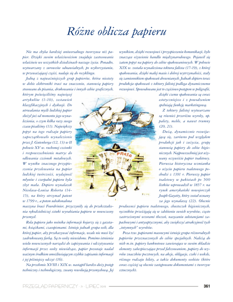 Różne oblicza papieru Nie ma chyba bardziej uniwersalnego tworzywa niż papier. Dzięki swoim właściwościom znajduje zastosowanie właściwie we wszystkich dziedzinach naszego życia. Ponadto, wytwarzany z surowców odnawialnych, po wykorzystaniu, w przeważającej części, nadaje się do recyklingu. Jedną z najważniejszych grup papierów, która niestety w dobie elektroniki traci na znaczeniu, stanowią papiery stosowane do pisania, drukowania i innych celów graficznych, którym poświęciliśmy najwięcej artykułów (1-10), zestawień klasyfikacyjnych i dyskusji. Do utrwalania myśli ludzkiej papier służył już od momentu jego wynalezienia, o czym kilka razy swego czasu pisaliśmy (11). Największy popyt na tego rodzaju papiery zapoczątkowało wynalezienie przez J. Gutenberga (12, 13) w II połowie XV w. ruchomej czcionki i rozpowszechnienie matryc do odlewania czcionek metalowych. W wyniku znacznego przyspieszenia przelewania na papier ludzkiej twórczości, wydajność młynów i czerpalni papieru była zbyt mała. Dopiero wynalazek Nicolasa-Louisa Roberta (1415), na który otrzymał patent w 1799 r., a potem udoskonalona maszyna braci Fourdrinier, przyczyniły się do przekształcenia rękodzielniczej sztuki wyrabiania papieru w nowoczesny przemysł. Rola papieru jako nośnika informacji kojarzy się z gazetami, książkami, czasopismami. Istnieje jednak grupa osób, dla której papier, aby przekazywać informacje, wcale nie musi być zadrukowany farbą. Są to osoby niewidome. Pomimo istnienia wielu nowoczesnych narzędzi do zapisywania i odczytywania informacji przez osoby niewidzące, papier pozostaje nadal ważnym środkiem umożliwiającym szybkie zapisanie informacji i jej późniejszy odczyt (16). Na przełomie XVIII i XIX w. nastąpił bardzo duży postęp techniczny i technologiczny, zwany rewolucją przemysłową. Jej PRZEGLĄD PAPIERNICZY · 71 · LIPIEC 2015 wynikiem, dzięki rozwojowi i przyspieszeniu komunikacji, było znaczące ożywienie handlu międzynarodowego. Pojawił się zatem popyt na papiery do celów opakowaniowych. W połowie XIX w. została wynaleziona tektura falista (17-19), z której opakowania, dzięki małej masie i dobrej wytrzymałości, stały się zamiennikiem opakowań drewnianych. Jednak dopiero teraz produkcja opakowań z tektury falistej podlega dynamicznemu rozwojowi. Spowodowane jest to częściowo postępem w poligrafii, dzięki czemu opakowania są coraz estetyczniejsze i z powodzeniem spełniają funkcję marketingową. Z tektury falistej wytwarzane są również przeróżne wyroby, np. palety, meble, a nawet trumny (20, 21). Dużą, dynamicznie rozwijającą się, zarówno pod względem produkcji jak i zużycia, grupę stanowią papiery do celów higienicznych. Najpowszechniej jest używany oczywiście papier toaletowy. Pierwsza historyczna wzmianka o użyciu papieru toaletowego pochodzi z 1391 r. Pierwszy papier toaletowy w pakietach po 500 listków wprowadził w 1857 r. na rynek amerykański nowojorczyk Joseph Gayetty, który został uznany za jego wynalazcę (22). Obecnie producenci papieru toaletowego, chusteczek higienicznych, ręczników prześcigają się w zdobieniu swoich wyrobów, często zastrzeżonymi wzorami tłoczeń, nasycaniu substancjami zapachowymi i antyseptycznymi, aby zwiększyć atrakcyjność tych „intymnych” wyrobów. Poza tzw. papierami masowymi istnieje grupa różnorodnych papierów przeznaczonych do celów specjalnych. Należą do nich m.in. papiery banknotowe zawierające w swoim składzie elementy zabezpieczające przed fałszowaniem, papiery do wyrobu znaczków pocztowych, na akcje, obligacje, czeki i weksle, różnego rodzaju bilety, a także dokumenty osobiste (które coraz częściej są obecnie zastępowane dokumentami z tworzyw sztucznych). 361 Papier, oprócz wielorakich funkcji w życiu codziennym, ma również swoje miejsce w sztuce, o czym wielokrotnie pisaliśmy w „Przeglądzie Papierniczym” (23-38). Do tej dziedziny należy zaliczyć także sztukę składania papieru – origami. Pochodząca z Chin, ale rozwinięta w Japonii praktyka origami powstała ok. 700 r. Początkowo z papieru tworzono dekoracje z okazji ceremonii religijnych, lecz z biegiem czasu zaczęto nimi przyozdabiać domy. Pierwszy podręcznik origami powstał w Japonii w 1797 r. Pokazano w nim 49 sposobów składania żurawia, japońskiego symbolu szczęścia i życia. W epoce Meiji (1869-1911) sztuka origami stała się przedmiotem obowiązkowym w szkołach podstawowych Japonii. Uczniowie do dziś uczą się origami, dzięki czemu łatwiej mogą pojąć zasady geometrii (39). Do nietypowych zastosowań papieru można zaliczyć także jego wykorzystanie w budownictwie. Najwcześniejsze znane przykłady zastosowania papieru w postaci składanych parawanów pojawiły się w Chinach w VIII w. Jednak, podobnie jak w przypadku sztuki origami, to Japonia (40), a nie Chiny, słynie z tradycji wykorzystania przesuwnych paneli składających się z drewnianej ramy pokrytej przepuszczającym światło papierem. Badania nad wykorzystaniem papieru jako komponentów w architekturze współczesnej rozpoczęto już w XIX w. Prezentacja pierwszego domu z tektury miała miejsce w 1867 r. w czasie Wystawy Paryskiej. Od tego czasu powstało wiele konstrukcji architektonicznych, które dzięki małej masie i łatwości montażu zyskują sobie popularność (41). LITERATURA 1. Tarnawski Z.W.: „Papiernictwo wobec wyzwań XXI w. Papier czy Internet?”, Przegl. Papiern. 56, 4, 335-340 (2000). 2. Wandelt P.: „Jak dziś klasyfikować papiery drukowe? – zaproszenie do dyskusji”, Przegl. Papiern. 51, 4, 173-176 (1995). 3. Jakucewicz S.: „Współczesna klasyfikacja papierów drukowych”, Przegl. Papiern. 51, 5, 250-251 (1995). 4. Wandelt P.: „Jeszcze o klasyfikacji papierów drukowych”, Przegl. Papiern. 52, 3, 114-117 (1996). 5. Wandelt P.: „Uwagi do klasyfikacji papierów drukowych”, Przegl. Papiern. 52, 5, 226 (1996