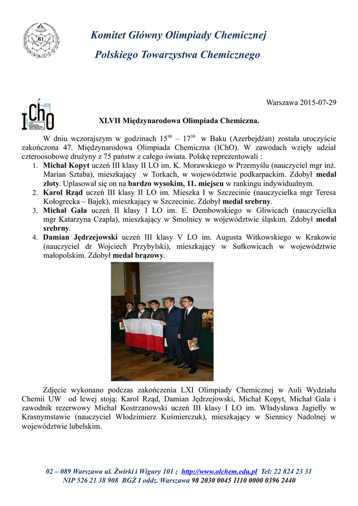 Komitet Główny Olimpiady Chemicznej Polskiego Towarzystwa Chemicznego Warszawa 2015-07-29 XLVII Międzynarodowa Olimpiada Chemiczna. W dniu wczorajszym w godzinach 1500 – 1730 w Baku (Azerbejdżan) została uroczyście zakończona 47. Międzynarodowa Olimpiada Chemiczna (IChO). W zawodach wzięły udział czteroosobowe drużyny z 75 państw z całego świata. Polskę reprezentowali : 1. Michał Kopyt uczeń III klasy II LO im. K. Morawskiego w Przemyślu (nauczyciel mgr inż. Marian Sztaba), mieszkający w Torkach, w województwie podkarpackim. Zdobył medal złoty. Uplasował się on na bardzo wysokim, 11. miejscu w rankingu indywidualnym. 2. Karol Rząd uczeń III klasy II LO im. Mieszka I w Szczecinie (nauczycielka mgr Teresa Kołogrecka – Bajek), mieszkający w Szczecinie. Zdobył medal srebrny. 3. Michał Gala uczeń II klasy I LO im. E. Dembowskiego w Gliwicach (nauczycielka mgr Katarzyna Czapla), mieszkający w Smolnicy w województwie śląskim. Zdobył medal srebrny. 4. Damian Jędrzejowski uczeń III klasy V LO im. Augusta Witkowskiego w Krakowie (nauczyciel dr Wojciech Przybylski), mieszkający w Sułkowicach w województwie małopolskim. Zdobył medal brązowy. Zdjęcie wykonano podczas zakończenia LXI Olimpiady Chemicznej w Auli Wydziału Chemii UW od lewej stoją: Karol Rząd, Damian Jędrzejowski, Michał Kopyt, Michał Gala i zawodnik rezerwowy Michał Kostrzanowski uczeń III klasy I LO im. Władysława Jagiełly w Krasnymstawie (nauczyciel Włodzimierz Kuśmierczuk), mieszkający w Siennicy Nadolnej w województwie lubelskim. 02 – 089 Warszawa ul. Żwirki i Wigury 101 ; http://www.olchem.edu.pl Tel: 22 824 23 31 NIP 526 21 38 908 BGŻ I oddz. Warszawa 98 2030 0045 1110 0000 0396 2440 Komitet Główny Olimpiady Chemicznej Polskiego Towarzystwa Chemicznego Zdjęcie wykonano po uroczystym zakończeniu 47. Międzynarodowej Olimpiady Chemicznej w Baku. Od lewej: Damian Jędrzejowski – medal brązowy, Karol Rząd – medal srebrny, Michał Kopyt – medal złoty, Michał Gala – medal srebrny. Tabela przedstawia fragment klasyfikacji drużynowej. Polacy zajęli bardzo dobre, 13. miejsce spośród 75 reprezentacji biorących udział w zawodach. Miejsce 1 4 7 8 13 - Państwo ZŁOTO SREBRO BRĄZ Chiny 4 0 0 Korea Południowa 4 0 0 Tajwan 4 0 0 Japonia 2 2 0 Rosja 2 2 0 Indie 2 2 0 Rumunia 2 1 1 Stany Zjednoczone 1 3 0 Singapur 1 3 0 Tajlandia 1 3 0 Czechy 1 3 0 Turcja 1 3 0 Polska 1 2 1 Kazachstan 1 2 1 Wietnam 1 2 1 Slowacja 1 2 1 Serbia 1 2 1 Iran 1 2 1 02 – 089 Warszawa ul. Żwirki i Wigury 101 ; http://www.olchem.edu.pl Tel: 22 824 23 31 NIP 526 21 38 908 BGŻ I oddz. Warszawa 98 2030 0045 1110 0000 0396 2440 Komitet Główny Olimpiady Chemicznej Polskiego Towarzystwa Chemicznego 19 Estonia 1 1 2 Zawodnicy wraz z opiekunami: prof. dr hab. Aleksandrą Misicką - Kęsik i prof. dr hab. Markiem Orlikiem pracownikami Uniwersytetu Warszawskiego powrócą do Warszawy na lotnisko Okęcie 30 lipca o godz. 13.10. Wanda Szelągowska Kierownik Organizacyjny Komitetu Głównego Olimpiady Chemicznej 02 – 089 Warszawa ul. Żwirki i Wigury 101 ; http://www.olchem.edu.pl Tel: 22 824 23 31 NIP 526 21 38 908 BGŻ I oddz. Warszawa 98 2030 0045 1110 0000 0396 2440