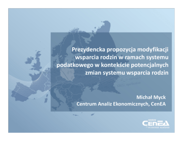 Prezydencka propozycja modyfikacji wsparcia rodzin w ramach systemu podatkowego w kontekście potencjalnych zmian systemu wsparcia rodzin Michał Myck Centrum Analiz Ekonomicznych, CenEA Modyfikacje finansowego wsparcia rodzin z dziećmi w Polsce Wprowadzenie: • Francuski system podatkowy jako punkt odniesienia dla potencjalnych zmian w systemie opodatkowania rodzin z dziećmi w Polsce: • indeks ilorazowy i rola progresywności systemu podatkowego. • Prezydencka propozycja modyfikacji systemu: • modyfikacje systemu oparte o zamianę ulgi podatkowej na dzieci na wielokrotność kwoty wolnej od podatku. • Inne alternatywne podejścia do zmian w systemie: • stopniowe wycofywanie świadczeń rodzinnych; • opcje powszechnego świadczenia rodzinnego. • Analizy oparte o: • Raport CenEA dla Kancelarii Prezydenta Myck i in. (2013a, 2013b); • Komentarz CenEA 26.03.2014 (www.cenea.org.pl); • Myck i in. (2013c) w „Zatrudnienie w Polsce - 2011”. Centrum Analiz Ekonomicznych, CenEA Modyfikacje finansowego wsparcia rodzin z dziećmi w Polsce Ulga podatkowa na dzieci: - stopień wykorzystania Centrum Analiz Ekonomicznych, CenEA Modyfikacje finansowego wsparcia rodzin z dziećmi w Polsce Francuski system podatkowy jako punkt odniesienia dla potencjalnych reform: Całkowita wartości indeksu ilorazowego we francuskim i polskim systemie podatkowym System francuski Liczba dzieci: 0 1 2 3 4 System polski Małżeństwo/ związek parterski Samotny rodzic Małżeństwo Samotny rodzic 2 2.5 3 4 5 1 2 2.5 3.5 4.5 2 2 2 2 2 1 2 2 2 2 Centrum Analiz Ekonomicznych, CenEA Modyfikacje finansowego wsparcia rodzin z dziećmi w Polsce Symulacje wprowadzenia systemu francuskiego w Polsce: • Przeniesienie systemu francuskiego z zachowaniem ulgi na dzieci: • • koszt dla sektora finansów publicznych: 2.2 mld zł rocznie; korzyści skupione w górnej części rozkładu dochodu (najzamożniejsze 10% gospodarstw zyskuje 0.9 mld zł). • Przeniesienie systemu francuskiego z jednoczesnym wycofaniem ulgi na dzieci: • • korzyść dla sektora finansów publicznych: 4.2 mld zł rocznie; straty wśród gospodarstw domowych skupione w środkowej części rozkładu dochodu (najbardziej tracą gospodarstwa z grup decylowych 4-9). Centrum Analiz Ekonomicznych, CenEA Modyfikacje finansowego wsparcia rodzin z dziećmi w Polsce Symulacje oparte o zamianę ulgi podatkowej na dzieci na wielokrotność kwoty wolnej od podatku: • Zastosowanie odpowiednika indeksu ilorazowego wyłączenie do kwoty wolnej od podatku (KWP) w taki sposób, by w nowym systemie nie zmieniła się sytuacja rodzin, które obecnie w pełni wykorzytują ulgę na dzieci (propozycja Prezydenta RP w programie „Dobry klimat dla rodziny”): • 2*KWP na pierwsze i drugie dziecko w rodzinie - maksymalna korzyść podatkowa 1112,04 zł rocznie na dziecko; - z ograniczeniem dla rodzin z jednym dzieckiem tak jak w obecnym systemie; • 3*KWP na trzecie dziecko w rodzinie - maksymalna korzyść podatkowa 1668,06 na trzecie dziecko; 4*KWP na czwarte i kolejne dziecko w rodzinie - maksymalna korzyść podatkowa 1668,06 na czwarte i kolejne dzieci; • Zmiana kolejności naliczania ulg podatkowych (NFZ i ulgi na dzieci). Centrum Analiz Ekonomicznych, CenEA Modyfikacje finansowego wsparcia rodzin z dziećmi w Polsce Symulacje oparte o zamianę ulgi podatkowej na dzieci na wielokrotność kwoty wolnej od podatku: • Zastosowanie odpowiednika indeksu ilorazowego wyłączenie do kwoty wolnej od podatku (KWP) w taki sposób, by w nowym systemie nie zmieniła się sytuacja rodzin, które obecnie w pełni wykorzytują ulgę na dzieci (propozycja Prezydenta RP w programie „Dobry klimat dla rodziny”): • 2*KWP na pierwsze i drugie dziecko w rodzinie - maksymalna korzyść podatkowa 1112,04 zł rocznie na dziecko; - z ograniczeniem dla rodzin z jednym dzieckiem tak jak w obecnym systemie; • 3*KWP na trzecie dziecko w rodzinie - maksymalna korzyść podatkowa 1668,06 na trzecie dziecko; 4*KWP na czwarte i kolejne dziecko w rodzinie - maksymalna korzyść podatkowa 1668,06 na czwarte i kolejne dzieci; • Zmiana kolejności naliczania ulg podatkowych (NFZ i ulgi na dzieci). Całkowity koszt reformy: 1.7 mld zł rocznie • Drugi wariant systemu z dodatkową premią na drugie dziecko (2.6 mld zł) (patrz: Myck i in. 2013b). Centrum Analiz Ekonomicznych, CenEA Modyfikacje finansowego wsparcia rodzin z dziećmi w Polsce Korzyści podatkowe wynikające z prezydenckiej propozycji reformy systemu podatkowego: Centrum Analiz Ekonomicznych, CenEA Modyfikacje finansowego wsparcia rodzin z dziećmi w Polsce Zmiana wysokości finansowego wsparcia rodzin wynikająca z prezydenckiej propozycji reformy systemu podatkowego, małżeństwo z dwójką dzieci: Wsparcie rodzin w systemie (PLN/miesiąc) 500 400 300 200 100 0 0 1000 2000 3000 4000 5000 6000 Dochód brutto w rodzinie (PLN/miesiąc) Scenariusz: System 2013 Reforma KP Centrum Analiz Ekonomicznych, CenEA Modyfikacje finansowego wsparcia rodzin z dziećmi w Polsce Wartość wsparcia Schemat finansowego wsparcia rodzin w Polsce: prezydencka propozycja modyfikacji systemu 0 500 1000 1500 2000 2500 3000 3500 4000 4500 5000 Dochód brutto Schemat wsparcia rodzin w Polsce: świadczenia rodzinne i ulga podatkowa Schemat wsparcia rodzin w Polsce: propozycja Prezydenta RP Centrum Analiz Ekonomicznych, CenEA Modyfikacje finansowego wsparcia rodzin z dziećmi w Polsce Prezydencka propozycja modyfikacji systemu wsparcia: Korzyści w grupach dochodowych Centrum Analiz Ekonomicznych, CenEA Modyfikacje finansowego wsparcia rodzin z dziećmi w Polsce Wartość wsparcia Alrernatywne możliwości zmian w systemie finansowego wsparcia rodzin z dziećmi: powszechne świadczenie rodzinne (PŚR) 0 500 1000 1500 2000 2500 Dochód brutto 3000 3500 4000 4500 5000 Schemat wsparcia rodzin w Polsce: świadczenia rodzinne i ulga podatkowa Świadczenie powszechne Centrum Analiz Ekonomicznych, CenEA Modyfikacje finansowego wsparcia rod