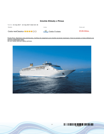 Greckie Klimaty z Pireus Termin: 15 maj 2017 - 22 maj 2017 (ilość dni: 8) Statek: Costa neoClassica Linia: Cena od: Costa Cruises €539.00/os. Pronto Price. Najniższa cena promocyjna, możliwa do osiągnięcia przy bardzo wczesnej rezerwacji. Cena ta wzrasta w miarę zbliżania się terminu rozpoczęcia rejsu. Do cen należy doliczyć opłaty portowe. 1/3 EV:49201 TRASA REJSU Data Port Wpłynięcie Wypłynięcie poniedziałek 15.05.2017 Pireus, Ateny --:-- 22:00 wtorek 16.05.2017 Mykonos 08:00 --:-- środa 17.05.2017 Mykonos --:-- 23:59 czwartek 18.05.2017 Santorini 08:00 20:00 dzień 5 piątek 19.05.2017 Dzień na morzu --:-- --:-- dzień 6 sobota 20.05.2017 Bari 08:00 18:00 Włochy niedziela 21.05.2017 07:00 14:00 Grecja 14:00 --:-- dzień 1 dzień 2 dzień 3 dzień 4 dzień 7 dzień 8 poniedziałek 22.05.2017 Legenda Grecja Grecja Grecja Grecja Korfu Pireus, Ateny Grecja CENNIK Cena katalogowa Cena promocyjna Kabina wewnętrzna na zapytanie od 2 392.89zł Kabina zewnętrzna z oknem na zapytanie od 2 925.63zł Suite (apartament) na zapytanie Kabina jednoosobowa na zapytanie 3 i 4 osoba dorosła w kabinie na zapytanie dziecko do 18 lat jako 3 i 4 osoba w kabinie Opłaty portowe tylko opłaty portowe 621.53zł Uwaga! Ceny za osobę w kabinie dwuosobowej. 2/3 EV:49201 Cena zawiera: zakwaterowanie w kabinie wybranej kategorii; wyżywienie - 3 główne posiłki, przekąski między posiłkami; napoje serwowane do śniadania i w bufetach samoobsługowych; serwis bagażowy podczas wejścia i zejścia ze statku; serwis kabinowy; korzystanie ze wszystkich urządzeń sportowo - rekreacyjnych znajdujących się na pokładzie statku (basen, jacuzzi, sala fitness, itp.); udział we wszystkich imprezach organizowanych na statku (przedstawienia w teatrze, koncerty, programy animacyjne itp.). Cena nie zawiera: kosztów dojazdu do portu; opłat portowych; ewentualnych noclegów w hotelu przed/po rejsie i transferów; wycieczek fakultatywnych w trakcie rejsu; korzystania z barów, mini baru w kabinie oraz napojów zamawianych w restauracji; korzystania z punktów usługowych (fryzjer, pralnia, fotograf, salon piękności i odnowy biologicznej, internet) i wydatków osobistych; napiwków dla obsługi na statku (kwota uzależniona od długości rejsu); ubezpieczenia KL, NNW i bagaż, kosztów wiz (tam gdzie wymagane). Uwagi: Od 01.12.2015 na wszystkich rejsach Costa Cruises (z min. 5 noclegów) można zarezerwować następujące pakiety all inclusive: dla dzieci 4-17 lat Giovani od 15.99€/os./dzień, dla dorosłych: Brindiamo od 24.99€/os./dzień, Piu Gusto od 27.99€/os./dzień, Intenditore od 45.99€/os./dzień (pakiet musi być wykupiony przez każdą osobę zakwaterowaną w kabinie - można zakupić w biurze przed rejsem). Na Państwa życzenie zarezerwujemy przelot, transfery do/z portu, parking, dodatkowe noclegi oraz zadbamy o odpowiednie ubezpieczenie podróżne. 3/3 EV:49201