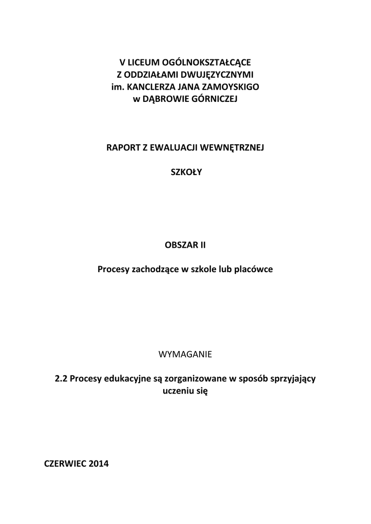 V LICEUM OGÓLNOKSZTAŁCĄCE Z ODDZIAŁAMI DWUJĘZYCZNYMI im. KANCLERZA JANA ZAMOYSKIGO w DĄBROWIE GÓRNICZEJ RAPORT Z EWALUACJI WEWNĘTRZNEJ SZKOŁY OBSZAR II Procesy zachodzące w szkole lub placówce WYMAGANIE 2.2 Procesy edukacyjne są zorganizowane w sposób sprzyjający uczeniu się CZERWIEC 2014 Spis treści: I. Harmonogram ewaluacji wewnętrznej. II. Cele i zadania ewaluacji wewnętrznej 1. 2. 3. 4. III. Cele ewaluacji wewnętrznej Zakres diagnozowania Pytania kluczowe Kryteria ewaluacji Informacje dotyczące organizacji ewaluacji 1. Wskazanie źródeł informacji o jakości pracy w obszarach objętych ewaluacją. 2. Opis metod i narzędzi badawczych wykorzystanych przy ewaluacji. 3. Terminy przeprowadzania czynności ewaluacyjnych. IV. Prezentacja wyników ewaluacji 1. Procesy edukacyjne przebiegające w szkole są zorganizowane i planowane. 2. Szkoła organizuje procesy edukacyjne w sposób sprzyjający uczeniu się oraz stosuje różne metody pracy adekwatne do potrzeb ucznia, grupy, oddziału. 3. Uczniowie znają stawiane im cele uczenia się oraz formułowane wobec nich oczekiwania. 4. Informacja o postępach w nauce otrzymana w wyniku oceniania uczniów motywuje ich do dalszej pracy i pomaga planować swój indywidualny rozwój oraz proces uczenia się. V. Ostateczne rezultaty ewaluacji wewnętrznej i wnioski do dalszej pracy. 5.1 Sformułowanie odpowiedzi na pytania kluczowe. 5.2 Wnioski z badań w postaci słabych i mocnych stron. 5.3 Rekomendacje. VI. Załączniki: 1. Wyniki ankiety dla rodziców. 2. Wyniki ankiety dla uczniów. I. Harmonogram ewaluacji wewnętrznej Cele ewaluacji: 1. Doskonalenie efektów pracy szkoły. 2. Stwierdzenie, czy procesy edukacyjne przebiegające w szkole są planowane. 3. Stwierdzenie, czy procesy edukacyjne są zorganizowane w sposób sprzyjający uczeniu się. 4. Stwierdzenie, czy uczniowie znają stawiane przed nimi cele uczenia się oraz formułowane wobec nich oczekiwania. 5. Stwierdzenie, czy informacja o postępach w nauce otrzymana w wyniku oceniania uczniów daje im informację o ich postępach w nauce oraz motywuje ich do dalszej pracy i pomaga planować swój indywidualny rozwój oraz proces uczenia się. 6. Stwierdzenie, czy nauczyciele stosują różne metody pracy dostosowane do potrzeb ucznia, grupy i oddziału. 7. Stwierdzenie, czy nauczyciele motywują uczniów do aktywnego uczenia się. 8. Stwierdzenie, czy nauczyciele podejmują różne formy wspierania uczniów w trudnych sytuacjach. 9. Stwierdzenie, czy nauczyciele i uczniowie tworzą atmosferę sprzyjającą uczeniu się. 10. Stwierdzenie, czy w szkole lub placówce analizuje się wyniki monitorowania osiągnięć uczniów i wdraża się wnioski z tych analiz. Plan działań i obserwacji zajęć dydaktycznych, wychowawczych i opiekuńczych oraz innych zadań statutowych: Prowadzenie obserwacji dotyczących zagadnienia, czy procesy edukacyjne przebiegają w szkole są zorganizowane i planowane. Analiza z realizacji wniosków z monitorowania i doskonalenia procesów edukacyjnych. Ocena przydatności stosowania różnych metod pracy sprzyjających uczeniu się oraz sposobów motywujących uczniów do aktywnego uczenia się. Analiza podejmowanych działań wpływających na stworzenie atmosfery sprzyjającej uczeniu się oraz organizowaniu. Modyfikacja działań edukacyjnych uwzględniająca inicjatywy uczących się oraz ich rodziców, a dotycząca sposobu organizowania i przebiegu procesu uczenia się. Udział uczniów w procesie analizy ich postępów oraz wskazania drogi ich dalszego rozwoju indywidualnego. Analiza podejmowanych działań mających na celu zapoznanie uczniów z wymaganiami edukacyjnymi z poszczególnych przedmiotów oraz informowanie ich o sposobie oceniania i systemie nagród za osiągnięcia. Ocena, czy są wdrażane wnioski z przeprowadzanych analiz oraz, czy następuje modyfikacja działań edukacyjnych uwzględniająca inicjatywy uczniów. Wyżej wymienione działania odbywają się przez cały rok szkolny. Osoby odpowiedzialne to: dyrektor szkoły oraz nauczyciele. Źródła planowania: - wnioski z posiedzeń rad pedagogicznych i zespołów przedmiotowych, - analiza przeprowadzonych ankiet, - dokumentacja szkolna, - wywiady z nauczycielami, pedagogiem i psychologiem szkolnym, - dyskusje z uczniami, - dyskusje z rodzicami podczas zebrań klasowych, - wnioski oraz postulaty uczniów i rodziców, - inne informacje dotyczące szkoły. II. Cele i zdania ewaluacji wewnętrznej 1.Cele ewaluacji wewnętrznej: 1. Doskonalenie efektów pracy szkoły. 2. Stwierdzenie, czy procesy edukacyjne przebiegające w szkole są planowane. 3. Stwierdzenie, czy procesy edukacyjne są zorganizowane w sposób sprzyjający uczeniu się. 4. Stwierdzenie, czy uczniowie znają stawiane przed nimi cele uczenia się oraz formułowane wobec nich oczekiwania. 5. Stwierdzenie, czy informacja o postępach w nauce otrzymana w wyniku oceniania uczniów daje im informację o ich postępach w nauce oraz motywuje ich do dalszej pracy i pomaga planować swój indywidualny rozwój oraz proces uczenia się. 6. Stwierdzenie, czy nauczyciele stosują różne metody pracy dostosowane do potrzeb ucznia, grupy i oddziału. 7. Stwierdzenie, czy nauczyciele motywują uczniów do aktywnego uczenia się. 8. Stwierdzenie, czy nauczyciele podejmują różne formy wspierania uczniów w trudnych sytuacjach. 9. Stwierdzenie, czy nauczyciele i uczniowie tworzą atmosferę sprzyjającą uczeniu się 10. W szkole lub placówce analizuje się wyniki monitorowania osiągnięć uczniów i wdraża się wnioski z tych analiz. 2. Zakres diagnozowania: - Obszar: - efekty działalności dydaktycznej, wychowawczej i opiekuńczej oraz innej działalności statutowej szkoły, - procesy zachodzące w szkole lub placówce. - Wymaganie 2.2. Procesy edukacyjne są zorganizowane w sposób sprzyjający uczeniu się. 3. Pytania kluczowe: 1. Czy procesy edukacyjne przebiegające w szkole są zorganizowane i planowe i czy sp