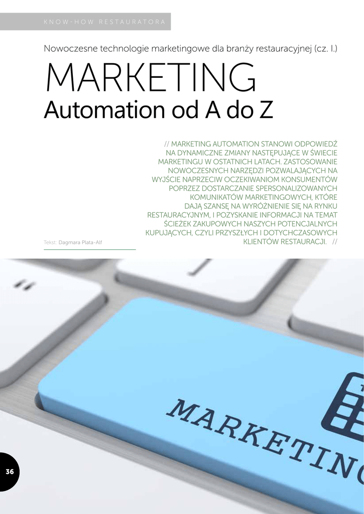 KNOW-HOW RESTAURATORA Nowoczesne technologie marketingowe dla branży restauracyjnej (cz. I.) MARKETING Automation od A do Z Tekst: Dagmara Plata-Alf 36 // MARKETING AUTOMATION STANOWI ODPOWIEDŹ NA DYNAMICZNE ZMIANY NASTĘPUJĄCE W ŚWIECIE MARKETINGU W OSTATNICH LATACH. ZASTOSOWANIE NOWOCZESNYCH NARZĘDZI POZWALAJĄCYCH NA WYJŚCIE NAPRZECIW OCZEKIWANIOM KONSUMENTÓW POPRZEZ DOSTARCZANIE SPERSONALIZOWANYCH KOMUNIKATÓW MARKETINGOWYCH, KTÓRE DAJĄ SZANSĘ NA WYRÓŻNIENIE SIĘ NA RYNKU RESTAURACYJNYM, I POZYSKANIE INFORMACJI NA TEMAT ŚCIEŻEK ZAKUPOWYCH NASZYCH POTENCJALNYCH KUPUJĄCYCH, CZYLI PRZYSZŁYCH I DOTYCHCZASOWYCH KLIENTÓW RESTAURACJI. // biznes restauracje catering BRC Należy pamiętać, że obecnie kupujący oczekują dostarczenia wartości i aktywnie poszukują nowych treści i informacji o produktach on-line, analizują opinie znajomych w mediach społecznościowych i docierają do szczegółowych informacji o naszej restauracji nim nawiążą z nami bezpośredni kontakt. Współcześnie powinniśmy nastawić się na całościowe podejście do klienta jako wielowymiarowego, wyznającego wartości człowieka, który może się stać naszym partnerem. Wsparciem dla tego procesu jest właśnie wdrożenie koncepcji zarządzania procesami marketingowymi Marketing Automation. MARKETING AUTOMATION – CO TO TAKIEGO? Automatyzacja działań marketingowych ma na celu zwiększenie efektywności prowadzonych kampanii marketingowych poprzez automatyczne gromadzenie i przetwarzanie informacji dotyczących potencjalnych konsumentów (tzw. leadów sprzedażowych). Na podstawie pozyskanych danych na temat poten- cjalnych klientów (czynników demograficznych czy zachowań behawioralnych podejmowanych na danej stronie internetowej) i po ich zidentyfikowaniu specjalny system kieruje do odbiorców odpowiednie, spersonalizowane przekazy marketingowe, zgodne z naszą strategią marketingową. DLACZEGO WARTO ZAINWESTOWAĆ W MARKETING AUTOMATION W BRANŻY RESTAURACYJNEJ? Wykorzystanie systemu automatyzacji w biznesie restauracyjnym to ogromny potencjał i swoista innowacja pozwalająca na pozyskanie przewagi konkurencyjnej dzięki precyzyjnemu zarządzaniu informacjami dostarczanymi do potencjalnych i obecnych konsumentów. Systemy automatyzacji marketingu stanowią połączenie tradycyjnych systemów CRM z możliwością zaprogramowania reguł reakcji marketingowej na konkretne zachowania naszych potencjalnych i obecnych klientów (np. zaprogramowania reakcji na brak zamówień od klienta w dłuższym czasie). Marketing Automation pozwala na monitoring i analizę zachowań klientów odwiedzających stronę internetową restauracji, monitorowanie ich reakcji na wysyłane komunikaty (e-maile, newslettery, pop-upy), a co najważniejsze – lead scoring, czyli kwalifikację leadów w lejku sprzedażowym i przygotowanie ich do dokonania zakupu naszej usługi. Funkcje i podstawowe zastosowanie systemu Marketing Automation: • Digital Body Language – systemy zarządzania procesami automatyzacji marketingu pozwalają na analizę zachowań potencjalnych klientów w zetknięciu z marką naszej restauracji (np. wskaźniki kliknięć w korespondencję e-mailową, pobieranie menu ze strony internetowej, wizyty na stronie internetowej etc.). Pozwala to na uzyskanie cennych informacji i wskazówek związanych z intencjami zakupowymi naszych klientów i dopasowanie do nich informacji marketingowych. • Monitorowanie gości odwiedzających stronę naszej restauracji – umożliwia analizę ścieżek i zachowań konsumenta, a następnie dostarczanie osobom odwiedzającym naszą stronę dedykowanych i spersonalizowanych komunikatów marketingowych. • Komunikaty marketingowe – personalizacja i dynamiczne treści – opierając się na zgromadzonych w systemie Marketing Automation danych obejmujących preferencje naszych klientów i ich zainteresowania, jesteśmy w stanie zwiększyć ich uwagę w zakresie świadczonych usług gastronomicznych poprzez maksymalne dopasowanie wygenerowanych komunikatów do odbiorcy, przez co wzrasta efektywność wykorzystywanych przez nas kanałów marketingowych. • Lead nurturing – to proces służący przygotowaniu klienta do zakupu poprzez dostarczanie mu treści o charakterze edukacyjnym (np. cykl porad dystrybuowanych w różnych formach i kanałach marketingowych pt. „Jak przygotować rybę zapiekaną w sosie śmietanowym?”) mających na celu poszerzenie wiedzy o usłudze, które finalnie zachęcą go do skorzystania z naszej oferty (np. uczestnictwo w warsztatach kulinarnych – team building dla firm). • Lead scoring – system punktów (wartości liczbowych) przypisywanych do naszego klienta na podstawie jego konkretnych aktywności (np. wejście na stronę oferty cateringowej z newslettera – 5 pkt). Na tej podstawie selekcjonowane są kontakty, które osiągnęły dany wskaźnik i dojrzały do kontaktu z naszymi handlowcami (np. 50 pkt). • E-mail marketing – w ramach funkcjonalności systemów do automatyzacji marketingu możemy wyróżnić kreator e-maili i newsletterów oraz automatyzację wysyłek realizowanych do naszych klientów. Już nie musimy się martwić o „najlepszą godzinę wysyłki” – system sam dopasuje porę i termin do ich preferencji. Zastanawiając się nad wyborem systemu Marketing Automation, z pewnością warto przeanalizować ofertę systemów dostępnych na polskim rynku: iPresso.pl, SALESmanago i dedykowanego branży restauracyjnej UpMenu, które mają ugruntowaną pozycję na rynku i mogą pochwalić się bogatym portfolio także wśród restauracji. W jaki sposób korzystać z systemów automatyzacji oraz na co zwrócić szczególną uwagę w odniesieniu do branży restauracyjnej, zapytałam ekspertów ze wspomnianych wyżej firm. 37 KNOW-HOW RESTAURATORA Dagmara Plata-Alf: Czy system automatyzacji to dobre rozwiązanie dla każdej branży? Jak to wygląda w przypadku restauracji? Na co powinniśmy się przygotowa