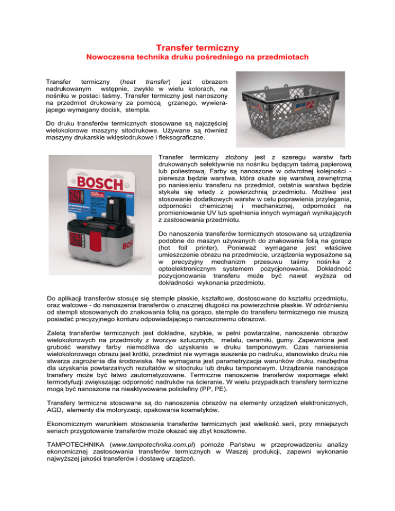 Transfer termiczny Nowoczesna technika druku pośredniego na przedmiotach Transfer termiczny (heat transfer) jest obrazem nadrukowanym wstępnie, zwykle w wielu kolorach, na nośniku w postaci taśmy. Transfer termiczny jest nanoszony na przedmiot drukowany za pomocą grzanego, wywierającego wymagany docisk, stempla. Do druku transferów termicznych stosowane są najczęściej wielokolorowe maszyny sitodrukowe. Używane są również maszyny drukarskie wklęsłodrukowe i fleksograficzne. Transfer termiczny złożony jest z szeregu warstw farb drukowanych selektywnie na nośniku będącym taśmą papierową lub poliestrową. Farby są nanoszone w odwrotnej kolejności pierwsza będzie warstwa, która okaże się warstwą zewnętrzną po naniesieniu transferu na przedmiot, ostatnia warstwa będzie stykała się wtedy z powierzchnią przedmiotu. Możliwe jest stosowanie dodatkowych warstw w celu poprawienia przylegania, odporności chemicznej i mechanicznej, odporności na promieniowanie UV lub spełnienia innych wymagań wynikających z zastosowania przedmiotu. Do nanoszenia transferów termicznych stosowane są urządzenia podobne do maszyn używanych do znakowania folią na gorąco (hot foil printer). Ponieważ wymagane jest właściwe umieszczenie obrazu na przedmiocie, urządzenia wyposażone są w precyzyjny mechanizm przesuwu taśmy nośnika z optoelektronicznym systemem pozycjonowania. Dokładność pozycjonowania transferu może być nawet wyższa od dokładności wykonania przedmiotu. Do aplikacji transferów stosuje się stemple płaskie, kształtowe, dostosowane do kształtu przedmiotu, oraz walcowe - do nanoszenia transferów o znacznej długości na powierzchnie płaskie. W odróżnieniu od stempli stosowanych do znakowania folią na gorąco, stemple do transferu termicznego nie muszą posiadać precyzyjnego konturu odpowiadającego nanoszonemu obrazowi. Zaletą transferów termicznych jest dokładne, szybkie, w pełni powtarzalne, nanoszenie obrazów wielokolorowych na przedmioty z tworzyw sztucznych, metalu, ceramiki, gumy. Zapewniona jest grubość warstwy farby niemożliwa do uzyskania w druku tamponowym. Czas naniesienia wielokolorowego obrazu jest krótki, przedmiot nie wymaga suszenia po nadruku, stanowisko druku nie stwarza zagrożenia dla środowiska. Nie wymagana jest parametryzacja warunków druku, niezbędna dla uzyskania powtarzalnych rezultatów w sitodruku lub druku tamponowym. Urządzenie nanoszące transfery może być łatwo zautomatyzowane. Termiczne nanoszenie transferów wspomaga efekt termodyfuzji zwiększając odporność nadruków na ścieranie. W wielu przypadkach transfery termiczne mogą być nanoszone na nieaktywowane poliolefiny (PP, PE). Transfery termiczne stosowane są do nanoszenia obrazów na elementy urządzeń elektronicznych, AGD, elementy dla motoryzacji, opakowania kosmetyków. Ekonomicznym warunkiem stosowania transferów termicznych jest wielkość serii, przy mniejszych seriach przygotowanie transferów może okazać się zbyt kosztowne. TAMPOTECHNIKA (www.tampotechnika.com.pl) pomoże Państwu w przeprowadzeniu analizy ekonomicznej zastosowania transferów termicznych w Waszej produkcji, zapewni wykonanie najwyższej jakości transferów i dostawę urządzeń. Pionowe nanoszenie transferów Webtrak urządzenie pozycjonujące transfery • dokładność pozycjonowania – 0,25-0,4 mm • pozycjonowanie za pomocą fotoelementu • siła nacisku 1-12ton • dokładne ustawienie taśmy w osiach X-Y Accutrak urządzenie pozycjonujące transfery o wysokiej dokładności • złożony system fotooptyczny wykrywający położenie paserów na głowicy • dokładne ustawienie taśmy w osiach X-Y- R • głowica nastawna w osiach X-Y-R dla ustawienia względem powierzchni dekorowanej • „pływające” uchwyty części zapewniają największą dokładność ustawienia części wzgledem transferu Rolowe nanoszenie transferów R8BX urządzenie do rolowego nanoszenia transferów termicznych możliwość nanoszenia dużych transferów dekoracja powierzchni płaskich lub o dużych promieniach krzywizny precyzyjna regulacja położenia taśmy w osiach X-Y Nanoszenie transferów na obwodzie części Acrobot II urządzenie do nanoszenia transferów termicznych na obwodzie części o praktycznie dowolnym przekroju (do 360 o) • części o przekroju owalnym, okrągłym, kwadratowym, trójkątnym, wielobocznym • unikalny układ sterowania w wielu osiach • układ samouczący się • łatwa integracja w systemy automatyczne US VPC urządzenie do nanoszenia transferów termicznych na obwodzie części cylindrycznych (opakowania kosmetyków, długopisy, ołówki itp.)