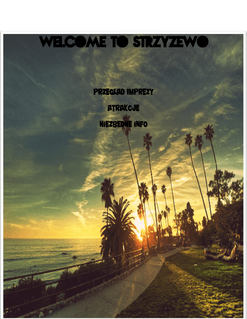 Przeglad Imprezy Atrakcje Niezbedne info Palmy Symbolem Welcome to St.Rzyzewo sa unikatowe drzewa palmiaste wykonane wlasnorecznie przez wolontariat. Piaszysta plaza jest kolejnym charakterystycznym symbolem, ktory znalezc mozesz na festiwalu Welcome to St.Rzyzewo. Kazdego roku organizatorzy WTS wkladaja duzo wysilku w udekorawanie miejsca, ktore sprawi ze uczestnicy festiwalu beda czuc sie wyjatkowo. W roku ubieglym, miejscem do tanczenia byla sala taneczna usytowana w klubie Studio. Scena W tym roku wszyscy uczestnicy doswiadcza cos czego jeszcze na WTS nie bylo, oryginalna I unikatowa scena w plenerze, ktora sprawi ze poczujesz sie jak na prawdziwym koncercie. Doswiadczeni DJ z calego kraju oraz I swiata bede mieli okazje do zaprezentowania swoich umiejetnosci. Jestesmy przekonani ze tlum pokocha doskonaly line-up, ktory ma zostac niespodzianka, a zaskakiwac potrafimy, co czesc z Was juz wie. Basen Co roku, uczestnicy imprezy, maja okazje na relaks w basenach. W tym roku planujemy zoorganizowac wiekszy basen, ktory schlodzi rozgrzane serca naszych uczestnikow. Beer pong Amerykańska tradycja piwnej gry. Polega na usytuowaniu 20 kubków na stole i wypełnieniu ich piwem. Każda drużyna dostaje po 10 kubków. Zawodnik który trafi piłką ping pong z przeciwległem strony stołu w kubek rywala zdobywa punkt. Wygrywa drużyna która usunie wszystkie kubki rywala ze stołu. Flagowe szaleństwo Każda ekipa proszona jest o przygotowanie flagi Polski z napisem własnego miasta. Będzie nas 300 osób i uczestnicy z każdego województwa odwiedzą Strzyżewo. Dla najlepiej zoorganizowanej ekipy przyjezdnej niespodzianka !!! Moim cichym faworytem jest ekipa z Warszawy z Amelią i Krukersem na czele ! Walki w kislu Z racji tego ze tlum w Strzyzewie kocha szalenstwo, nie chcemy sie ograniczac. W tym roku, organizatorzy specjalnie dla Was, przygotowywuja miejsce w ktorym beda sie odbywac walki w kislu ( nie znamy jeszcze w jakim smaku, aczkolwiek przeprowadzone zostanie glosowanie). Dla wszystkich chetnych I pozytywnie zakreconych osob , czyli uczestnikow Welcome to St.Rzyzewo serdecznie zachecamy do udzialu w tym wydarzeniu. Bedzie wesolo. Piwne biegi. ( nieoficjalne Mistrzostwa Polski w biegu piwnym). Cieszace sie coraz wieksza popularnoscia biegi piwne, odbeda sie w piatkowy wieczor ( eliminacje) oraz w sobotni wieczor ( final). Niosące ze soba ogromne emocje piwne sciganie sprawia ze kibice maja okazje doswiadczyc dreszcyk emocji a zarazem spora dawke smiechu. Druga edycja piwnej 800 mezczyzn bedzie zarowno ekscytujaco jak w roku ubieglym, gdzie po zacietej walce z Dawidem Konieczkiem Jacek Zadlo zostal mistrzem olimpijskim. Nowosc: Kobieca 600 zostanie wprowadzona w program, poniewaz w ubieglym roku organizatorzy nie przewidzieli tego, ze az tak wiele kobiet bylo chetne do wziecia udzialu w biegu. Przepraszamy wszystkie reprezentantki plci pieknej I zapraszamy do udzialu w kolejnej edycji. Dla finalistow, unikatowe nagrody oraz koszulki! Szykuje sie wiec duzo smiechu I rywalizacji, bo w wkoncu kazdy chcialby zostac mistrzem olimpijskim I to jeszcze w Strzyzewie. Mydlana folia z poślizgiem. W tym roku pomyślelismy o czarnej foli o długości ok 20 metrów. Każdy uczestnik będzie miał możliwość sprawdzenia swoich umiejętności na czarnym tworzywie i miejmy nadzieję że zabawa będzie bezpieczna. Piłka Nożna i Siatkówka Jak co roku w sobotnie południe organizujemy turnieje piłki nożnej a w tym roku także siatkówka zawita na naszych igrzyskach. Tworzymy 7 osobowe drużyny z każdego województwa i zwycięzcy zgarniają odjechane koszulki, jak w roku ubiegłym. Przypominam że zwycięzcą w roku ubiegłym była drużyna Czorni Śląsk z , Rafał Smoleń,Sebastian Stelmański, Paulina Orzeszyna, Kamil Mariusz Gołkowski i Bolesław Jabłoński. Bieg Olimpijski : Bieg lub marszo bieg na dystansie 3000 – 4000m m w tempie rekreacyjnym odbędzie się w sobotnie południe. Przebiegniemy się całą ekipą ulicami StRzyzewa i zrobimy hałas. Cała inicjatywa polega na zachęceniu ludzi do aktywnego trybu życia. Będzie TV oraz gazeta więc musimy też jakoś wyglądać przez chociaż 15 minut. Dla każdego uczestnika organizatorzy wręczą odjechane koszulki. Wiele wiele innych atrakcji w St.rzyzewie. Camping Niestety, ale nigdy nie mielismy dobrze zoorganizowanego pola namiotowego z zapleczem sanitarnym. Uczestnicy festiwalu zawsze zmagali sie z problemem wziecia prysznica, bo kolejki do domowego byly spore – Przepraszamy za wszelkie nie dogodosci I nie powtorzy sie to nigdy wiecej. W tym roku, szatnie beda dostepne zarowno dla kobiet jak I mezczyzn. Zapewni my takze toalety oraz miejsce w ktorym mozna splukac twarz zimna woda I wykonac poranna toalete. Pole kampingowe bedzie dostepne dla kazdego uczestnika imprezy, jesli jednk nie posiadasz namiotu, mozna przespać się pod gołym niebem na łonie natury. W roku ubiegłym właśnie taki styl odpoczynku cieszył się duża popularnością- patrz* Bolek i Lipa. Co ubrac ? Kolorowe I jaskrawe ubrania sa zawsze mile widziane na Welcome to St.rzyzewo. Zawsze jest milo ubrac cos wygodnego I luznego, to sprawi ze bedziesz czuc sie komfortowo I tanczyc bez zadznego zastanawiania sie. Kazdy kto ubierze sie nie stosownie I jego ubior wskazywac bedzie na obraze ktoregos z uczestnikow, czy tez klubu pilkarskiego, ruchu politycznego czy miasta zostanie usuniety z imprezy. Rowniez buty sa waznym elementem w drodze do komfortu. Jesli kochasz taniec, ubierz wygodne obuwie. Transport Strzyzewo polozone jest na bardzo malowniczym I lesnym obszarze na nizinie wielkopolskiej pomiedzy Zielona Gora, a Poznaniem. Najbardziej konwencjonalnym transportem jest pociag, poniewaz 4 km od Strzyzewa przechodzi Linia kolejowa Warszawa – Berlin, ktora jest bardzo szybka, wygodna I stosunkowo Tania. Bilet z Poznania do Zbaszynia ( stacji docelowej na ktorej musisz wysiasc) to koszt ok 10 zl i czas 50-60 minut. Uczestnicy Welcome to St.Rzyzewo czesto wpadaja 