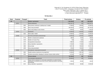 Załącznik Nr 2 do Zarządzenia Nr 36/2014 Wójta Gminy Wąbrzeźno z dnia 07 kwietnia 2014 r. zmieniający Uchwałę Nr XLIV/310/2013 Rady Gminy Wąbrzeźno z dnia 11 grudnia 2013 r. w sprawie uchwalenia budżetu gminy na 2014 r. w części dotyczącej załącznika Nr 2 – Wydatki WYDATK I Dział Rozdział Paragraf 801 80101 Treść 0,00 7 568 956,66 Szkoły podstawowe 4 942 361,79 0,00 4 942 361,79 17 000,00 3 060,00 20 060,00 246 250,00 - 3 500,00 242 750,00 2 000,00 440,00 2 440,00 Przedszkola 15 000,00 - 5 000,00 10 000,00 Różne opłaty i składki 15 000,00 - 5 000,00 10 000,00 Inne formy wychowania przedszkolnego 14 853,48 5 000,00 19 853,48 288,84 150,00 438,84 6,86 50,00 56,86 4300 Zakup usług pozostałych 4350 Zakup usług dostępu do sieci Internet 80106 Po zmianie 7 568 956,66 Zakup pomocy naukowych, dydaktycznych i książek 4430 Zmiana Oświata i wychowanie 4240 80104 Przed zmianą 4119 Składki na ubezpieczenia społeczne 4129 Składki na Fundusz Pracy 4179 Wynagrodzenia bezosobowe 1 680,00 1 100,00 2 780,00 4219 Zakup materiałów i wyposażenia 3 120,00 1 100,00 4 220,00 4269 Zakup energii 8 941,78 1 600,00 10 541,78 4309 Zakup usług pozostałych 816,00 1 000,00 1 816,00 Dokształcanie i doskonalenie nauczycieli 18 432,00 0,00 18 432,00 3020 Wydatki osobowe niezaliczone do wynagrodzeń 10 059,00 - 5 981,00 4 078,00 4700 Szkolenia pracowników niebędących członkami korpusu służby cywilnej 3 473,00 5 981,00 9 454,00 144 500,00 0,00 144 500,00 58 000,00 0,00 58 000,00 1 000,00 - 563,95 436,05 18 000,00 563,95 18 563,95 80146 851 Ochrona zdrowia 85154 Przeciwdziałanie alkoholizmowi 2330 Dotacje celowe przekazane do samorządu województwa na zadania bieżące realizowane na podstawie porozumień (umów) między jednostkami samorządu terytorialnego 4210 Zakup materiałów i wyposażenia 2 854 Edukacyjna opieka wychowawcza 85415 Pomoc materialna dla uczniów 47 800,00 119 971,00 167 771,00 1 000,00 119 971,00 120 971,00 3240 Stypendia dla uczniów 0,00 116 971,00 116 971,00 3260 Inne formy pomocy dla uczniów 0,00 3 000,00 3 000,00 30 401 890,04 119 971,00 30 521 861,04 Razem: