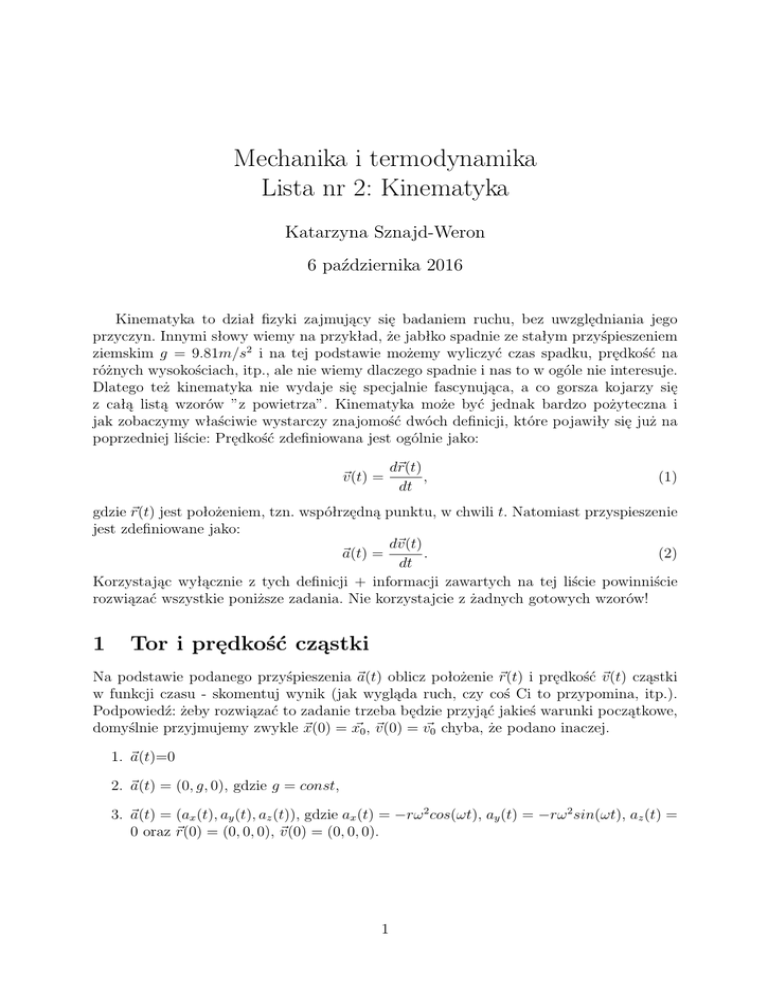 Mechanika i termodynamika Lista nr 2: Kinematyka