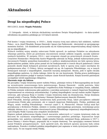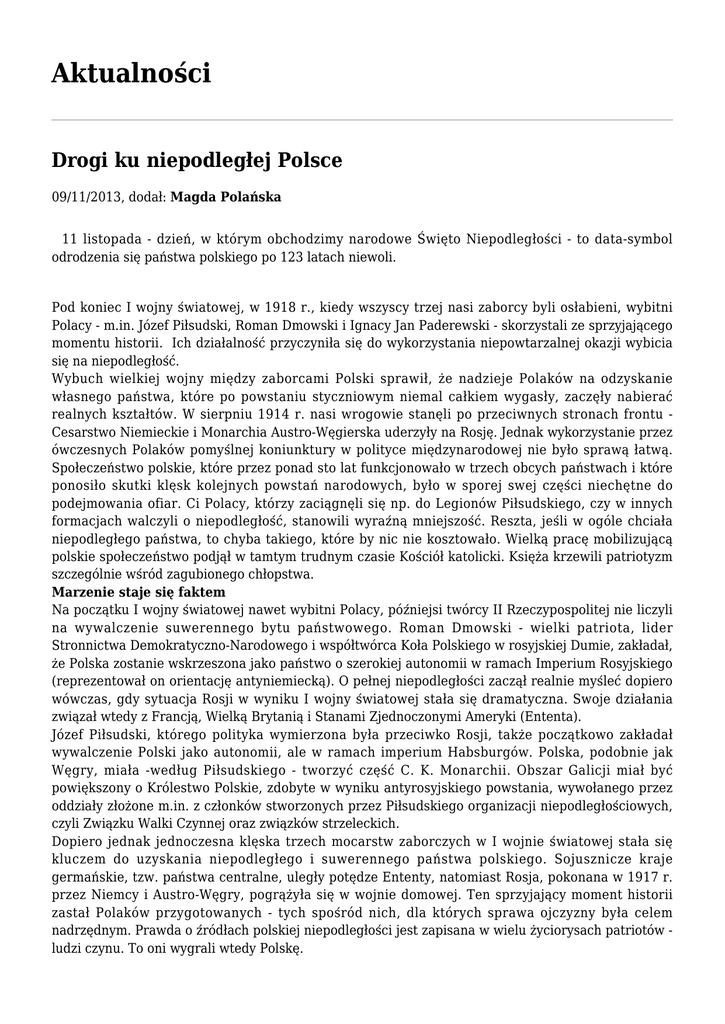 Aktualności Drogi ku niepodległej Polsce 09/11/2013, dodał: Magda Polańska 11 listopada - dzień, w którym obchodzimy narodowe Święto Niepodległości - to data-symbol odrodzenia się państwa polskiego po 123 latach niewoli. Pod koniec I wojny światowej, w 1918 r., kiedy wszyscy trzej nasi zaborcy byli osłabieni, wybitni Polacy - m.in. Józef Piłsudski, Roman Dmowski i Ignacy Jan Paderewski - skorzystali ze sprzyjającego momentu historii. Ich działalność przyczyniła się do wykorzystania niepowtarzalnej okazji wybicia się na niepodległość. Wybuch wielkiej wojny między zaborcami Polski sprawił, że nadzieje Polaków na odzyskanie własnego państwa, które po powstaniu styczniowym niemal całkiem wygasły, zaczęły nabierać realnych kształtów. W sierpniu 1914 r. nasi wrogowie stanęli po przeciwnych stronach frontu Cesarstwo Niemieckie i Monarchia Austro-Węgierska uderzyły na Rosję. Jednak wykorzystanie przez ówczesnych Polaków pomyślnej koniunktury w polityce międzynarodowej nie było sprawą łatwą. Społeczeństwo polskie, które przez ponad sto lat funkcjonowało w trzech obcych państwach i które ponosiło skutki klęsk kolejnych powstań narodowych, było w sporej swej części niechętne do podejmowania ofiar. Ci Polacy, którzy zaciągnęli się np. do Legionów Piłsudskiego, czy w innych formacjach walczyli o niepodległość, stanowili wyraźną mniejszość. Reszta, jeśli w ogóle chciała niepodległego państwa, to chyba takiego, które by nic nie kosztowało. Wielką pracę mobilizującą polskie społeczeństwo podjął w tamtym trudnym czasie Kościół katolicki. Księża krzewili patriotyzm szczególnie wśród zagubionego chłopstwa. Marzenie staje się faktem Na początku I wojny światowej nawet wybitni Polacy, późniejsi twórcy II Rzeczypospolitej nie liczyli na wywalczenie suwerennego bytu państwowego. Roman Dmowski - wielki patriota, lider Stronnictwa Demokratyczno-Narodowego i współtwórca Koła Polskiego w rosyjskiej Dumie, zakładał, że Polska zostanie wskrzeszona jako państwo o szerokiej autonomii w ramach Imperium Rosyjskiego (reprezentował on orientację antyniemiecką). O pełnej niepodległości zaczął realnie myśleć dopiero wówczas, gdy sytuacja Rosji w wyniku I wojny światowej stała się dramatyczna. Swoje działania związał wtedy z Francją, Wielką Brytanią i Stanami Zjednoczonymi Ameryki (Ententa). Józef Piłsudski, którego polityka wymierzona była przeciwko Rosji, także początkowo zakładał wywalczenie Polski jako autonomii, ale w ramach imperium Habsburgów. Polska, podobnie jak Węgry, miała -według Piłsudskiego - tworzyć część C. K. Monarchii. Obszar Galicji miał być powiększony o Królestwo Polskie, zdobyte w wyniku antyrosyjskiego powstania, wywołanego przez oddziały złożone m.in. z członków stworzonych przez Piłsudskiego organizacji niepodległościowych, czyli Związku Walki Czynnej oraz związków strzeleckich. Dopiero jednak jednoczesna klęska trzech mocarstw zaborczych w I wojnie światowej stała się kluczem do uzyskania niepodległego i suwerennego państwa polskiego. Sojusznicze kraje germańskie, tzw. państwa centralne, uległy potędze Ententy, natomiast Rosja, pokonana w 1917 r. przez Niemcy i Austro-Węgry, pogrążyła się w wojnie domowej. Ten sprzyjający moment historii zastał Polaków przygotowanych - tych spośród nich, dla których sprawa ojczyzny była celem nadrzędnym. Prawda o źródłach polskiej niepodległości jest zapisana w wielu życiorysach patriotów ludzi czynu. To oni wygrali wtedy Polskę. W obozie zwycięzców Nasz kraj dołączył do zwycięskiej koalicji jesienią 1917 r. dzięki dyplomatycznej działalności Narodowej Demokracji. Rządy państw Ententy uznały paryski Komitet Narodowy Polski (KNP), któremu przewodniczył Roman Dmowski, za oficjalną reprezentację Polski wśród nich. Zarazem podporządkowana KNP Armia Polska we Francji, zwana Błękitną, dowodzona przez gen. Józefa Hallera, została włączona w skład wojsk koalicyjnych i wspólnie z nimi, częścią oddziałów walczyła przeciw Niemcom na froncie zachodnim. Wymownym symbolem wspólnego zwycięstwa było podpisanie przez Dmowskiego z ramienia Rzeczypospolitej Polskiej - w porozumieniu z Józefem Piłsudskim - pokojowego Traktatu Wersalskiego (28 czerwca 1919 r.). Były to fakty o wielkim znaczeniu politycznym, jeśli wziąć pod uwagę, że powołane przez Piłsudskiego w 1914 r. u boku armii austro-węgierskiej Legiony Polskie - mające stanowić naszą kartę przetargową w toku wojennych zmagań wielkich mocarstw - do czasu tzw. kryzysu przysięgowego w 1917 r. walczyły po stronie Austro-Węgier i Niemiec. Wszystko dla Polski Hasłem naczelnym Piłsudskiego była walka z Rosją; gdy ta ustąpiła z pola, wówczas zwrócił się przeciwko pozostałym zaborcom Polski - Niemcom i Austriakom, z którymi wcześniej wiązał swoje plany. Jako pretekst do zerwania z państwami centralnymi posłużyła Piłsudskiemu odmowa złożenia przysięgi wierności cesarzom przez większą część żołnierzy Polskiej Siły Zbrojnej, czyli legionistów (kryzys przysięgowy). Piłsudski został aresztowany przez Niemców i osadzony w twierdzy magdeburskiej, a jego żołnierze, którzy odmówili złożenia przysięgi - internowani. W sensie politycznym rozwiązanie to było dla Piłsudskiego dobrodziejstwem, gdyż oddalało od niego i Legionów Polskich zarzut współpracy z państwami centralnymi. Stosunek Polaków do Piłsudskiego przeszedł swoistą ewolucję. W 1914 r. ten były socjalista budził wśród wielu rodaków nieufność, mimo że był twórcą i przywódcą wielkiego ruchu niepodległościowego, ale w 1917 r. był już niekwestionowanym bohaterem narodowym. Uwięziony przez Niemców stał się symbolem nieustępliwej i bezkompromisowej walki o pełną niepodległość. W chwili, kiedy rozpoczęła się I wojna światowa, niemała część społeczeńs