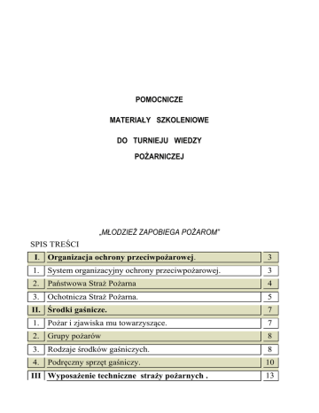 POMOCNICZE MATERIAŁY SZKOLENIOWE DO TURNIEJU WIEDZY POŻARNICZEJ „MŁODZIEŻ ZAPOBIEGA POŻAROM” SPIS TREŚCI I. Organizacja ochrony przeciwpożarowej. 3 1. System organizacyjny ochrony przeciwpożarowej. 3 2. Państwowa Straż Pożarna 4 3. Ochotnicza Straż Pożarna. 5 II. Środki gaśnicze. 7 1. Pożar i zjawiska mu towarzyszące. 7 2. Grupy pożarów 8 3. Rodzaje środków gaśniczych. 8 4. Podręczny sprzęt gaśniczy. 10 III Wyposażenie techniczne straży pożarnych . 13 . 1. Armatura wodna. 13 2. Sprzęt transportowy i motopompy. 15 3. Sprzęt burzący. 16 4. Odzież ochronna, specjalna i uzbrojenie osobiste. 17 IV Taktyka działań gaśniczych. . 20 1. Zasady i sposoby rozpoznania sytuacji pożarowej. 20 2. Podstawowe pojęcia z zakresu taktyki pożarniczej. 20 3. Rodzaje linii wężowych. 22 4. Podstawowe formy walki z pożarami. 24 5. Rodzaje i charakterystyka prądów wodnych. 26 6. Gaszenie pożarów. 27 V. Prewencja pożarowa. 32 1. Ogólnie obowiązujące zakazy i nakazy przeciwpożarowe. 32 2. Warunki ewakuacji. 35 3. Zasady wyposażania obiektów w podręczny sprzęt gaśniczy. 36 4. Zasady wyposażania obiektów w stałe i półstałe urządzenia gaśnicze. 37 5. Zabezpieczenie przeciwpożarowe lasów. 38 6. Zabezpieczenie przeciwpożarowe zbiorów, transportu i składowania polnych płodów rolnych. 39 7. Przeciwpożarowe wymagania budowlane. 40 8. Drogi pożarowe. 43 9. Przeciwpożarowe zaopatrzenie wodne. 44 10. Ochrona odgromowa obiektów budowlanych. 45 I. ORGANIZACJA OCHRONY PRZECIWPOŻAROWEJ. 1. SYSTEM ORGANIZACYJNY OCHRONY PRZECIWPOŻAROWEJ. System ochrony przeciwpożarowej ustala ustawa o ochronie przeciwpożarowej z dnia 24 sierpnia 1991 r. opublikowana w Dzienniku Ustaw Nr 81, poz. 351, z 1991 r. z późn. zm. Ochrona przeciwpożarowa polega na realizacji przedsięwzięć mających na celu ochronę życia, zdrowia, mienia lub środowiska przed pożarem, klęską żywiołową lub innym miejscowym zagrożeniem poprzez : - zapobieganie powstaniu i rozprzestrzenianiu się pożaru, klęski żywiołowej lub innego miejscowego zagrożenia, - zapewnienie sił i środków do zwalczania pożaru, klęski żywiołowej lub innego miejscowego zagrożenia, - prowadzenie działań ratowniczych. Ustawa o ochronie przeciwpożarowej z dnia 24 sierpnia 1991 r. wprowadziła pojęcie krajowego systemu ratowniczo – gaśniczego. Rozumie się przez to integralną część organizacji bezpieczeństwa wewnętrznego państwa, ma na celu ratowanie życia, zdrowia, mienia lub środowiska, prognozowanie, rozpoznawanie i zwalczanie pożarów, klęsk żywiołowych lub innych miejscowych zagrożeń. System ten skupia jednostki ochrony przeciwpożarowej, inne służby, inspekcje, straże, instytucje oraz podmioty/ organizacje, przedsiębiorstwa/, które dobrowolnie w drodze umowy cywilno - prawnej zgodziły się współdziałać w akcjach ratowniczych. Minister Spraw Wewnętrznych pełni nadzór nad systemem i jest zobowiązany do określenia, w drodze rozporządzenia szczegółowych zasad jego organizacji na obszarze powiatu, województwa i kraju. Centralnym organem administracji rządowej w sprawach organizacji krajowego systemu ratowniczo – gaśniczego oraz ochrony przeciwpożarowej jest Komendant Główny Państwowej Straży Pożarnej, podlegający Ministrowi Spraw Wewnętrznych i Administracji. Komendant Główny PSP, Wojewoda lub Starosta odpowiednio na obszarze kraju, województwa lub powiatu określają zadania krajowego systemu ratowniczo – gaśniczego, koordynują jego funkcjonowanie i kontrolują wykonywanie wynikających stąd zadań, a w sytuacjach nadzwyczajnych zagrożeń życia, zdrowia lub środowiska kierują tym systemem Wojewoda i Starosta wykonują swoje zadania przy pomocy zespołów do spraw ochrony przeciwpożarowej, powoływanych na podstawie zasad określonych przez Ministra Spraw Wewnętrznych i Administracji. Do walki z pożarami, klęskami żywiołowymi lub innymi miejscowymi zagrożeniami przeznaczone są jednostki ochrony przeciwpożarowej. Są to jednostki organizacyjne umundurowane i wyposażone w sprzęt specjalistyczny. W zależności od sposobu ich powoływania lub tworzenia dzielą się na : - jednostki organizacyjne Państwowej Straży Pożarnej – powołane z mocy prawa na podstawie ustawy o Państwowej Straży Pożarnej, - jednostki organizacyjne wojskowej ochrony przeciwpożarowej – powoływane przez Ministra Obrony Narodowej, - zakładowe straże pożarne, zakładowe służby ratownicze – tworzone przez osoby prawne / kierownictwa przedsiębiorstw /, - gminne zawodowe straże pożarne, powiatowe / miejskie / zawodowe straże pożarne, terenowe służby ratownicze – tworzone przez odpowiednie organy samorządu terytorialnego, - ochotnicze straże pożarne – stowarzyszenia powstające w wyniku zrzeszania się obywateli, - inne jednostki ratownicze – tworzone przez osoby prawne i fizyczne. 2. PAŃSTWOWA STRAŻ POŻARNA. Państwowa Straż Pożarna jest zawodową, umundurowaną i wyposażoną w specjalistyczny sprzęt formacją, przeznaczoną do walki z pożarami, klęskami żywiołowymi i innymi miejscowymi zagrożeniami. Do podstawowych zadań Państwowej Straży Pożarnej należy : 1/ rozpoznawanie zagrożeń pożarowych i innych miejscowych zagrożeń, 2/ organizowanie i prowadzenie akcji ratowniczych w czasie pożarów, klęsk żywiołowych lub likwidacji miejscowych zagrożeń, 3/ wykonywanie pomocniczych specjalistycznych czynności ratowniczych w czasie klęsk żywiołowych lub likwidacji miejscowych zagrożeń przez inne służby ratownicze, 4/ kształcenie kadr dla potrzeb Państwowej Straży Pożarnej i innych jednostek ochrony przeciwpożarowej oraz powszechnego systemu ochrony ludności, 5/ nadzór nad przestrzeganiem przepisów przeciwpożarowych, 6/ prowadzenie prac naukowo – badawczych w zakresie ochrony przeciwpożarowej oraz ochrony ludności. Państwowa Straż Pożarna jest organizatorem krajowego systemu ratownicz