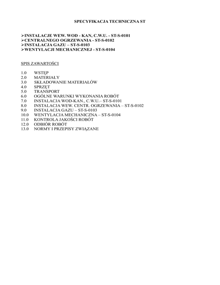 SPECYFIKACJA TECHNICZNA ST INSTALACJE WEW. WOD - KAN, C.W.U. - ST-S-0101 CENTRALNEGO OGRZEWANIA - ST-S-0102 INSTALACJA GAZU – ST-S-0103 WENTYLACJI MECHANICZNEJ - ST-S-0104 SPIS ZAWARTOŚCI 1.0 2.0 3.0 4.0 5.0 6.0 7.0 8.0 9.0 10.0 11.0 12.0 13.0 WSTĘP MATERIAŁY SKŁADOWANIE MATERIAŁÓW SPRZĘT TRANSPORT OGÓLNE WARUNKI WYKONANIA ROBÓT INSTALACJA WOD-KAN., C.W.U.– ST-S-0101 INSTALACJA WEW. CENTR. OGRZEWANIA – ST-S-0102 INSTALACJA GAZU – ST-S-0103 WENTYLACJA MECHANICZNA – ST-S-0104 KONTROLA JAKOŚCI ROBÓT ODBIÓR ROBÓT NORMY I PRZEPISY ZWIĄZANE 1.0. WSTĘP 1.1. Przedmiot Specyfikacji Technicznej Specyfikacja Techniczna „ST” odnosi się do wymagań technicznych, dotyczących wykonania, kontroli i odbioru robót budowlanych związanych z wykonaniem instalacji wod.–kan., c.o., wentylacji mechanicznej oraz gazu dla projektowanego budynku wielorodzinnego znajdującego się Szalejowie Górnym nr 125 dz. nr 240 w ramach projektu przebudowy budynku szkoły na budynek mieszkalny wielorodzinny. 1.2. Zakres stosowania Specyfikacji Technicznej Specyfikacja niniejsza stanowi część Dokumentów Przetargowych i Kontraktowych, związanych z z wykonaniem instalacji wod. – kan., c.o., wentylacji mechanicznej i grawitacyjnej oraz gazu dla projektowanego budynku wielorodzinnego znajdującego się Szalejowie Górnym nr 125 dz. nr 240 w ramach projektu przebudowy budynku szkoły na budynek mieszkalny wielorodzinny. Zawiera ona warunki techniczne wykonania oraz procedury kontroli, jakie muszą być stosowane przez Wykonawcę podczas całego procesu realizacji robót budowlanych, objętych Kontraktem. 1.3. Zakres robót objętych Specyfikacją „ST” Zakres robót objętych niniejszą Specyfikacją obejmuje roboty budowlane w zakresie instalacji sanitarnych w ramach przebudowy budynku szkoły na budynek mieszkalny wielorodzinny w Szalejowie Górnym nr 125 dz. nr 240. Roboty ujęte w niniejszych Specyfikacjach technicznych związanych z tym obiektem to: - roboty instalacji sanitarnych wewnętrznych: - instalacja wodociągowa wody zimnej i ciepłej - instalacja kanalizacji sanitarnej - instalacja centralnego ogrzewania - instalacja gazu - wentylacja mechaniczna 2.0. MATERIAŁY Materiały do remontu dawnego budynku szkoły w Szalejowie Górnym nr 125 muszą być zgodne z rozwiązaniami Dokumentacji Projektowej, niniejszą Specyfikacją oraz normami (PN i PN-EN) i obowiązującymi przepisami, powinny posiadać aprobaty i spełniać kryteria techniczne dotyczące wyrobów budowlanych – zgodnie z rozporządzeniem Ministra Gosp. Przestrzennej i Budownictwa z dnia 19 grudnia 1994 r /Dz.U. Nr10 z dnia 8.02.1995/ 2.1. Rodzaje materiałów Podstawowymi materiałami stosowanymi przy wykonywaniu robót objętych niniejszą ST są: 2.1.1. Instalacje wewnętrzne - rury i kształtki PVC klasy N - rury i kształtki PVC-U klasy S - rury tworzywowe typ PE-Xc z polietylenu sieciowanego - rury osłonowe - rury stalowe - armatura odcinająca - uchwyty mocujące - urządzenia sanitarne (umywalki, zlewozmywaki, muszle, brodziki, wanny) - urządzenia grzewcze (grzejniki) - urządzenia gazowe (gazomierze, piece gazowe dwufunkcyjne) - armatura wodociągowa i grzewcza - urządzenia wentylacyjne (wentylatory łazienkowe) 2.1.2. Żwir, piasek, zaprawa cementowa Jeśli dokumentacja projektowa lub ST przewiduje wykonanie podsypek, to materiały do ich wykonania powinny odpowiadać następującym normom: - żwir i mieszanka - PN-B-11111 [6], - piasek - PN-B-11113 [7], - zaprawa cementowa - PN-B-14501 [8]. 2.1.3. Rurociągi kanalizacji wewnętrznej Kanalizację wewnętrzną należy wykonać z rur przewodowych typ PVC do kanalizacji grawitacyjnej o połączeniach kielichowych z uszczelka gumową (posiadające aprobatę techniczną). Wymagane rury klasy N oraz klasy S o średnicach i wymiarach zgodnych z Dokumentacją Projektową. 2.1.4. Rurociągi instalacji zimnej i ciepłej wody Rurociągi ciepłej i zimnej wody ułożone w posadzce oraz w bruzdach w ścianach z rur wodociągowych z polietylenu sieciowanego PE-Xc posiadające atest higieniczny PZH. Rurociągi należy układać w rurach osłonowych. Średnice i wymiary zgodnie z Dokumentacją Projektową. 2.1.5. Rurociągi instalacji gazu Rurociągi stalowe łączone będą przez spawanie. Przed zamontowaniem należy sprawdzić czy elementy przewidziane do zamontowania nie posiadają uszkodzeń mechanicznych oraz czy w przewodach nie ma zanieczyszczeń wolno używać. Przewody poziome prowadzone przy ścianach, na lub pod stropami itp. powinny spoczywać na podporach stałych (w uchwytach) i ruchomych (w uchwytach, na wspornikach, zwieszeniach itp.) usytuowanych w odstępach nie mniejszych niż wynika to z wymagań dla materiału z którego wykonane są rury. Średnice i wymiary zgodnie z Dokumentacją Projektową. 2.1.6. Rurociągi instalacji grzewczej Rurociągi instalacji grzejnej ułożone w posadzce oraz przy ścianach z rur grzejnych z polietylenu sieciowanego PE-Xc posiadające powłokę antydyfuzyjną. Rurociągi należy układać w rurach osłonowych. Średnice i wymiary zgodnie z Dokumentacją Projektową. Rury układać w sposób umożliwiający kompensację wydłużeń cieplnych. Przejścia przez ściany i stropy wykonać w tulejach ochronnych. 2.5. Urządzenia i przybory sanitarne Pozostałe urządzenia i materiały instalacyjne zgodnie z Dokumentacją Projektową. Na podejściach pod umywalki zlewy i spłuczki klozetowe zamontować zawory odcinające kulowe, zawory napowietrzające oraz kominki wentylacyjne w miejscach wskazanych w części graficznej opracowania. Połączenie zaworów z bateriami za pomocą węży elastycznych. 2.6. Urządzenia i przybory grzejne Urządzenia i materiały do instalacji grzejnej zgodnie z Dokumentacją Projektową. Do ogrzewania pomieszczeń zastosowano ogrzewanie grzejnikowe. Grzejniki stalowe konwektorowe, jedno lub dwupłytowe. Przy każdym grzejniku zamontować zawór termostatyczny - na zasileniu i zawór odcinając