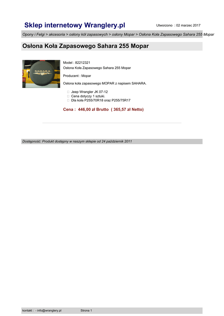 Sklep internetowy Wranglery.pl Utworzono : 02 marzec 2017 Opony i Felgi > akcesoria > osłony kół zapasowych > osłony Mopar > Osłona Koła Zapasowego Sahara 255 Mopar Osłona Koła Zapasowego Sahara 255 Mopar Model : 82212321 Osłona Koła Zapasowego Sahara 255 Mopar Producent : Mopar Osłona koła zapasowego MOPAR z napisem SAHARA. � Jeep Wrangler JK 07-12 � Cena dotyczy 1 sztuki. � Dla koła P255/70R18 oraz P255/75R17 Cena : 446,00 zł Brutto ( 365,57 zł Netto) Dostępność: Produkt dostępny w naszym sklepie od 24 październik 2011 kontakt : - [email protected] Strona 1