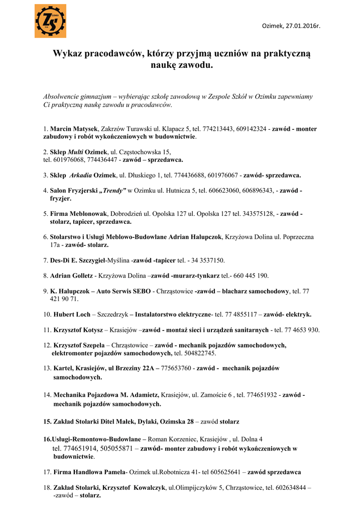 Ozimek, 27.01.2016r. Wykaz pracodawców, którzy przyjmą uczniów na praktyczną naukę zawodu. Absolwencie gimnazjum – wybierając szkołę zawodową w Zespole Szkół w Ozimku zapewniamy Ci praktyczną naukę zawodu u pracodawców. 1. Marcin Matysek, Zakrzów Turawski ul. Klapacz 5, tel. 774213443, 609142324 - zawód - monter zabudowy i robót wykończeniowych w budownictwie. 2. Sklep Multi Ozimek, ul. Częstochowska 15, tel. 601976068, 774436447 - zawód – sprzedawca. 3. Sklep Arkadia Ozimek, ul. Dłuskiego 1, tel. 774436688, 601976067 - zawód- sprzedawca. 4. Salon Fryzjerski „Trendy” w Ozimku ul. Hutnicza 5, tel. 606623060, 606896343, - zawód fryzjer. 5. Firma Meblonowak, Dobrodzień ul. Opolska 127 ul. Opolska 127 tel. 343575128, - zawód stolarz, tapicer, sprzedawca. 6. Stolarstwo i Usługi Meblowo-Budowlane Adrian Halupczok, Krzyżowa Dolina ul. Poprzeczna 17a - zawód- stolarz. 7. Des-Di E. Szczygieł-Myślina -zawód -tapicer tel. - 34 3537150. 8. Adrian Golletz - Krzyżowa Dolina –zawód -murarz-tynkarz tel.- 660 445 190. 9. K. Halupczok – Auto Serwis SEBO - Chrząstowice -zawód – blacharz samochodowy, tel. 77 421 90 71. 10. Hubert Loch – Szczedrzyk – Instalatorstwo elektryczne- tel. 77 4855117 – zawód- elektryk. 11. Krzysztof Kotysz – Krasiejów –zawód - montaż sieci i urządzeń sanitarnych - tel. 77 4653 930. 12. Krzysztof Szepela – Chrząstowice – zawód - mechanik pojazdów samochodowych, elektromonter pojazdów samochodowych, tel. 504822745. 13. Kartel, Krasiejów, ul Brzeziny 22A – 775653760 - zawód - mechanik pojazdów samochodowych. 14. Mechanika Pojazdowa M. Adamietz, Krasiejów, ul. Zamoście 6 , tel. 774651932 - zawód mechanik pojazdów samochodowych. 15. Zakład Stolarki Ditel Małek, Dylaki, Ozimska 28 – zawód stolarz 16.Usługi-Remontowo-Budowlane – Roman Korzeniec, Krasiejów , ul. Dolna 4 tel. 774651914, 505055871 – zawód- monter zabudowy i robót wykończeniowych w budownictwie. 17. Firma Handlowa Pamela- Ozimek ul.Robotnicza 41- tel 605625641 – zawód sprzedawca 18. Zakład Stolarki, Krzysztof Kowalczyk, ul.Olimpijczyków 5, Chrząstowice, tel. 602634844 – -zawód – stolarz. Ozimek, 27.01.2016r. 19. Badura Meble-Dobrodzień, ul.Wojska Polskiego 67, tel. 600-676-940 – zawód-stolarz