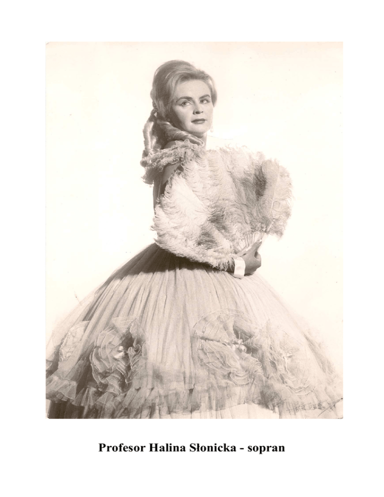 Profesor Halina Słonicka - sopran Profesor Halina Słonicka - sopran, śpiewaczka operowa Urodziła się 29 marca w Czernianach na Polesiu, gdzie jej ojciec był nadleśniczym. Specyficzna atmosfera domu rodzinnego na polskich Kresach Wschodnich nie pozostała bez wpływu na późniejszy rozwój artystyczny młodej, bardzo wrażliwej kobiety. Nie bez znaczenia były także późniejsze, tragiczne doświadczenia, a zwłaszcza przedwczesna śmierć ojca. Lata dzieciństwa spędziła w Hajnówce. Szkołę średnią ukończyła w Białymstoku. Tu właśnie miał miejsce jej pierwszy kontakt z operą. Wystąpiła bowiem jako uczennica w konkursie „Szukamy talentów śpiewaczych” wykonując arię Halki S. Moniuszki i walc Caton z Casanovy L. Różyckiego, i wyśpiewała pierwszą nagrodę. Po maturze wyjechała do Warszawy, gdzie została przyjęta na Wydział Architektury Politechniki Warszawskiej; równocześnie była słuchaczką średniej szkoły muzycznej i uczęszczała na naukę śpiewu u prof. Magdaleny Halfterowej. Dyplom tej szkoły uzyskała w 1955 roku, będąc w międzyczasie solistką Zespołu Pieśni i Tańca Wojska Polskiego. Nie zaniedbała jednak studiów wokalnych, kontynuowała je w latach 1955 - 1960 w warszawskiej Akademii Muzycznej także w klasie prof. M. Halfterowej. Od 1957 roku występowała jako solistka w Operze Warszawskiej debiutując partią Zofii w Halce S. Moniuszki i Frasquitą w Carmen G. Bizeta. Rok później zaśpiewała rolę Hanny w Strasznym Dworze S. Moniuszki. Jej oryginalna interpretacja została bardzo wysoko oceniona przez krytykę: „Jej głos brzmi równo, artystka świetnie go prowadzi, posiada też ładną barwę” [A. Rowiński, 1958]. W roku 1959 po raz pierwszy wykonała partię - marzenie: Violettę w Traviacie G. Verdiego. Śpiewała ją później wielokrotnie zarówno na scenach polskich jak i zagranicznych nadając swej interpretacji ogromną ekspresję i wielką szlachetność. Wokalnie była perfekcyjna, a także doskonała dramaturgicznie. Wysokie dźwięki i koloraturę śpiewała z brawurą i lekkością. Kolejne partie solistki na scenie warszawskiej to: Ewa w Hrabinie S. Moniuszki, Gilda w Rigoletcie G. Verdiego, Zerlina i Donna Anna w Don Juanie W.A. Mozarta, Mimi w Cyganerii G. Pucciniego, Elżbieta w Don Carlosie G. Verdiego, Roksana w Królu Rogerze K. Szymanowskiego, Micaela w Carmen G. Bizeta, Desdemona w Otellu G. Verdiego, Pani Ford w Falstaffie G. Verdiego. Artystka zaśpiewała 30 partii. Wykonała je głównie na scenie Teatru Wielkiego w Warszawie, a także Vercelli, Moskwie, Hertogenbosh, Tuluzie, Genewie, Rio de Janeiro. O jej rolach scenicznych krytycy wyrażali się z entuzjazmem: „Podkreślamy sukces ujmującej piękną aparycją i szlachetnością głosu Haliny Słonickiej” [J. Macierakowski 1964]. Oprócz partii operowych śpiewała pieśni i oratoria, a także kantaty (miała ich w repertuarze 30) m.in. J. S Bacha, L. van Beethovena, J. Haydna i W.A. Mozarta. Współpracowała z wybitnymi dyrygentami m.in. J. Krenzem, S. Wisłockim, J. Katlewiczem, W. Bierdiajewem, J. Semkowem, W. Rowickim, B. Wodiczką, P. Kleckim, K. Masurem. Od 1980 roku poświęciła się pracy pedagogicznej. Początkowo wykładała na Wydziale Wychowania Muzycznego Filii Warszawskiej Akademii Muzycznej, a potem w stołecznej Akademii Muzycznej im. F. Chopina. Zmarła w 2000 roku. Spoczęła na białostockim cmentarzu prawosławnym, obok matki. Inskrypcję na pomniku zaproponowali jej uczniowie: „Wielka artystka, wybitny pedagog, szlachetny człowiek”. / Informacja ze strony OiFP w Białymstoku, cyt. za Elżbietą Kozłowską - Świątkowską /
