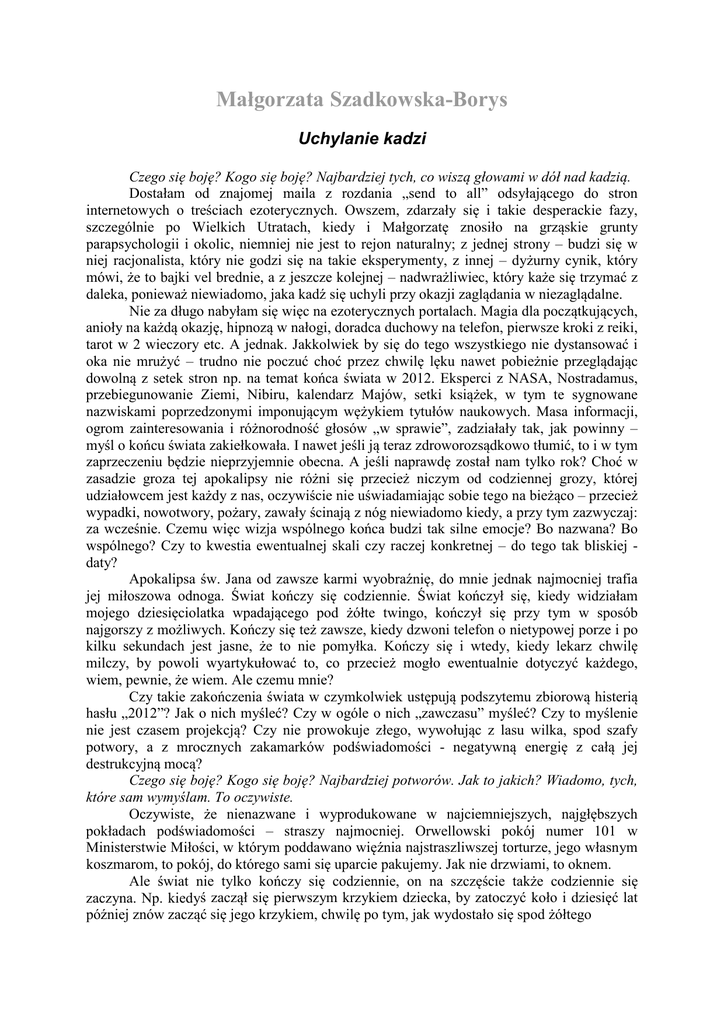 Małgorzata Szadkowska-Borys Uchylanie kadzi Czego się boję? Kogo się boję? Najbardziej tych, co wiszą głowami w dół nad kadzią. Dostałam od znajomej maila z rozdania „send to all” odsyłającego do stron internetowych o treściach ezoterycznych. Owszem, zdarzały się i takie desperackie fazy, szczególnie po Wielkich Utratach, kiedy i Małgorzatę znosiło na grząskie grunty parapsychologii i okolic, niemniej nie jest to rejon naturalny; z jednej strony – budzi się w niej racjonalista, który nie godzi się na takie eksperymenty, z innej – dyżurny cynik, który mówi, że to bajki vel brednie, a z jeszcze kolejnej – nadwrażliwiec, który każe się trzymać z daleka, ponieważ niewiadomo, jaka kadź się uchyli przy okazji zaglądania w niezaglądalne. Nie za długo nabyłam się więc na ezoterycznych portalach. Magia dla początkujących, anioły na każdą okazję, hipnozą w nałogi, doradca duchowy na telefon, pierwsze kroki z reiki, tarot w 2 wieczory etc. A jednak. Jakkolwiek by się do tego wszystkiego nie dystansować i oka nie mrużyć – trudno nie poczuć choć przez chwilę lęku nawet pobieżnie przeglądając dowolną z setek stron np. na temat końca świata w 2012. Eksperci z NASA, Nostradamus, przebiegunowanie Ziemi, Nibiru, kalendarz Majów, setki książek, w tym te sygnowane nazwiskami poprzedzonymi imponującym wężykiem tytułów naukowych. Masa informacji, ogrom zainteresowania i różnorodność głosów „w sprawie”, zadziałały tak, jak powinny – myśl o końcu świata zakiełkowała. I nawet jeśli ją teraz zdroworozsądkowo tłumić, to i w tym zaprzeczeniu będzie nieprzyjemnie obecna. A jeśli naprawdę został nam tylko rok? Choć w zasadzie groza tej apokalipsy nie różni się przecież niczym od codziennej grozy, której udziałowcem jest każdy z nas, oczywiście nie uświadamiając sobie tego na bieżąco – przecież wypadki, nowotwory, pożary, zawały ścinają z nóg niewiadomo kiedy, a przy tym zazwyczaj: za wcześnie. Czemu więc wizja wspólnego końca budzi tak silne emocje? Bo nazwana? Bo wspólnego? Czy to kwestia ewentualnej skali czy raczej konkretnej – do tego tak bliskiej daty? Apokalipsa św. Jana od zawsze karmi wyobraźnię, do mnie jednak najmocniej trafia jej miłoszowa odnoga. Świat kończy się codziennie. Świat kończył się, kiedy widziałam mojego dziesięciolatka wpadającego pod żółte twingo, kończył się przy tym w sposób najgorszy z możliwych. Kończy się też zawsze, kiedy dzwoni telefon o nietypowej porze i po kilku sekundach jest jasne, że to nie pomyłka. Kończy się i wtedy, kiedy lekarz chwilę milczy, by powoli wyartykułować to, co przecież mogło ewentualnie dotyczyć każdego, wiem, pewnie, że wiem. Ale czemu mnie? Czy takie zakończenia świata w czymkolwiek ustępują podszytemu zbiorową histerią hasłu „2012”? Jak o nich myśleć? Czy w ogóle o nich „zawczasu” myśleć? Czy to myślenie nie jest czasem projekcją? Czy nie prowokuje złego, wywołując z lasu wilka, spod szafy potwory, a z mrocznych zakamarków podświadomości - negatywną energię z całą jej destrukcyjną mocą? Czego się boję? Kogo się boję? Najbardziej potworów. Jak to jakich? Wiadomo, tych, które sam wymyślam. To oczywiste. Oczywiste, że nienazwane i wyprodukowane w najciemniejszych, najgłębszych pokładach podświadomości – straszy najmocniej. Orwellowski pokój numer 101 w Ministerstwie Miłości, w którym poddawano więźnia najstraszliwszej torturze, jego własnym koszmarom, to pokój, do którego sami się uparcie pakujemy. Jak nie drzwiami, to oknem. Ale świat nie tylko kończy się codziennie, on na szczęście także codziennie się zaczyna. Np. kiedyś zaczął się pierwszym krzykiem dziecka, by zatoczyć koło i dziesięć lat później znów zacząć się jego krzykiem, chwilę po tym, jak wydostało się spod żółtego Małgorzata Szadkowska-Borys twingo. O jednym i drugim początku śmiało można powiedzieć: cud. Chyba jest to uprawnione. Bardzo bym chciał, żebyś o tym napisała. I bardzo bym chciał nigdy tego nie przeczytać. Świetnie umocowana psychologicznie prawda o radzeniu sobie z traumą: odnaleźć imiona tych, którzy wiszą nad kadzią, to najskuteczniejszy sposób na ich oswojenie, a z drugiej strony – naturalna jest przecież potrzeba ucieczki, wyparcia, odsunięcie problemu, zamknięcia oczu, kiedy zza rogu wysuwa się Złe. Kolokwialnie mówiąc – nie ma mądrych w sprawie. Co najlepiej działa na strachy? Wiadomo przecież. Mama. I Łapacz Snów (tylko nie można zapominać o tym, by raz po raz go przewietrzyć). A może histeria pt. 2012 to tak naprawdę samorodna terapia? Zdrowe i zbawienne skanalizowanie nienazwanych strachów? Może lepiej nam drżeć we wspólnocie zalogowanych na ponury_profeta.org, dokładnie wiedząc, czego się boimy? Mama i łapacz snów nie zawsze pod ręką, a wtedy taki nazwany, konkretny – „swój” strach to najlepszy wariant kadzi, jaki może się przydarzyć. /Małgorzata Szadkowska-Borys [email protected] grudzień 2010/styczeń 2011 kursywą: M. (lat 10) Gazeta Literacka Migotania, 1(30)/2011, str.2