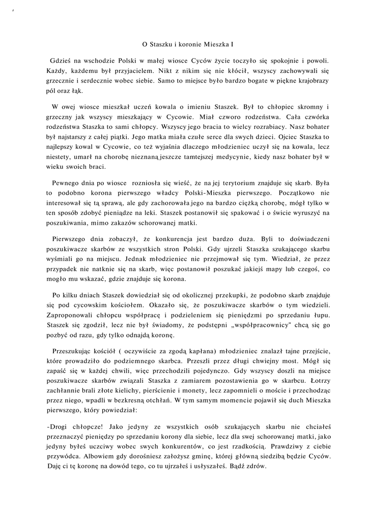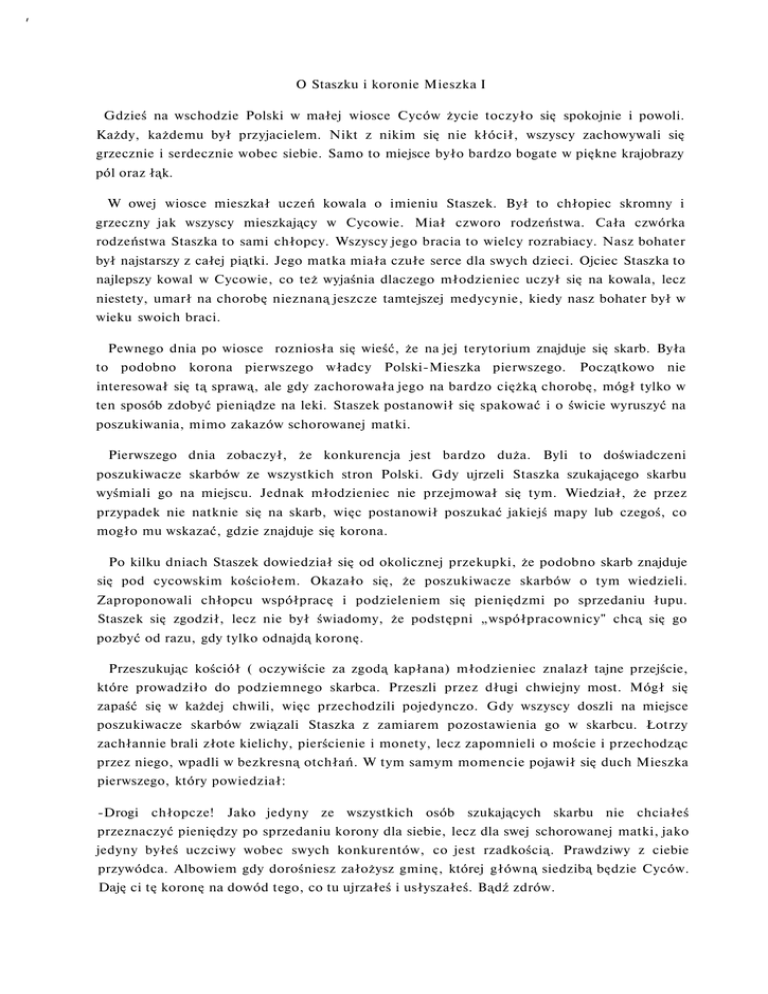 t O Staszku i koronie Mieszka I Gdzieś na wschodzie Polski w małej wiosce Cyców życie toczyło się spokojnie i powoli. Każdy, każdemu był przyjacielem. Nikt z nikim się nie kłócił, wszyscy zachowywali się grzecznie i serdecznie wobec siebie. Samo to miejsce było bardzo bogate w piękne krajobrazy pól oraz łąk. W owej wiosce mieszkał uczeń kowala o imieniu Staszek. Był to chłopiec skromny i grzeczny jak wszyscy mieszkający w Cycowie. Miał czworo rodzeństwa. Cała czwórka rodzeństwa Staszka to sami chłopcy. Wszyscy jego bracia to wielcy rozrabiacy. Nasz bohater był najstarszy z całej piątki. Jego matka miała czułe serce dla swych dzieci. Ojciec Staszka to najlepszy kowal w Cycowie, co też wyjaśnia dlaczego młodzieniec uczył się na kowala, lecz niestety, umarł na chorobę nieznaną jeszcze tamtejszej medycynie, kiedy nasz bohater był w wieku swoich braci. Pewnego dnia po wiosce rozniosła się wieść, że na jej terytorium znajduje się skarb. Była to podobno korona pierwszego władcy Polski-Mieszka pierwszego. Początkowo nie interesował się tą sprawą, ale gdy zachorowała jego na bardzo ciężką chorobę, mógł tylko w ten sposób zdobyć pieniądze na leki. Staszek postanowił się spakować i o świcie wyruszyć na poszukiwania, mimo zakazów schorowanej matki. Pierwszego dnia zobaczył, że konkurencja jest bardzo duża. Byli to doświadczeni poszukiwacze skarbów ze wszystkich stron Polski. Gdy ujrzeli Staszka szukającego skarbu wyśmiali go na miejscu. Jednak młodzieniec nie przejmował się tym. Wiedział, że przez przypadek nie natknie się na skarb, więc postanowił poszukać jakiejś mapy lub czegoś, co mogło mu wskazać, gdzie znajduje się korona. Po kilku dniach Staszek dowiedział się od okolicznej przekupki, że podobno skarb znajduje się pod cycowskim kościołem. Okazało się, że poszukiwacze skarbów o tym wiedzieli. Zaproponowali chłopcu współpracę i podzieleniem się pieniędzmi po sprzedaniu łupu. Staszek się zgodził, lecz nie był świadomy, że podstępni „współpracownicy" chcą się go pozbyć od razu, gdy tylko odnajdą koronę. Przeszukując kościół ( oczywiście za zgodą kapłana) młodzieniec znalazł tajne przejście, które prowadziło do podziemnego skarbca. Przeszli przez długi chwiejny most. Mógł się zapaść się w każdej chwili, więc przechodzili pojedynczo. Gdy wszyscy doszli na miejsce poszukiwacze skarbów związali Staszka z zamiarem pozostawienia go w skarbcu. Łotrzy zachłannie brali złote kielichy, pierścienie i monety, lecz zapomnieli o moście i przechodząc przez niego, wpadli w bezkresną otchłań. W tym samym momencie pojawił się duch Mieszka pierwszego, który powiedział: -Drogi chłopcze! Jako jedyny ze wszystkich osób szukających skarbu nie chciałeś przeznaczyć pieniędzy po sprzedaniu korony dla siebie, lecz dla swej schorowanej matki, jako jedyny byłeś uczciwy wobec swych konkurentów, co jest rzadkością. Prawdziwy z ciebie przywódca. Albowiem gdy dorośniesz założysz gminę, której główną siedzibą będzie Cyców. Daję ci tę koronę na dowód tego, co tu ujrzałeś i usłyszałeś. Bądź zdrów. -Dziękuję...- odpowiedział dumny z siebie, ale nieco przestraszony Staszek. Gdy młodzieniec wrócił do domu jego matka była zdrowa i pełna sił. Uradowany Staszek przytulił ją. Kiedy Staszek stał się mężczyzną, zebrał reprezentantów sąsiednich wiosek i razem założyli Gminę Cyców. Od tamtej pory chodzą słuchy o uczciwym Staszku i koronie Mieszka pierwszego, którą do dziś nie wiadomo, gdzie ukrył założyciel Gminy Cyców.
