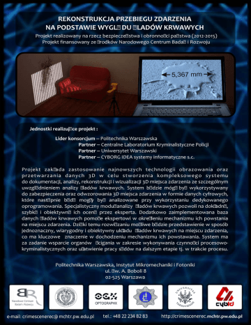 REKONSTRUKCJA PRZEBIEGU ZDARZENIA NA PODSTAWIE WYGLĄDU ŚLADÓW KRWAWYCH Projekt realizowany na rzecz bezpieczeństwa i obronności państwa (2012-2015) Projekt finansowany ze środków Narodowego Centrum Badań i Rozwoju 5,367 mm Jednostki realizujące projekt : Lider konsorcjum – Politechnika Warszawska Partner – Centralne Laboratorium Kryminalistyczne Policji Partner – Uniwersytet Warszawski Partner – CYBORG IDEA systemy informatyczne s.c. Projekt zakłada zastosowanie najnowszych technologii obrazowania oraz przetwarzania danych 3D w celu stworzenia kompleksowego systemu do dokumentacji, analizy, rekonstrukcji i wizualizacji 3D miejsca zdarzenia ze szczególnym uwzględnieniem analizy śladów krwawych. System będzie mógł być wykorzystywany do zabezpieczenia oraz odwzorowania 3D miejsca zdarzenia w formie danych cyfrowych, które następnie będą mogły być analizowane przy wykorzystaniu dedykowanego oprogramowania. Specjalistyczny moduł analizy śladów krwawych pozwoli na dokładną, szybką i obiektywną ich ocenę przez eksperta. Dodatkowo zaimplementowana baza danych śladów krwawych pomoże ekspertowi w określeniu mechanizmu ich powstania na miejscu zdarzenia. Dzięki temu rozwiązaniu możliwe będzie przedstawienie w sposób jednoznaczny, wiarygodny i obiektywny układu śladów krwawych na miejscu zdarzenia, co ma kluczowe znaczenie w dochodzeniu mechanizmu ich powstawania. System ma za zadanie wsparcie organów ścigania w zakresie wykonywania czynności procesowokryminalistycznych oraz ułatwienie pracy sądów na dalszym etapie tj. w trakcie procesu. HN IKA WARS ZA UN N OL O AW RS WA GY A PO SK LI EC W T Politechnika Warszawska, Instytut Mikromechaniki i Fotoniki ul. Św. A. Boboli 8 02-525 Warszawa IV E EC RSIT Y OF T H e-mail: [email protected] OPTOGRAPHX tel.: +48 22 234 82 83 http://crimescenerec.mchtr.pw.edu.pl Innowacyjność rozwiązania Wyznaczniki innowacyjności systemu: – zastąpienie subiektywnych szkiców sytuacyjnych i fotografii tradycyjnej obiektywnymi danymi trójwymiarowymi, – odtworzenie sceny zdarzenia w wirtualnej przestrzeni trójwymiarowej z zachowaniem dużej dokładności odtworzenia istotnych szczegółów, – możliwość konstruowania opinii przez ekspertów na podstawie obiektywnych danych bez konieczności pojawienia się na miejscu zdarzenia, – kompleksowa myśl technologiczna począwszy od rozwiązań sprzętowych i informatycznych, a kończąc na badaniu prototypu i szkoleniach użytkowników końcowych. Interdyscyplinarny zespół Złożoność projektu wymaga połączenia wiedzy i doświadczenia specjalistów z wielu dziedzin. Zespół z Politechniki Warszawskiej posiada ponad dziesięcioletnie doświadczenie w opracowywaniu rozwiązań naukowych i praktycznych z obszaru obrazowania 3D oraz algorytmów do równoległego przetwarzania dużych zbiorów danych. Centralne Laboratorium Kryminalistyczne Policji jest jedyną placówką badawczą w Polsce profesjonalnie zajmującą się naukowym wspieraniem procesów wykrywczych w sprawach karnych. Firma CYBORG IDEA ma doświadczenie w opracowywaniu i wdrażaniu rozwiązań przeznaczonych do dokumentacji miejsc zdarzeń kryminalnych, rozwiązań wspomagających analizę i rekonstrukcję zdarzeń drogowych oraz technikach fotogrametrycznych. Katedra Kryminalistyki Wydziału Prawa i Administracji Uniwersytetu Warszawskiego jest wiodącym ośrodkiem akademickim w swojej dziedzinie w Polsce. Efekt końcowy Wynikiem końcowym realizacji projektu będzie działający w warunkach rzeczywistych prototyp systemu składający się z: – trzech skanerów 3D (ogólny, sytuacyjny i szczegółowy) do zabezpieczania śladów krwawych na miejscu zdarzenia: • skaner 3D dokumentujący całą scenę (technika powrotu impulsu), objętość pomiarowa w promieniu do 25m z rozdzielczością około 2-3mm przy niepewności pomiaru poniżej 4mm, • skaner 3D do pomiarów sytuacyjnych (technika z oświetleniem strukturalnym), objętość pomiarowa około 1m x 0,6m x 0,5m z rozdzielczością do 0,3mm przy niepewności pomiaru poniżej 0,1mm, • skaner 3D do pomiarów szczegółowych (technika z oświetleniem strukturalnym), objętość pomiarowa około 100mm x 60mm x 50mm z rozdzielczością do 30µm przy niepewności pomiaru poniżej 5µm, – bazy danych śladów krwawych służących do ich analizy w wersji 2D i 3D, – oprogramowania do rekonstrukcji miejsca zdarzenia w przestrzeni 3D z pełnym odtworzeniem w jednym modelu nawet najbardziej szczegółowych pomiarów oraz dodatkowych materiałów, dodatkowo moduł do raportowania. e-mail: [email protected] tel.: +48 22 234 82 83 http://crimescenerec.mchtr.pw.edu.pl