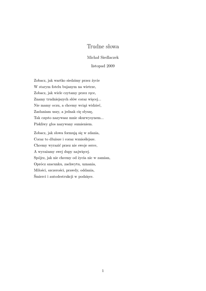 Trudne słowa Michał Siedlaczek listopad 2009 Zobacz, jak wartko siedzimy przez życie W starym fotelu bujanym na wietrze, Zobacz, jak wiele czytamy przez ręce, Znamy trudniejszych słów coraz więcej... Nie mamy oczu, a chcemy wciąż widzieć, Zasłaniam uszy, a jednak cię słyszę, Tak często nazywasz mnie skurwysynem... Piskliwy głos nazywany sumieniem. Zobacz, jak słowa formują się w zdania, Coraz to dłuższe i coraz wznioślejsze. Chcemy wyrazić przez nie swoje serce, A wyrażamy swej dupy najwięcej. Spójrz, jak nie chcemy od życia nic w zamian, Oprócz szacunku, zachwytu, uznania, Miłości, szczerości, prawdy, oddania, Śmierci i autodestrukcji w podzięce. 1