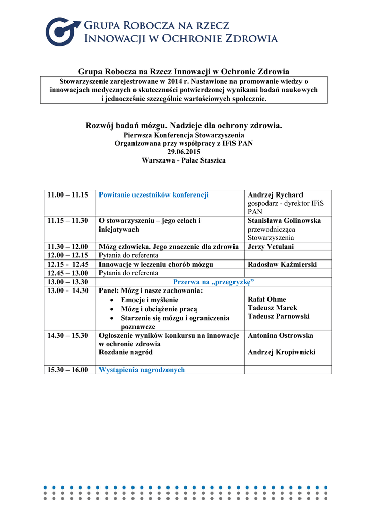 Grupa Robocza na Rzecz Innowacji w Ochronie Zdrowia Stowarzyszenie zarejestrowane w 2014 r. Nastawione na promowanie wiedzy o innowacjach medycznych o skuteczności potwierdzonej wynikami badań naukowych i jednocześnie szczególnie wartościowych społecznie. Rozwój badań mózgu. Nadzieje dla ochrony zdrowia. Pierwsza Konferencja Stowarzyszenia Organizowana przy współpracy z IFiS PAN 29.06.2015 Warszawa - Pałac Staszica 11.00 – 11.15 Powitanie uczestników konferencji 11.15 – 11.30 O stowarzyszeniu – jego celach i inicjatywach 11.30 – 12.00 12.00 – 12.15 12.15 - 12.45 12.45 – 13.00 13.00 – 13.30 13.00 - 14.30 Mózg człowieka. Jego znaczenie dla zdrowia Pytania do referenta Innowacje w leczeniu chorób mózgu Radosław Kaźmierski Pytania do referenta Przerwa na „przegryzkę” Panel: Mózg i nasze zachowania: Rafał Ohme Emocje i myślenie Tadeusz Marek Mózg i obciążenie pracą Tadeusz Parnowski Starzenie się mózgu i ograniczenia poznawcze Ogłoszenie wyników konkursu na innowacje Antonina Ostrowska w ochronie zdrowia Rozdanie nagród Andrzej Kropiwnicki 14.30 – 15.30 15.30 – 16.00 Wystąpienia nagrodzonych Andrzej Rychard gospodarz - dyrektor IFiS PAN Stanisława Golinowska przewodnicząca Stowarzyszenia Jerzy Vetulani