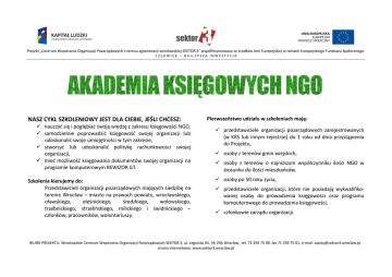 Projekt „Centrum Wspierania Organizacji Pozarządowych z terenu aglomeracji wrocławskiej SEKTOR 3” współfinansowany ze środków Unii Europejskiej w ramach Europejskiego Funduszu Społecznego. CZŁOWIEK – NAJLEPSZA INWESTYCJA NASZ CYKL SZKOLENIOWY JEST DLA CIEBIE, JEŚLI CHCESZ: nauczyć się i pogłębiać swoją wiedzę z zakresu księgowości NGO, samodzielnie poprowadzić księgowość swojej organizacji lub udoskonalić swoje umiejętności w tym zakresie, stworzyć lub udoskonalić politykę rachunkowości swojej organizacji, mieć możliwość księgowania dokumentów swojej organizacji na programie komputerowym REWIZOR GT. Szkolenia kierujemy do: Przedstawicieli organizacji pozarządowych mających siedzibę na terenie Wrocław – miasto na prawach powiatu, wrocławskiego, oławskiego, oleśnickiego, średzkiego, wołowskiego, trzebnickiego, strzelińskiego, milickiego i świdnickiego – członków, pracowników, wolontariuszy. Pierwszeństwo udziału w szkoleniach mają: przedstawiciele organizacji pozarządowych zarejestrowanych (w KRS lub innym rejestrze) do 1 roku od dnia przystąpienia do Projektu, osoby z terenów gmin wiejskich, osoby z terenów o najniższym współczynniku ilości NGO w stosunku do ilości mieszkańców, osoby po 50 roku życia, przedstawiciele organizacji, które nie posiadają wykwalifikowanej osoby do prowadzenia księgowości oraz programu komputerowego do prowadzenia księgowości, członkowie zarządu organizacji. BIURO PROJEKTU: Wrocławskie Centrum Wspierania Organizacji Pozarządowych SEKTOR 3, ul. Legnicka 65, 54-206 Wrocław, tel. 71 359 75 09, fax 71 359 75 01, e-mail: [email protected], strona internetowa: www.sektor3.wroclaw.pl Projekt „Centrum Wspierania Organizacji Pozarządowych z terenu aglomeracji wrocławskiej SEKTOR 3” współfinansowany ze środków Unii Europejskiej w ramach Europejskiego Funduszu Społecznego. CZŁOWIEK – NAJLEPSZA INWESTYCJA W ramach cyklu każdy uczestnik weźmie udział w 18 szkoleniach (w sumie 90h dydaktycznych) oraz będzie mógł skorzystać m.in. z doradztwa indywidualnego w zakresie księgowości. Organizacjom uczestników użyczone zostaną na czas trwania Projektu licencje programu komputerowego do prowadzenia księgowości REWIZOR GT. Zajęcia będą się odbywać w sali komputerowej na I piętrze we Wrocławskim Centrum Wspierania Organizacji Pozarządowych SEKTOR3 ul. Legnicka 65 we Wrocławiu co tydzień we wtorki i czwartki w terminie: 21 sierpnia – 18 października 2012r. Liczba miejsc jest ograniczona. Chętnych prosimy o wysłanie wypełnionego formularza zgłoszeniowego dostępnego na stronie www.sektor3.wroclaw.pl na adres: [email protected] lub na numer fax 71 359 75 01. Formularz można dostarczyć osobiście do biura projektu: ul. Legnicka 65 do dnia 05.08.2012r. Wybrane osoby zostaną zaproszone na rozmowę kwalifikacyjną w terminie 6-10.08.2012r. O wynikach rekrutacji będziemy informować drogą mailową lub telefonicznie do dnia 10.08.2012r. Szkolenia będą prowadzone aktywnymi metodami pracy w oparciu o program REWIZOR GT. Udział w projekcie jest bezpłatny. Uczestnicy zobowiążą się do udziału we wszystkich szkoleniach oraz do przygotowania polityki rachunkowości i planu kont dla swojej organizacji. Uczestnicy otrzymają materiały szkoleniowe. Przewidziane są przerwy kawowe i poczęstunek. Szkolenia odbywają się w ramach projektu Centrum Wspierania Organizacji Pozarządowych z terenu aglomeracji wrocławskiej SEKTOR 3, którego realizatorem jest Fundacja Wspierania Organizacji Pozarządowych „Umbrella” we współpracy ze Stowarzyszeniem Tratwa oraz Gminą Wrocław. Regulamin projektu dostępny jest na stronie www.sektor3.wroclaw.pl BIURO PROJEKTU: Wrocławskie Centrum Wspierania Organizacji Pozarządowych SEKTOR 3, ul. Legnicka 65, 54-206 Wrocław, tel. 71 359 75 09, fax 71 359 75 01, e-mail: [email protected], strona internetowa: www.sektor3.wroclaw.pl Projekt „Centrum Wspierania Organizacji Pozarządowych z terenu aglomeracji wrocławskiej SEKTOR 3” współfinansowany ze środków Unii Europejskiej w ramach Europejskiego Funduszu Społecznego. CZŁOWIEK – NAJLEPSZA INWESTYCJA HARMONOGRAM SZKOLEŃ: Data 21.08.2012 22.08.2012 23.08.2012 28.08.2012 30.08.2012 4.09.2012 6.09.2012 13.09.2012 18.09.2012 20.09.2012 Godzina 15:00-20:00 15:30-20:00 15:30-19:30 15:30-20:00 15:30-19:30 15:30-20:00 15:30-19:30 15:30-19:30 15:30-20:00 15:30-19:30 25.09.2012 27.09.2012 15:30-20:00 15:30-19:30 2.10.2012 4.10.2012 9.10.2012 11.10.2012 15:30-20:00 15:30-19:30 15:30-20:00 15:30-19:30 16.10.2012 15:30-20:00 18.10.2012 15:30-20:00 Temat Organizacja rachunkowości. Wprowadzanie podstawowych danych organizacji pozarządowej do programu Rewizor. Rodzaje działalności prowadzonej przez organizacje pozarządowe. Wprowadzanie planu kont do programu Rewizor. Obowiązki NGO wobec urzędu skarbowego. Uszczegółowienie planu kont o konta umożliwiające kontrolowanie zobowiązań publiczno - prawnych. Koszty bilansowe i podatkowe – wprowadzenie. Księgowanie kosztów w programie Rewizor. Wydatki kwalifikowane w projektach. Księgowanie kosztów finansowanych z różnych źródeł w programie Rewizor. Przychody w organizacjach pozarządowych. Księgowanie przychodów w programie Rewizor. Zatrudnianie pracowników w organizacji pozarządowej. Księgowanie rachunków do umów cywilno-prawnych i list płac w programie Rewizor. Inne rozliczenia z pracownikami i osobami współpracującymi. Księgowanie zaliczek i delegacji w programie Rewizor. Środki pieniężne i krótkoterminowe aktywa finansowe. Księgowanie operacji finansowych w programie Rewizor. Środki pieniężne i krótkoterminowe aktywa finansowe - utrwalenie wiadomości. Wykorzystywanie dodatkowych funkcji programu Rewizor w zakresie wystawiania dokumentów kasowych i sporządzania raportów kasowych. Rozrachunki. Ewidencjonowanie i kontrola rozrachunków w programie Rewizor. Rozrachunki - utrwalenie wiadomoś