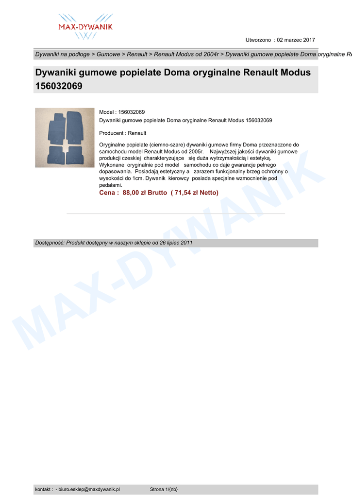 Dywaniki gumowe popielate Doma oryginalne Renault Modus