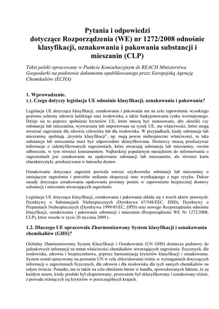 Pytania i odpowiedzi dotyczące Rozporządzenia (WE) nr 1272/2008 odnośnie klasyfikacji, oznakowania i pakowania substancji i mieszanin (CLP) Tekst polski opracowany w Punkcie Konsultacyjnym ds REACH Ministerstwa Gospodarki na podstawie dokumentu opublikowanego przez Europejską Agencję Chemikaliów (ECHA) 1. Wprowadzenie. 1.1. Czego dotyczy legislacja UE odnośnie klasyfikacji, oznakowania i pakowania? Legislacja UE dotycząca klasyfikacji, oznakowania i pakowania ma na celu zapewnienie wysokiego poziomu ochrony zdrowia ludzkiego oraz środowiska, a także funkcjonowania rynku wewnętrznego. Dzieje się to poprzez spełnienie kryteriów UE, które muszą być zastosowane, aby określić czy substancja lub mieszanina, wytwarzana lub importowana na rynek UE, ma właściwości, które mogą stwarzać zagrożenie dla zdrowia człowieka lub dla środowiska. W przypadkach, kiedy substancje lub mieszaniny spełniają „kryteria klasyfikacji”, np. mają pewne niebezpieczne właściwości, to taka substancja lub mieszanina musi być odpowiednio sklasyfikowana. Dostawcy muszą przekazywać informacje o zidentyfikowanych zagrożeniach, które stwarzają substancje lub mieszaniny, swoim odbiorcom, w tym również konsumentom. Najbardziej popularnym narzędziem do informowania o zagrożeniach jest oznakowanie na opakowaniu substancji lub mieszaninie, ale również karta charakterystyki, przekazywana w łańcuchu dostaw. Oznakowanie dotyczące zagrożeń pozwala ostrzec użytkownika substancji lub mieszaniny o istniejącym zagrożeniu i potrzebie unikania ekspozycji oraz wynikającego z tego ryzyku. Dalsze zasady dotyczące oznakowania opakowania powinny pomóc w zapewnieniu bezpiecznej dostawy substancji i mieszanin stwarzających zagrożenie. Legislacja UE dotycząca klasyfikacji, oznakowania i pakowania składa się z trzech aktów prawnych: Dyrektywy o Substancjach Niebezpiecznych (Dyrektywa 67/548/EEC, DSD), Dyrektywy o Preparatach Niebezpiecznych (Dyrektywa 1999/45/EC, DPD) oraz nowego Rozporządzenia odnośnie klasyfikacji, oznakowania i pakowania substancji i mieszanin (Rozporządzenie WE Nr 1272/2008, CLP), które weszło w życie 20 stycznia 2009 r. 1.2. Dlaczego UE opracowała Zharmonizowany System klasyfikacji i oznakowania chemikaliów (GHS)? Globalny Zharmonizowany System Klasyfikacji i Oznakowania (UN GHS) dostarcza podstawy do jednakowych informacji na temat właściwości chemikaliów stwarzających zagrożenia: fizycznych, dla środowiska, zdrowia i bezpieczeństwa, poprzez harmonizację kryteriów klasyfikacji i oznakowania. System został opracowany na poziomie UN w celu zlikwidowania różnic w wymaganiach dotyczących informacji o zagrożeniach fizycznych, dla zdrowia i dla środowiska dla tych samych chemikaliów na całym świecie. Ponadto, ma to także na celu obniżenie barier w handlu, spowodowanych faktem, że za każdym razem, kiedy produkt był eksportowany, przeważnie był sklasyfikowany i oznakowany różnie, z powodu różniących się kryteriów w poszczególnych krajach. Pełne informacje dotyczące Globalnego Systemu Zharmonizowanego można znaleźć na stronie: http://www.unece.org/trans/danger/publi/ghs/histback_e.html. 1.3. Dlaczego UE pracuje nad nowym prawem odnośnie klasyfikacji, oznakowania i pakowania ? Podczas Światowego Szczytu Zrównoważonego Rozwoju w Johannesburgu w 2002 r., Komisja, kraje członkowskie UE i partnerzy z przemysłu i organizacji pozarządowych formalnie poparli zalecenia UE dotyczące wdrożenia GHS do prawa krajowego do końca roku 2008. Nowe rozporządzenie UE miało na celu obniżenie barier dla handlu, które były spowodowane przeklasyfikowaniem i ponownym oznakowaniem dla celów eksportu do krajów spoza UE. 1.4. Które kraje spoza UE wdrażają GHS? Poza UE wiele innych krajów, zgodziło się na wdrożenie GHS do prawa krajowego, w tym USA, Kanada, Nowa Zelandia, Brazylia, Chiny, Filipiny, Rosja, Japonia, Meksyk, Afryka Południowa i inne kraje afrykańskie. Kraje te są na różnym etapie wdrażania, niektóre już mają lub prawie mają na miejscu schemat wdrażania (np. UE, Japonia, Nowa Zelandia, Korea Południowa. Aby wdrożyć GHS, każdy kraj indywidualnie stosuje swoje specyficzne krajowe instrumenty prawne, np. ustawy szczególne ze względu na sektor lub standardy narodowe. W UE, UN GHS został zintegrowany z rozporządzeniem CLP, które weszło w życie 20 stycznia 2009 r. i ma bezpośrednie zastosowanie dla przemysłu. Dalsze informacje o etapie rozwoju wdrażania UN GHS w różnych krajach dostępne są na stronie UN ECE: http://www.unece.org/trans/danger/publi/ghs/implementation_e.html 1.5. Czy rozporządzenie CLP ułatwia handel pomiędzy UE a innymi krajami ? Tak, ułatwia. Eksporter będzie w stanie zastosować ten sam opis zagrożeń na etykiecie w swoim kraju oraz dla kraju, do którego eksportuje. Eksportując swój produkt, może on zaoszczędzić koszty ponownej klasyfikacji, związanej z koniecznością spełnienia różnych wymagań klasyfikacji i oznakowania w krajach, do których ten produkt jest eksportowany. Podobnie, dostawca spoza UE, który chce eksportować swoje substancje i mieszaniny na rynek UE, odniesie analogiczne korzyści. Główną motywacją do rozwoju UN GHS, było stworzenie systemu klasyfikacji, który pozwala na stworzenie światowego systemu informowania o zagrożeniach fizycznych, zagrożeniach dla środowiska, dla zdrowia i bezpieczeństwa, stwarzanych przez chemikalia. 2. Zakres 2.1. Co to jest klasyfikacja? Co to jest klasyfikacja zharmonizowana? Klasyfikacja substancji lub mieszaniny odzwierciedla rodzaj i stopień zagrożeń, jakie może stwarzać substancja lub mieszanina, np. jej potencjalne szkodliwe działanie na zdrowie człowieka lub środowisko. Szczegółowa klasyfikacja jest wyrażana poprzez znormalizowane deskryptory, np. “toksyczność ostra kategoria 1 (doustna)” lub “ciecze łatwopalne, kategoria 2”. Informacja jest przekazywana przez podanie zno